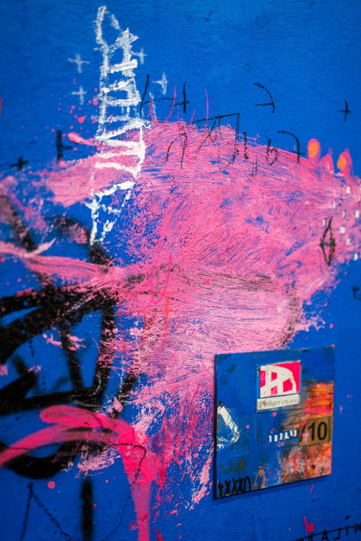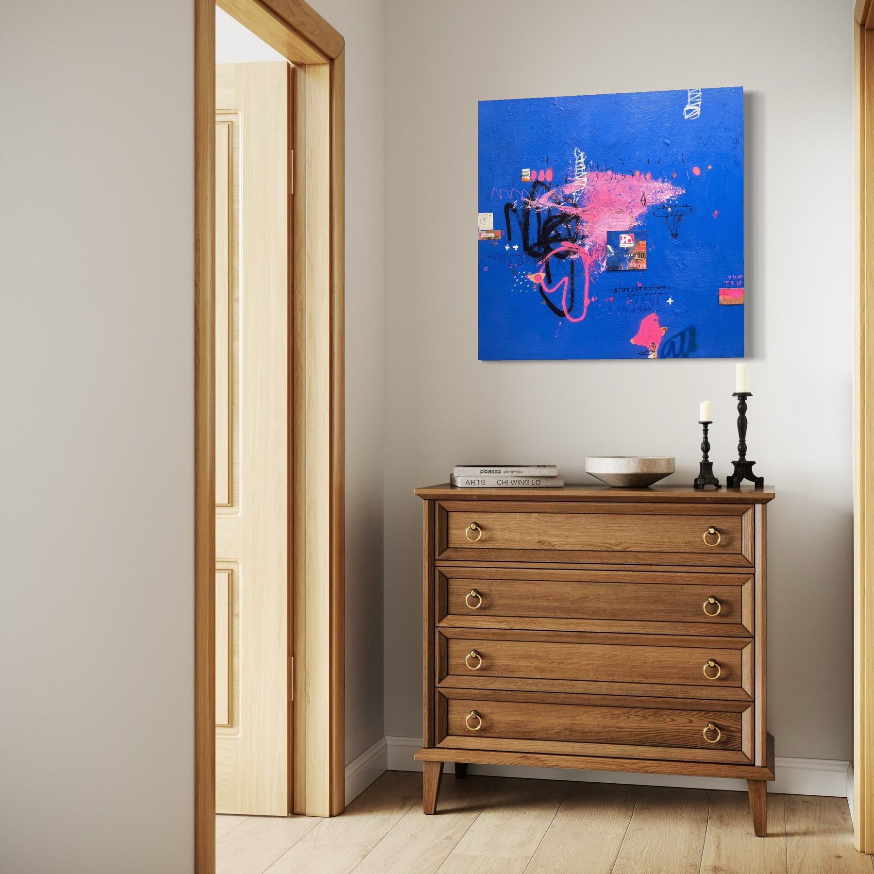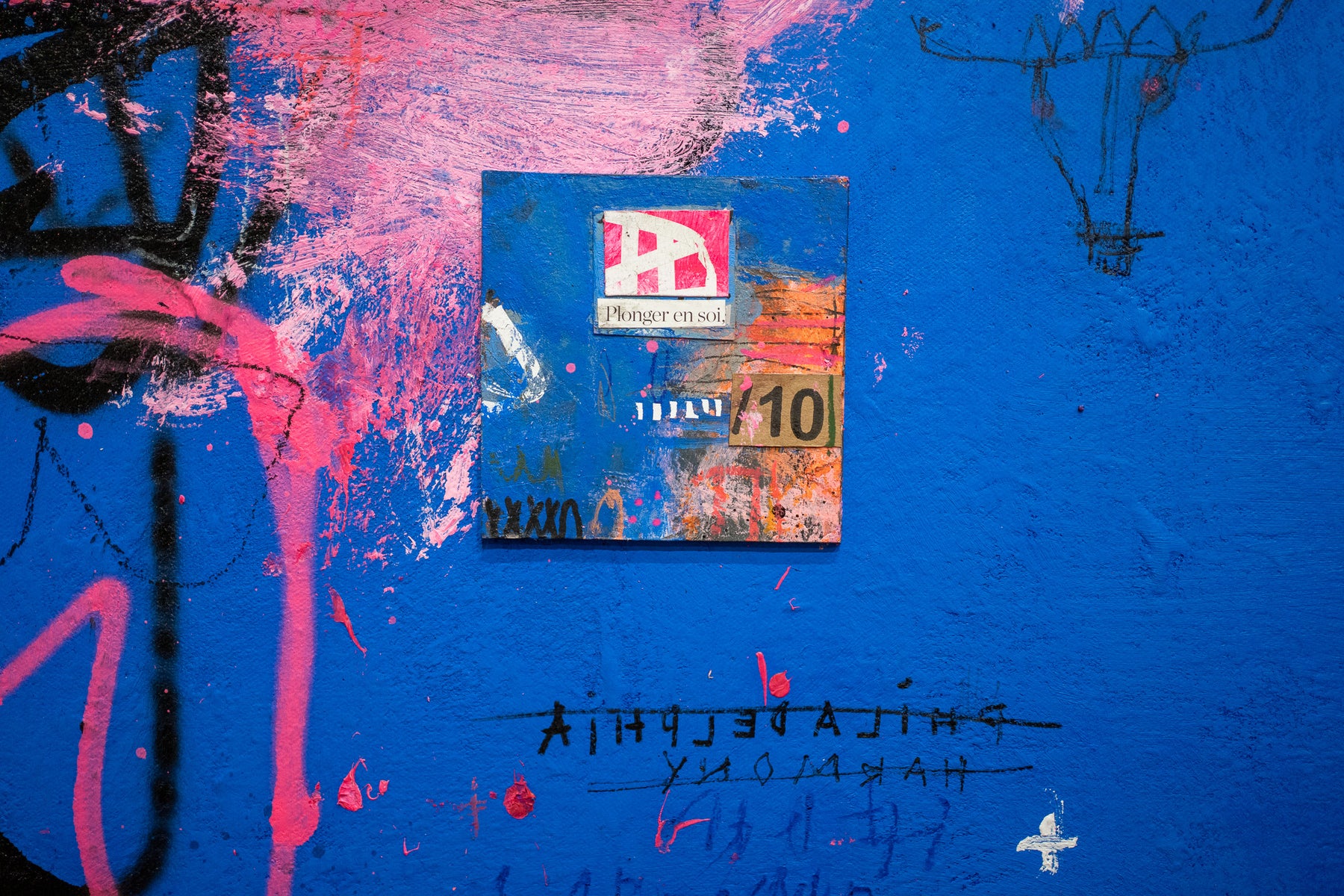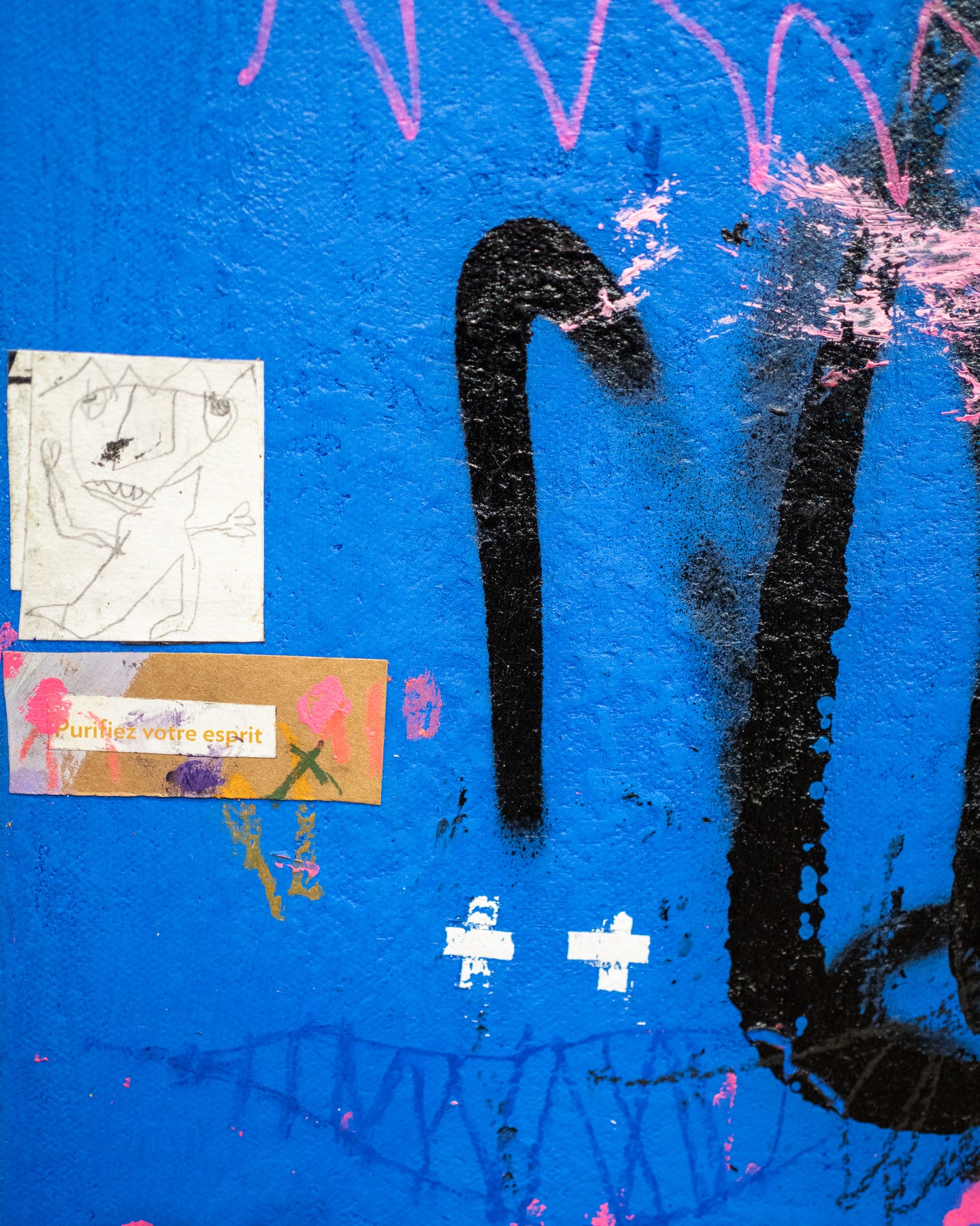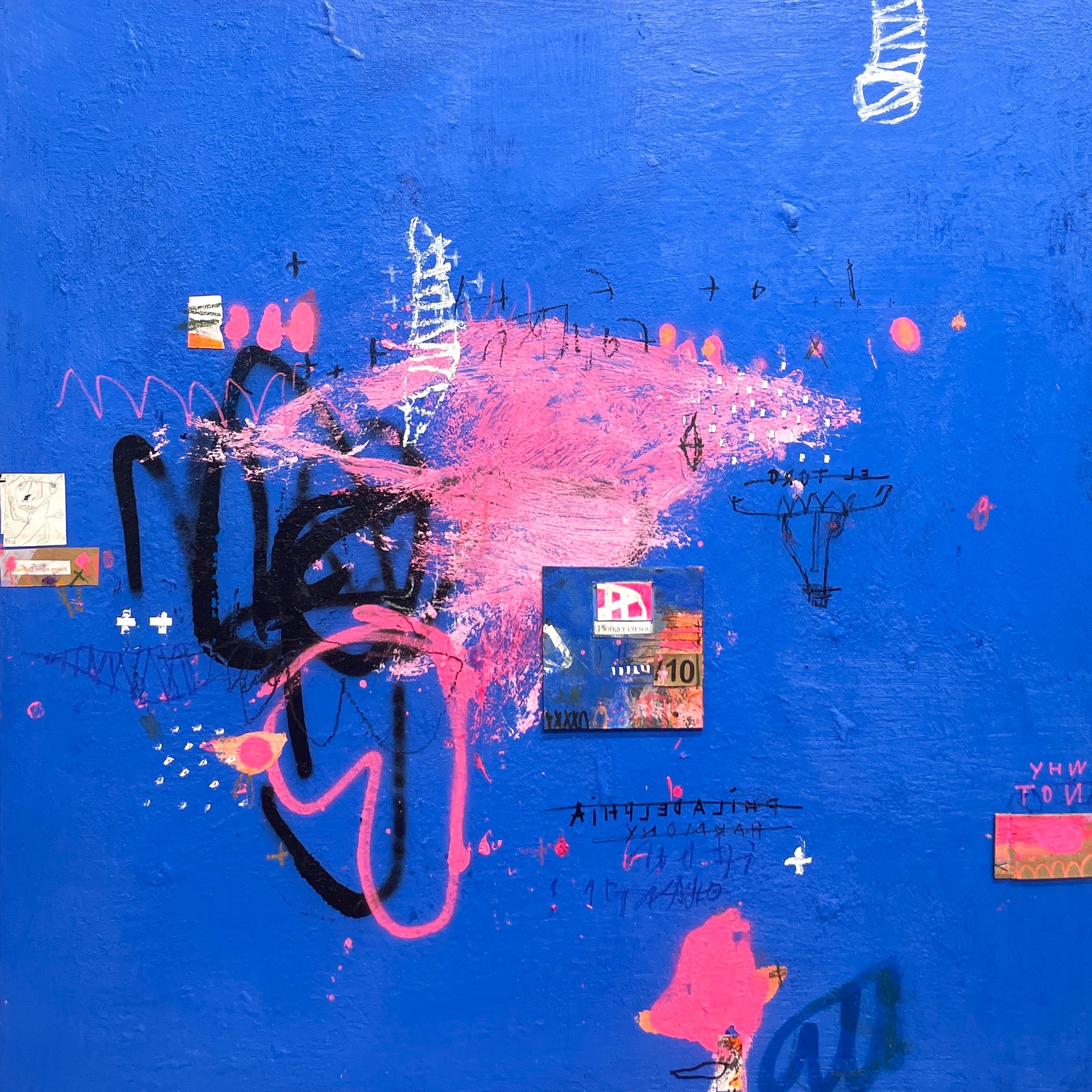- Acrylic paint, collage, graphite, pastel and spray paint on canvas