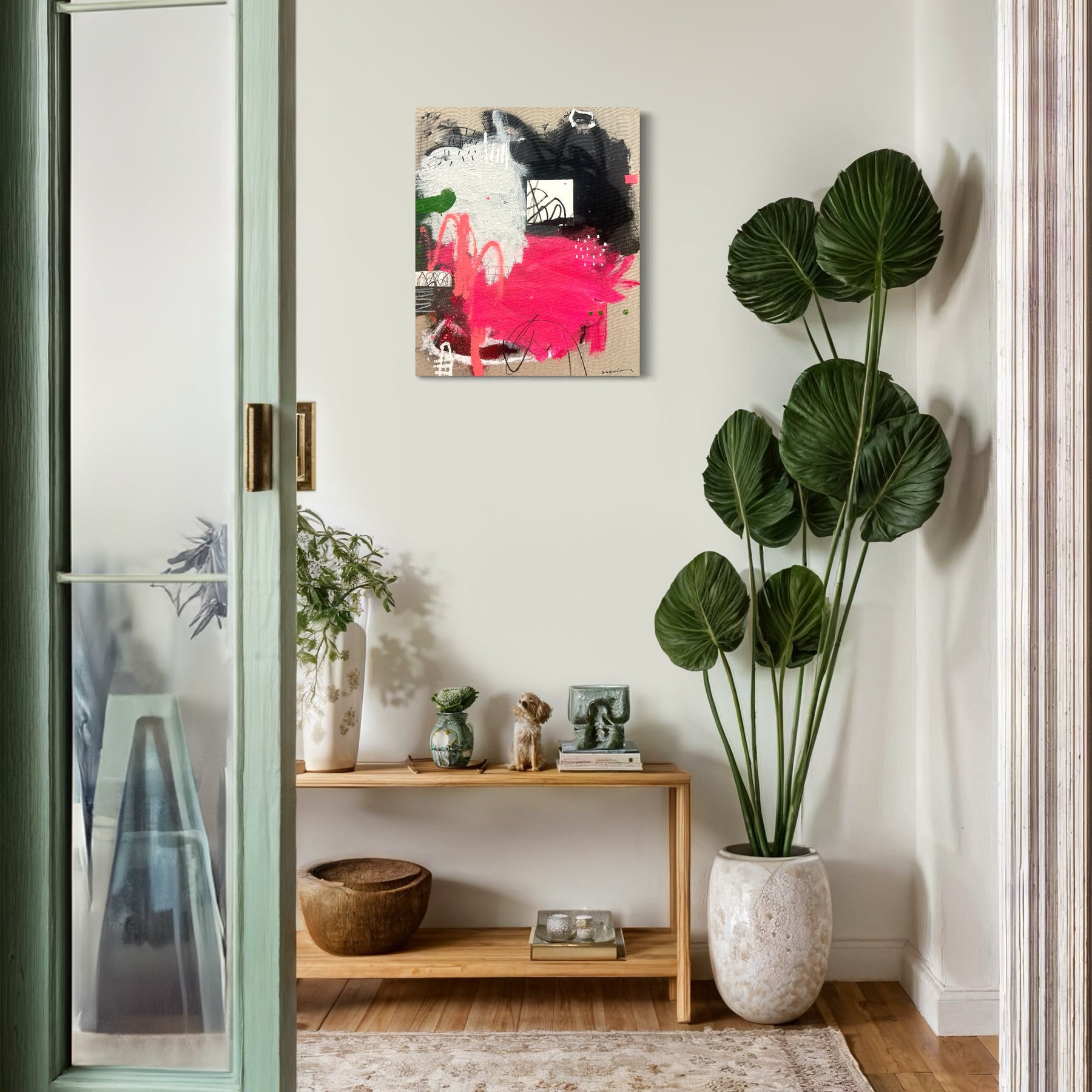 • Acrylic paint, collage, graphite, pastel and spray paint on canvas