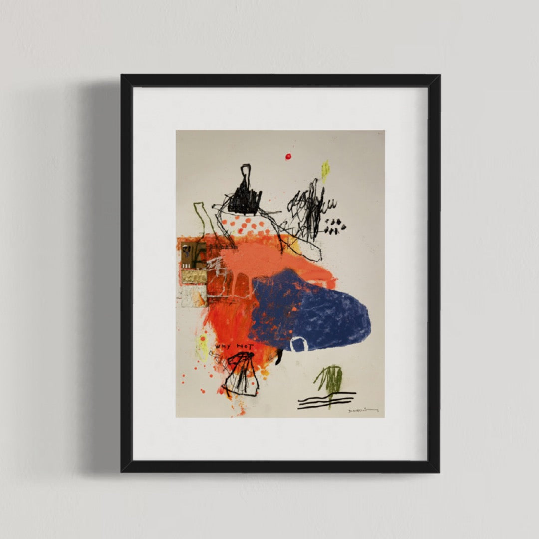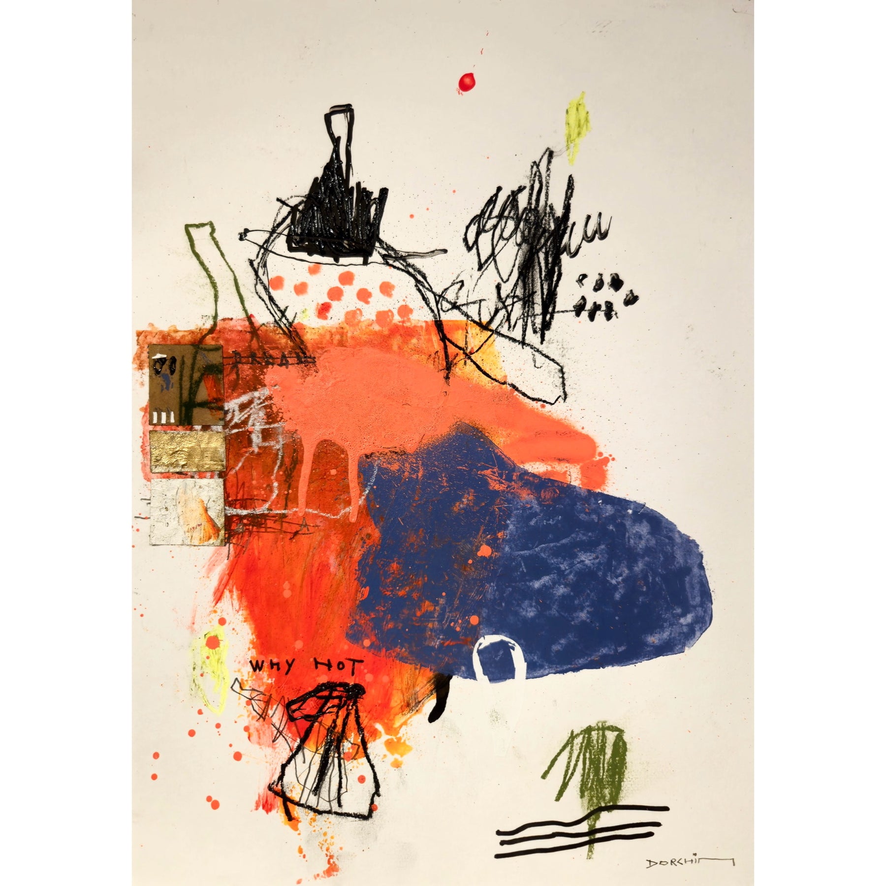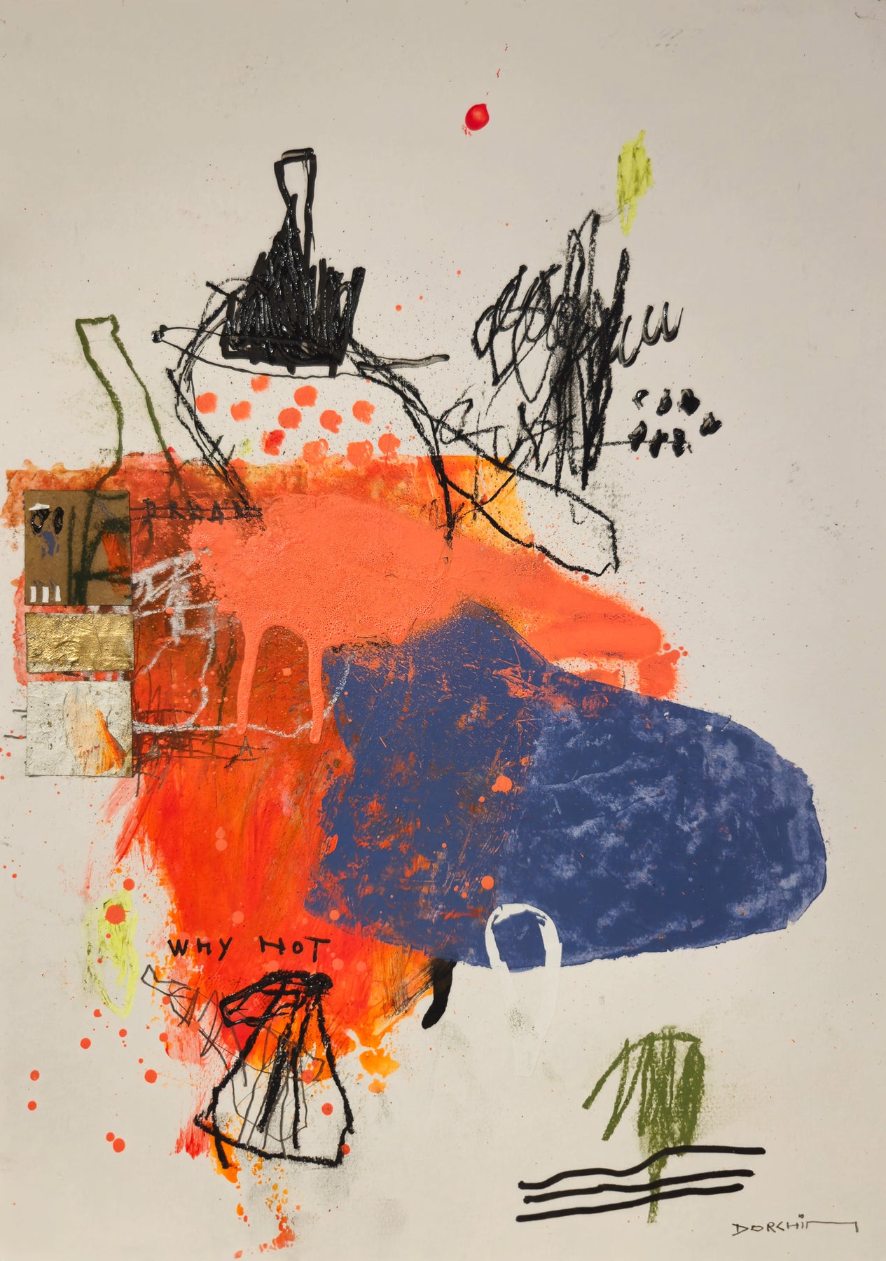 Abstract mixed media artwork on paper by Laurent Dorchin in black, pink, red, blue and white. Organic linework and minimal illustrations with collage and text elements.