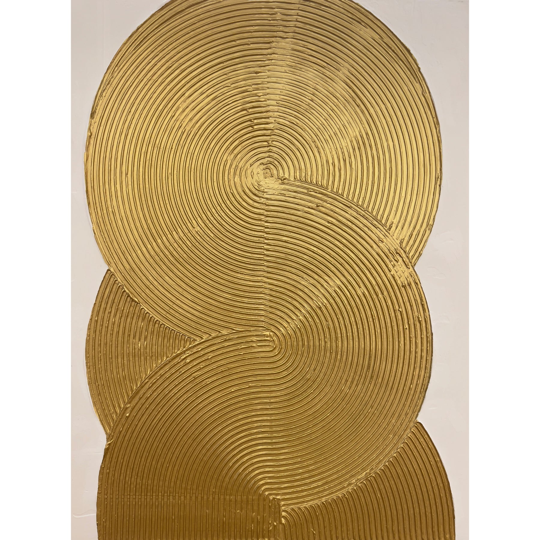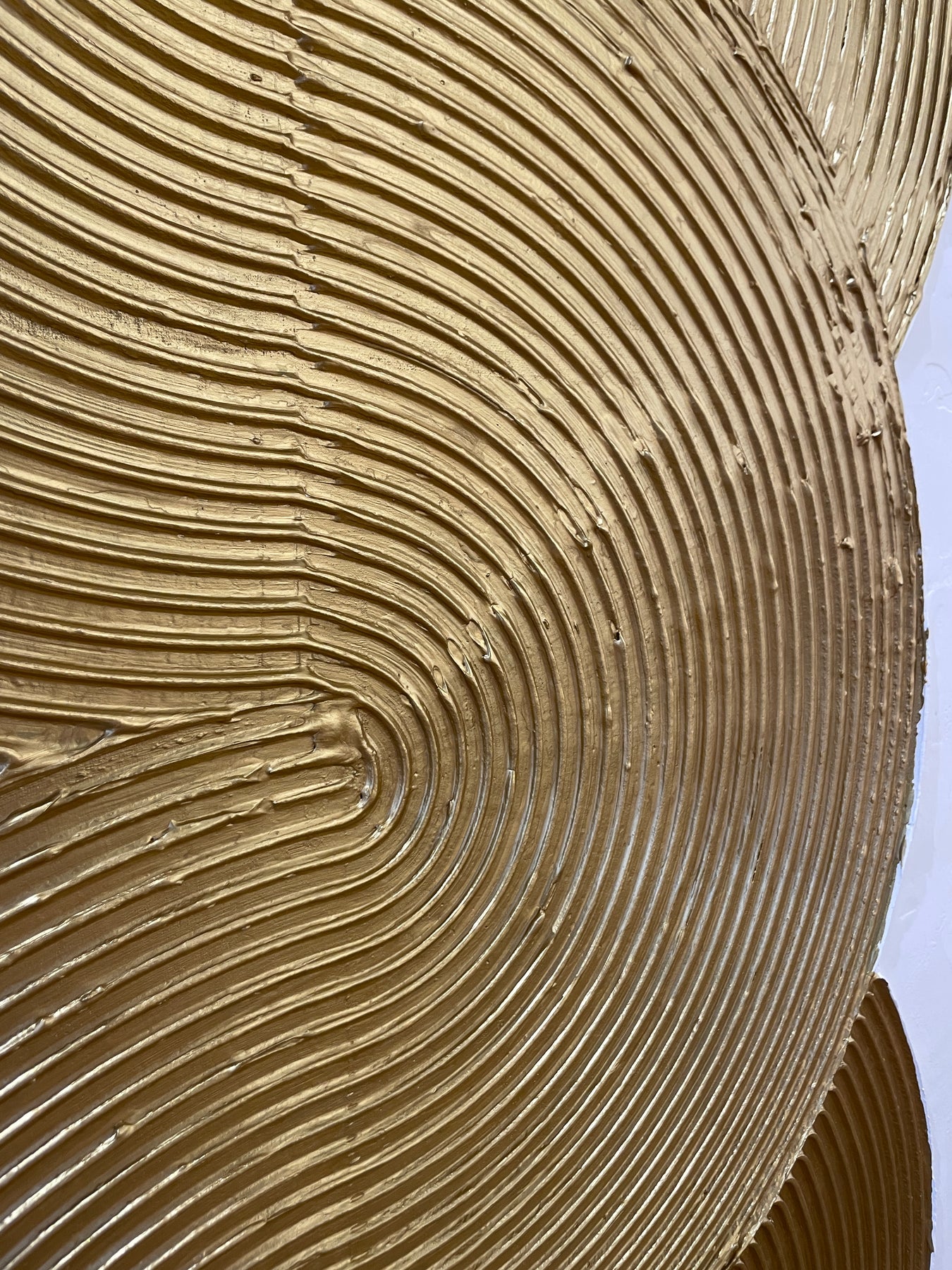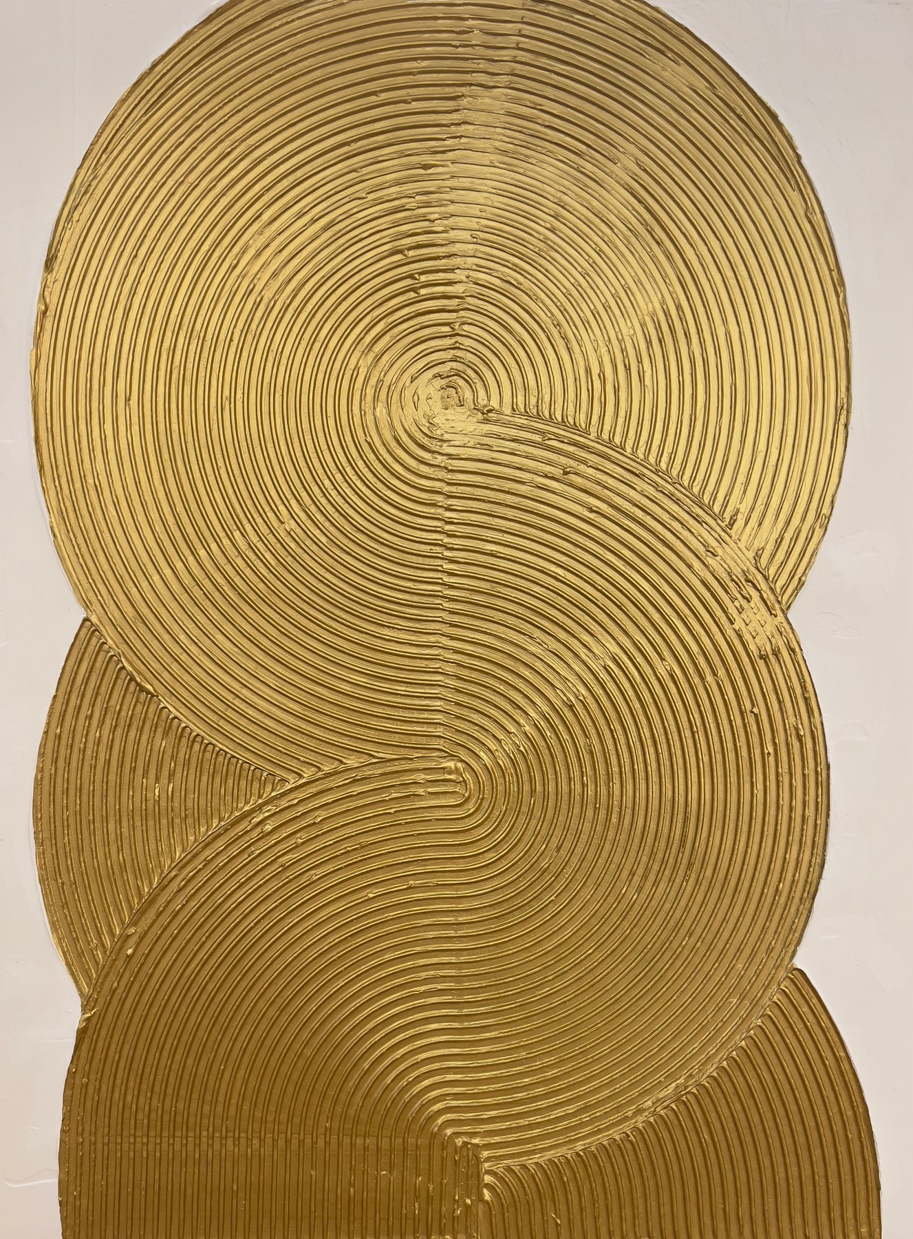 Continuity by Lee in Cerulean. Textured and geometric painting of overlapping gold circles on a white background.