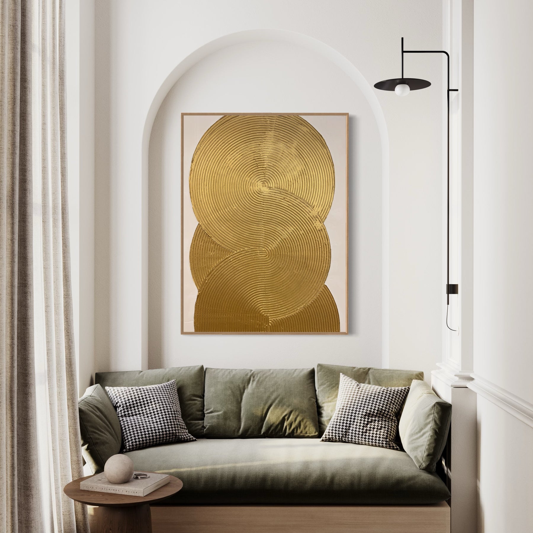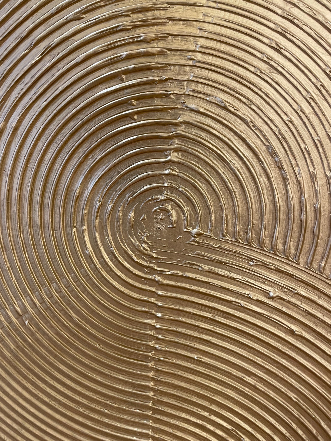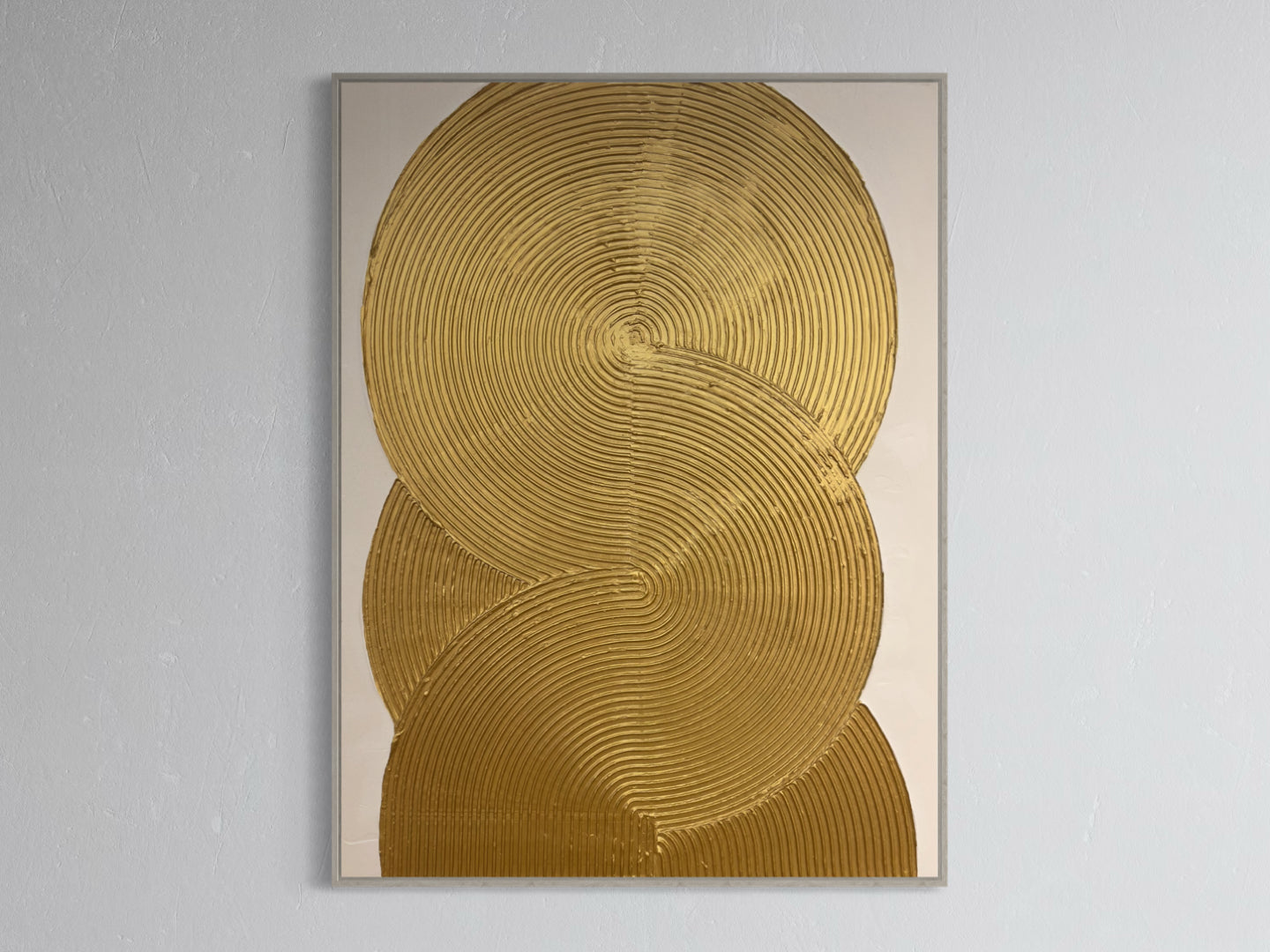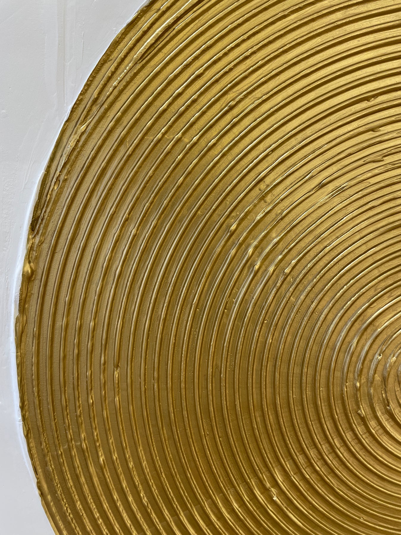 Continuity by Lee in Cerulean. Textured and geometric painting of overlapping gold circles on a white background.