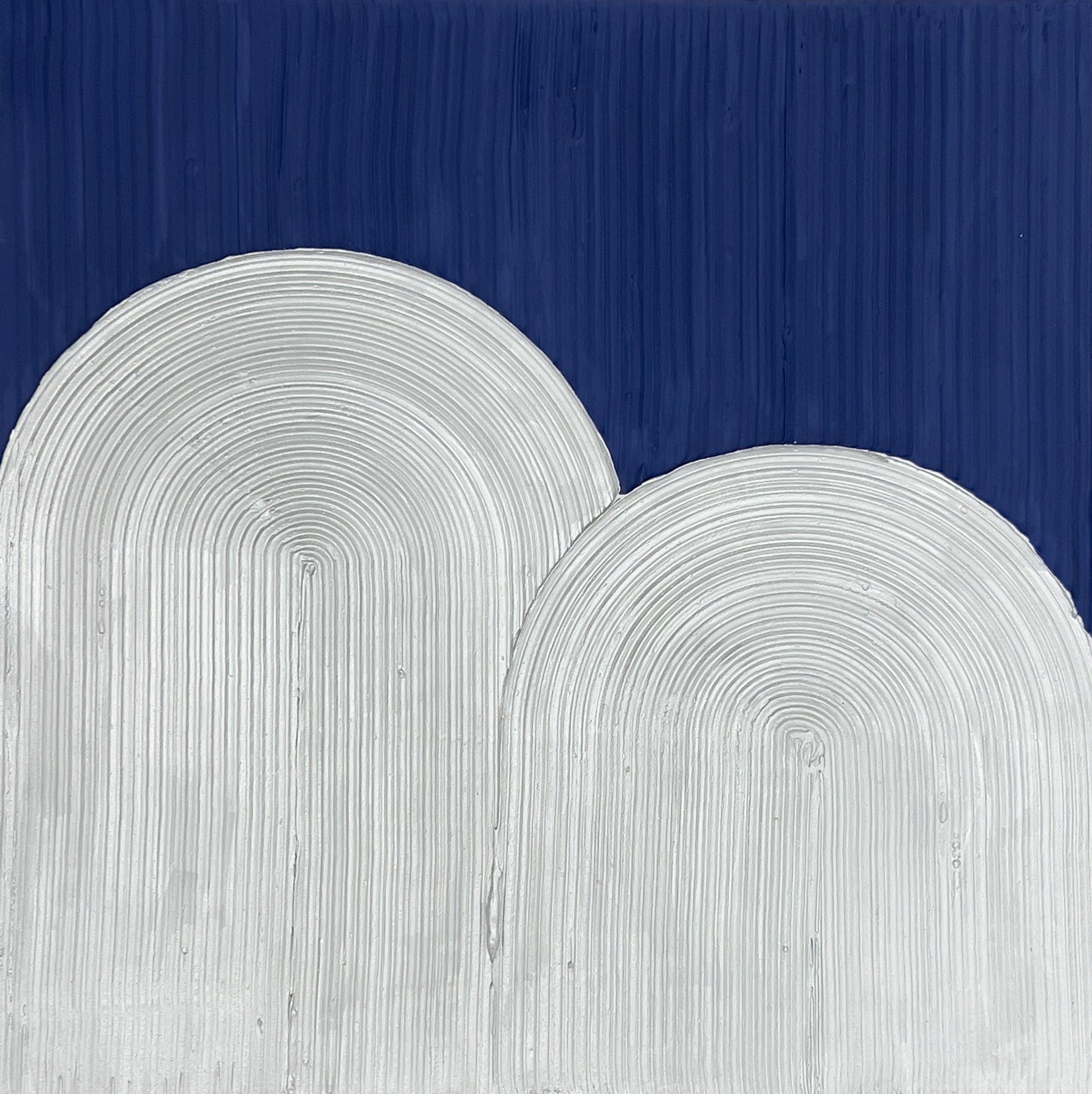 Jerilee, a Philadelphia-based artist working under the name ‘Lee in Cerulean’, creates striking minimalist pieces. For Lee, simple curves, asymmetry, and overlapping forms reflect the beautiful world around us—and find, within our surroundings, the continuity, serendipity, and at times mundane nature of everyday life. Deriving from the Japanese Wabi-Sabi philosophy’s embrace of imperfection, highly textural pieces show Lee’s freeform strokes, using a blend of joint compound, acrylic paint, and a myriad of other media. Under this philosophical orientation, ridges and built-up materials are a reminder that we continue to evolve, just as nature does.