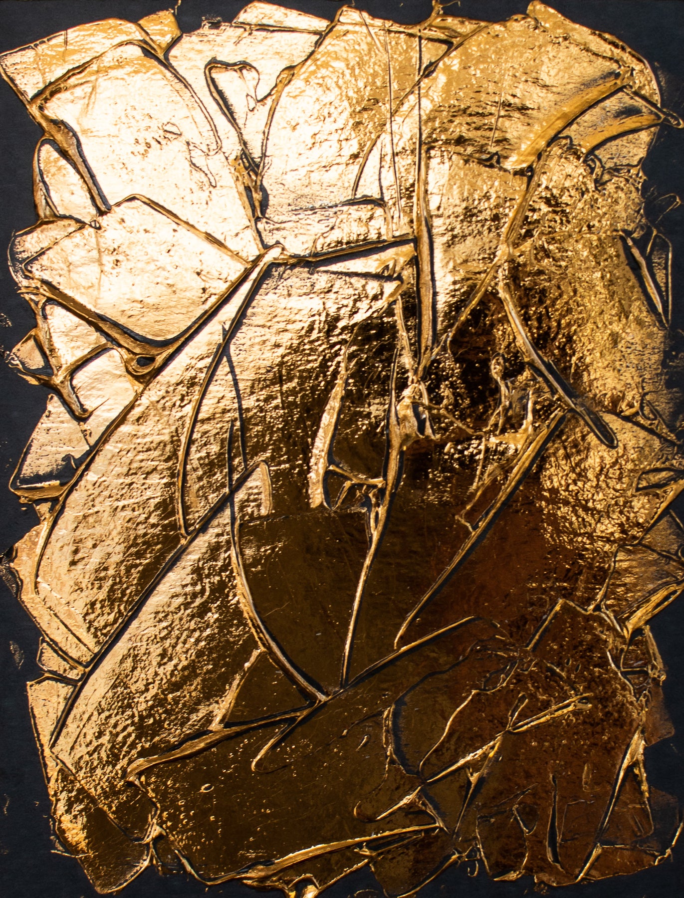 NYC based artist, M. Clark, creates light-reflecting works wherein the artist manipulates heat and pressure to fix metallic foil onto various surfaces -- there is no paint on her artworks, only gold, copper, or silver foil. Clark often uses a palette knife to help texturize her highly reflective, modern and minimalist works of art.