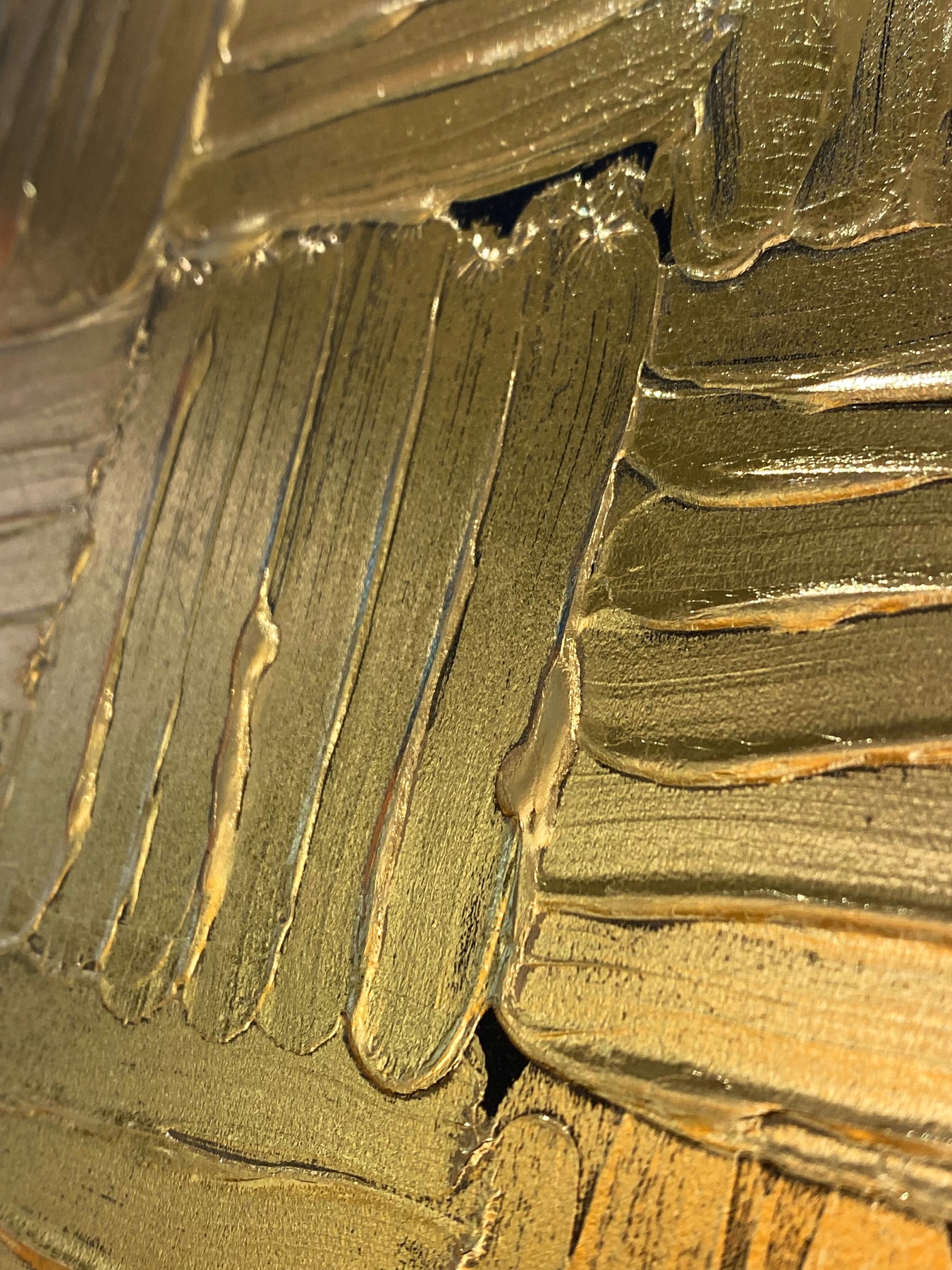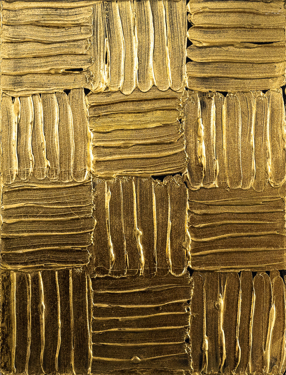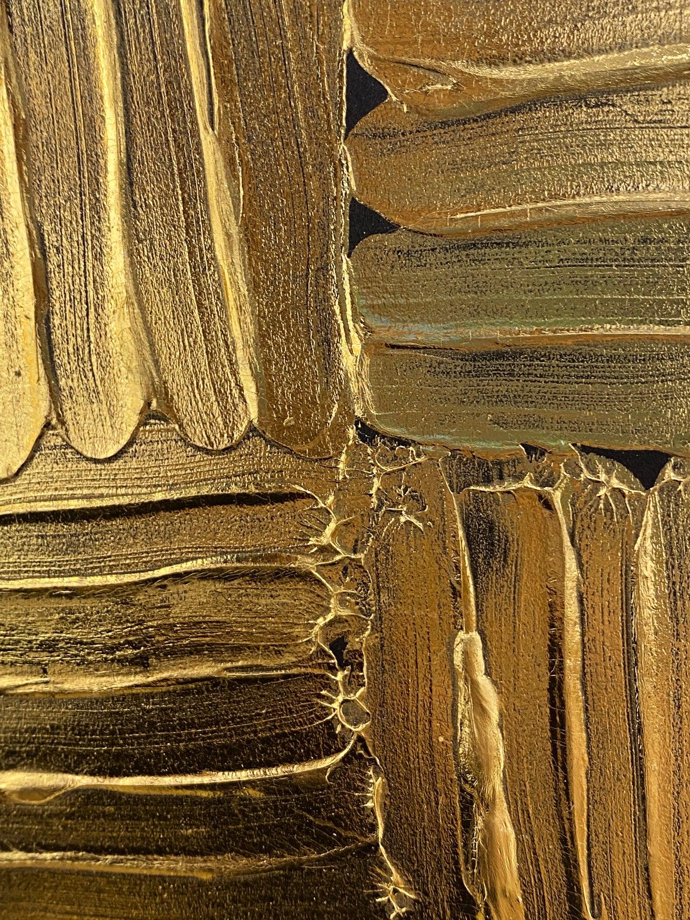 NYC based artist, M. Clark, creates light-reflecting works wherein the artist manipulates heat and pressure to fix metallic foil onto various surfaces -- there is no paint on her artworks, only gold, copper, or silver foil. Clark often uses a palette knife to help texturize her highly reflective, modern and minimalist works of art.