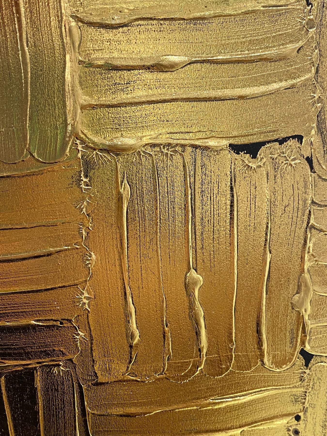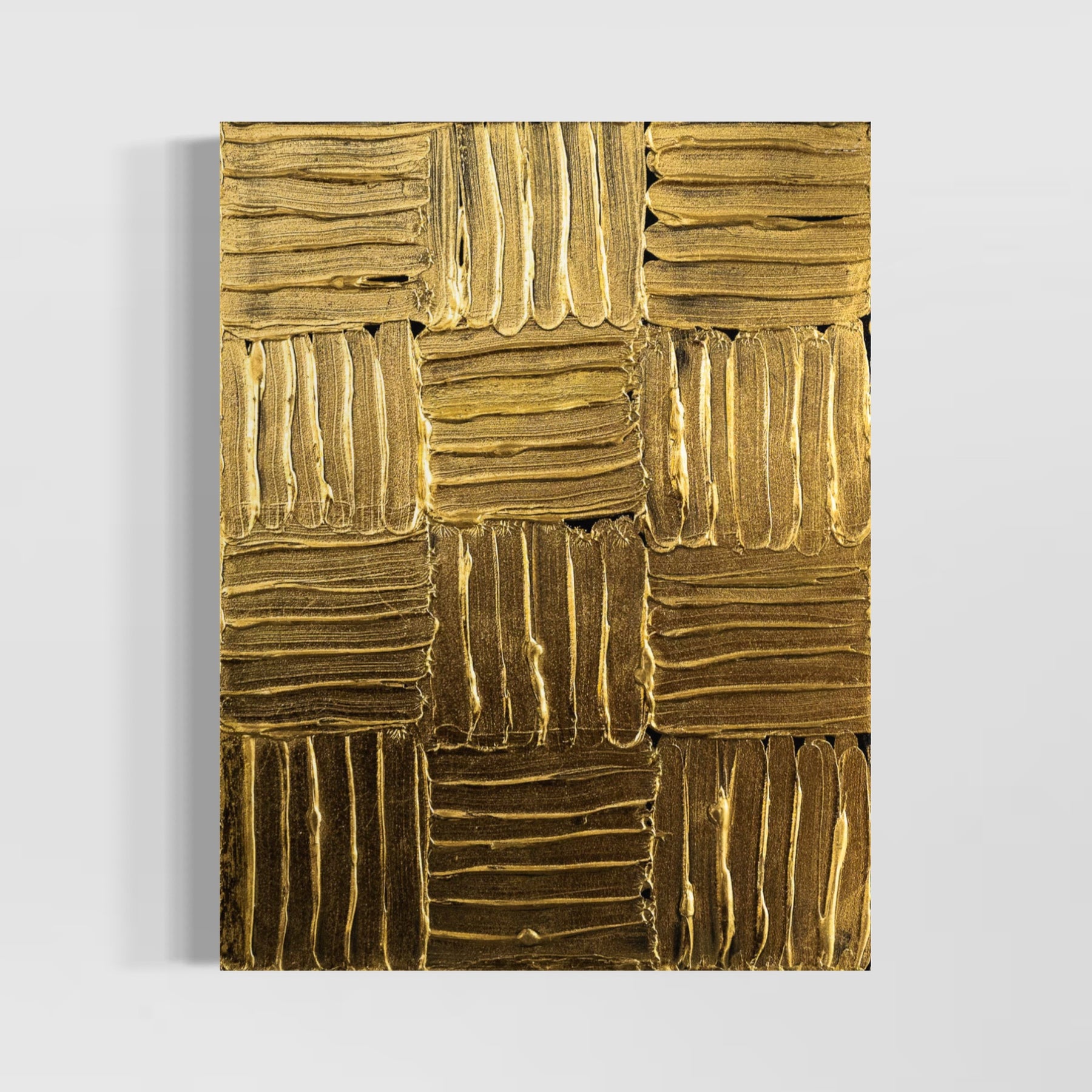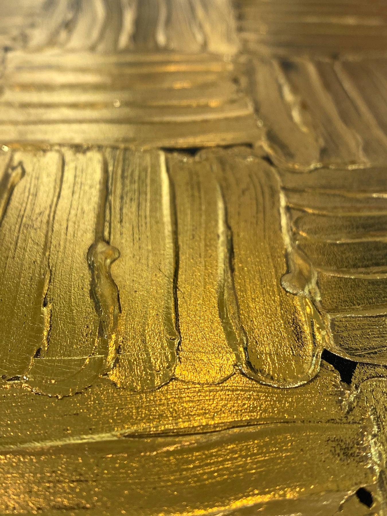 NYC based artist, M. Clark, creates light-reflecting works wherein the artist manipulates heat and pressure to fix metallic foil onto various surfaces -- there is no paint on her artworks, only gold, copper, or silver foil. Clark often uses a palette knife to help texturize her highly reflective, modern and minimalist works of art.