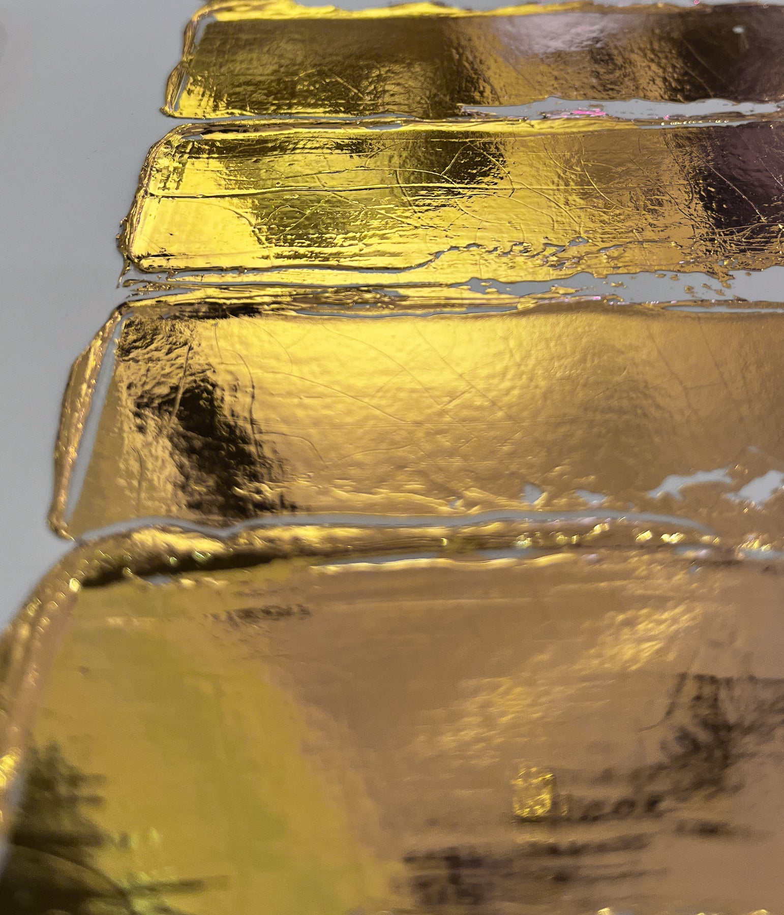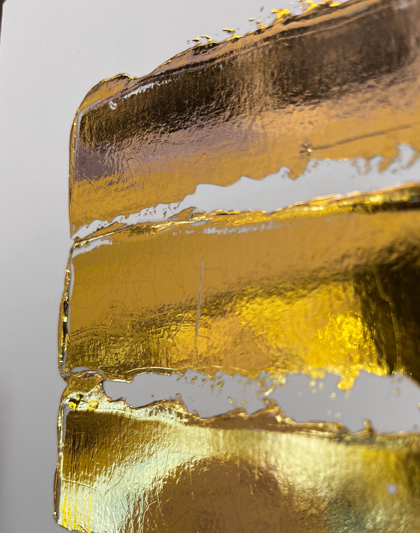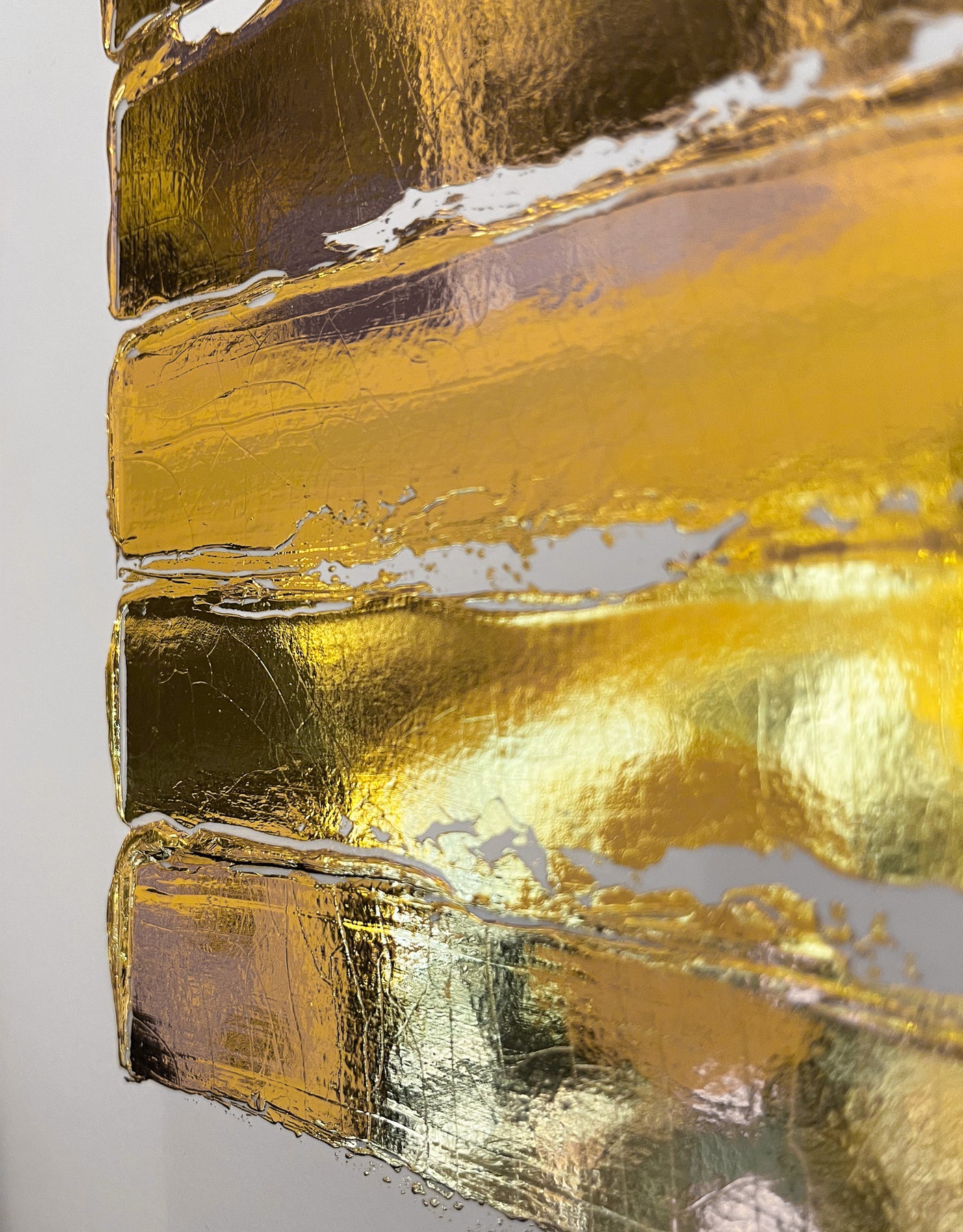 NYC based artist, M. Clark, creates light-reflecting works wherein the artist manipulates heat and pressure to fix metallic foil onto various surfaces -- there is no paint on her artworks, only gold, copper, or silver foil. Clark often uses a palette knife to help texturize her highly reflective, modern and minimalist works of art.