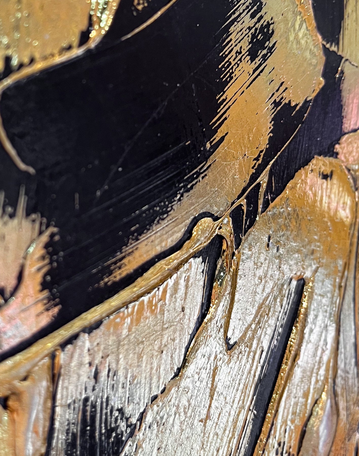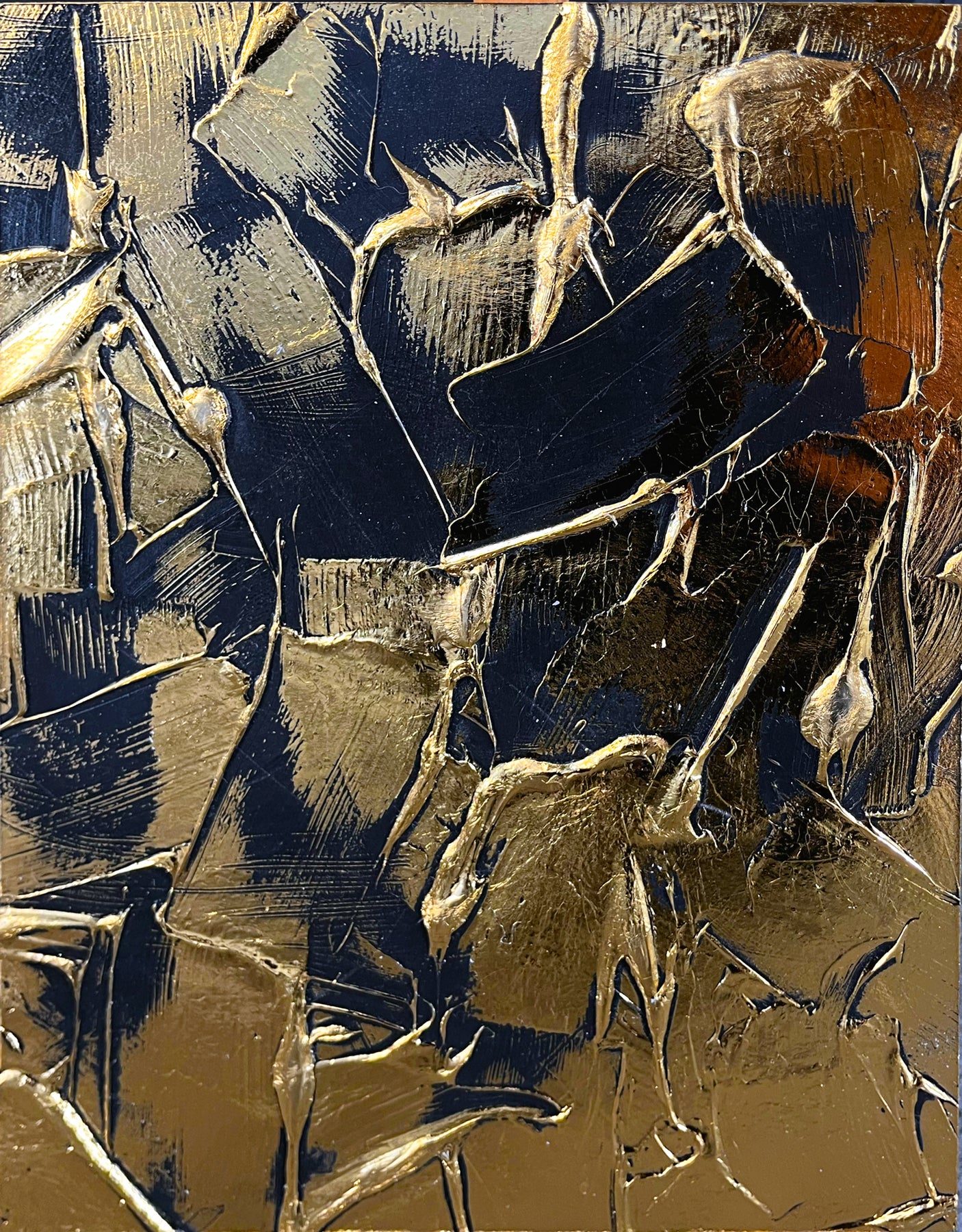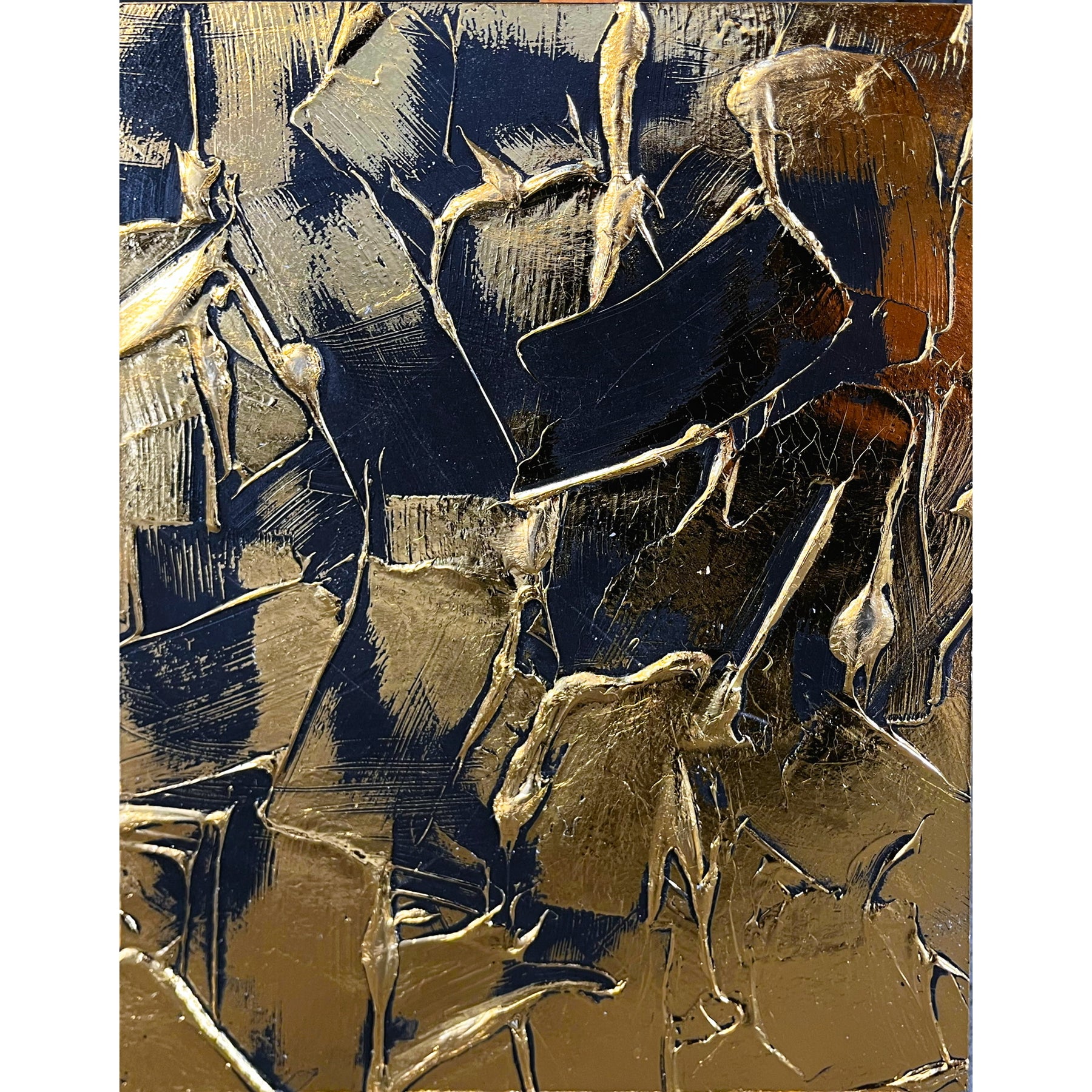 NYC based artist, M. Clark, creates light-reflecting works wherein the artist manipulates heat and pressure to fix metallic foil onto various surfaces -- there is no paint on her artworks, only gold, copper, or silver foil. Clark often uses a palette knife to help texturize her highly reflective, modern and minimalist works of art.