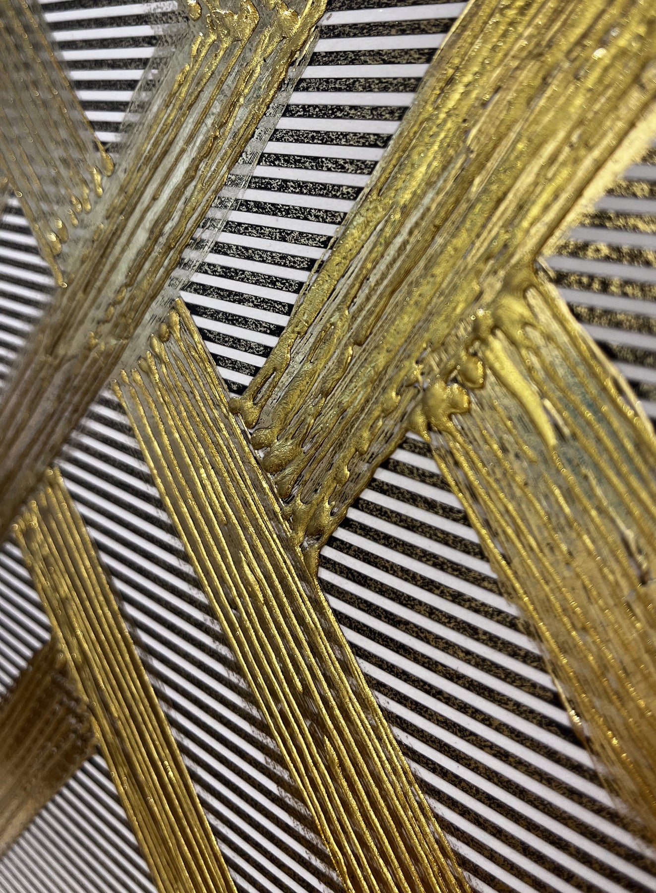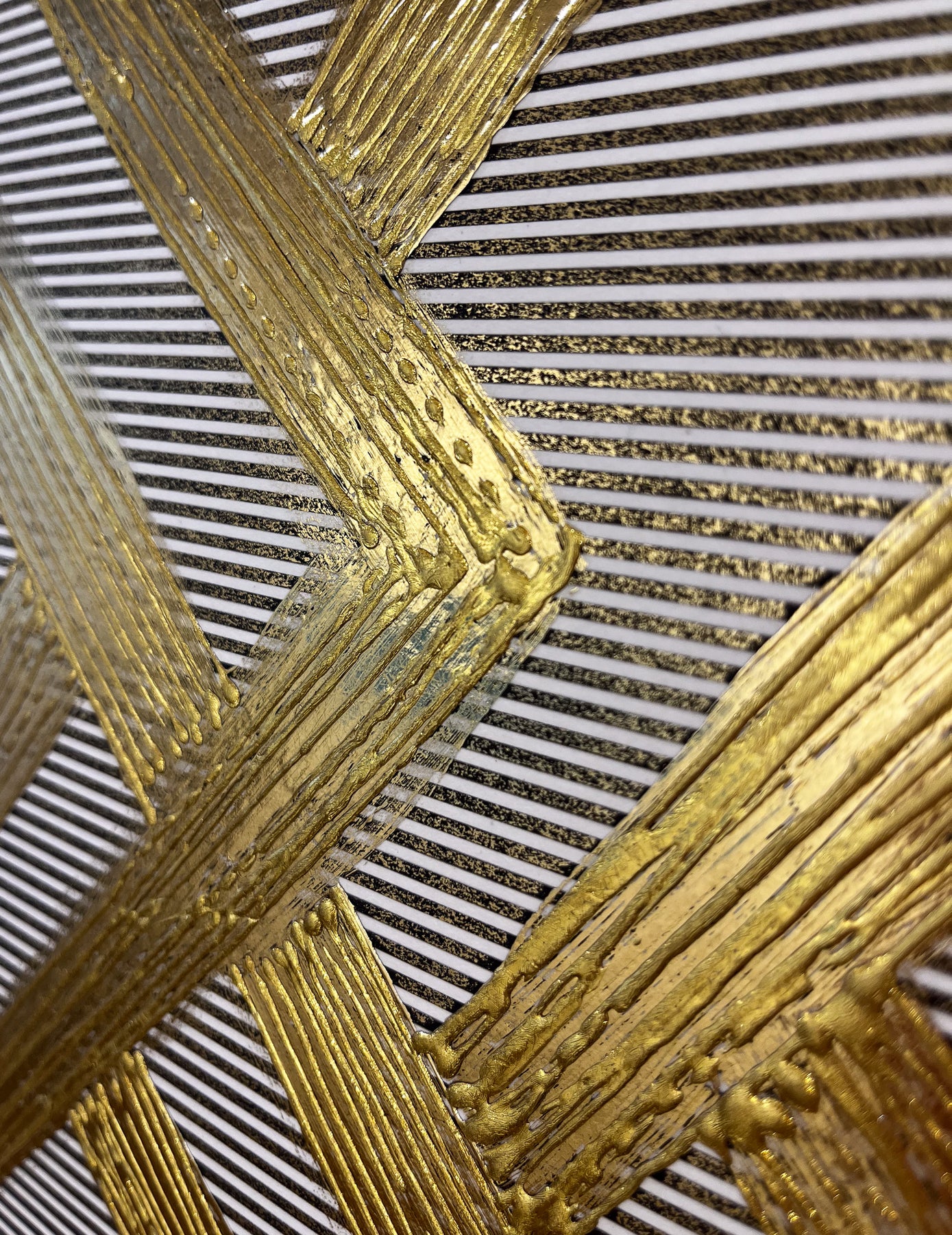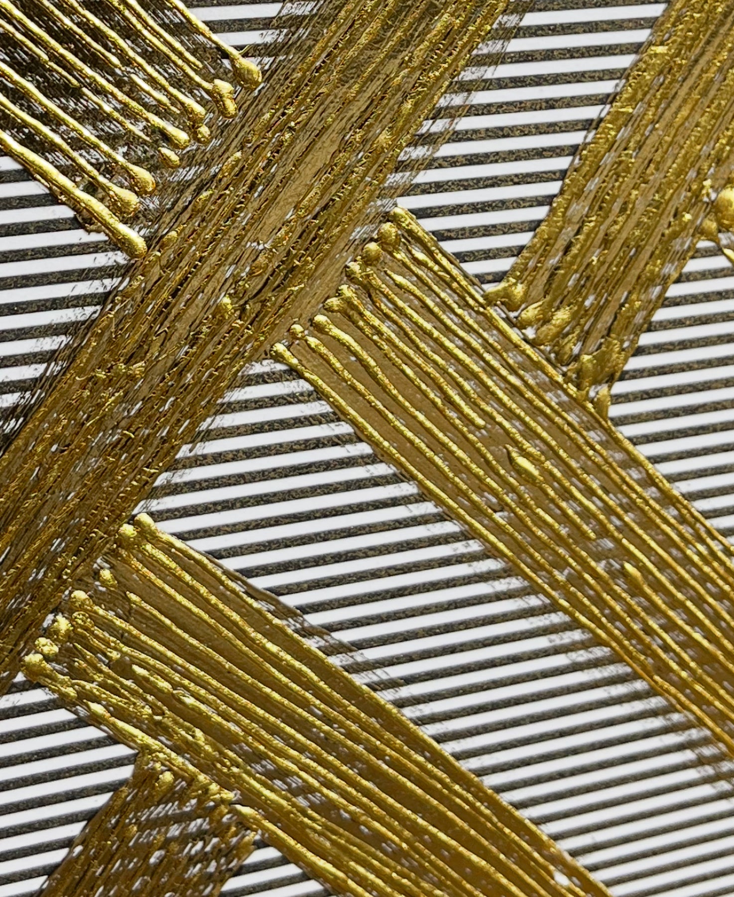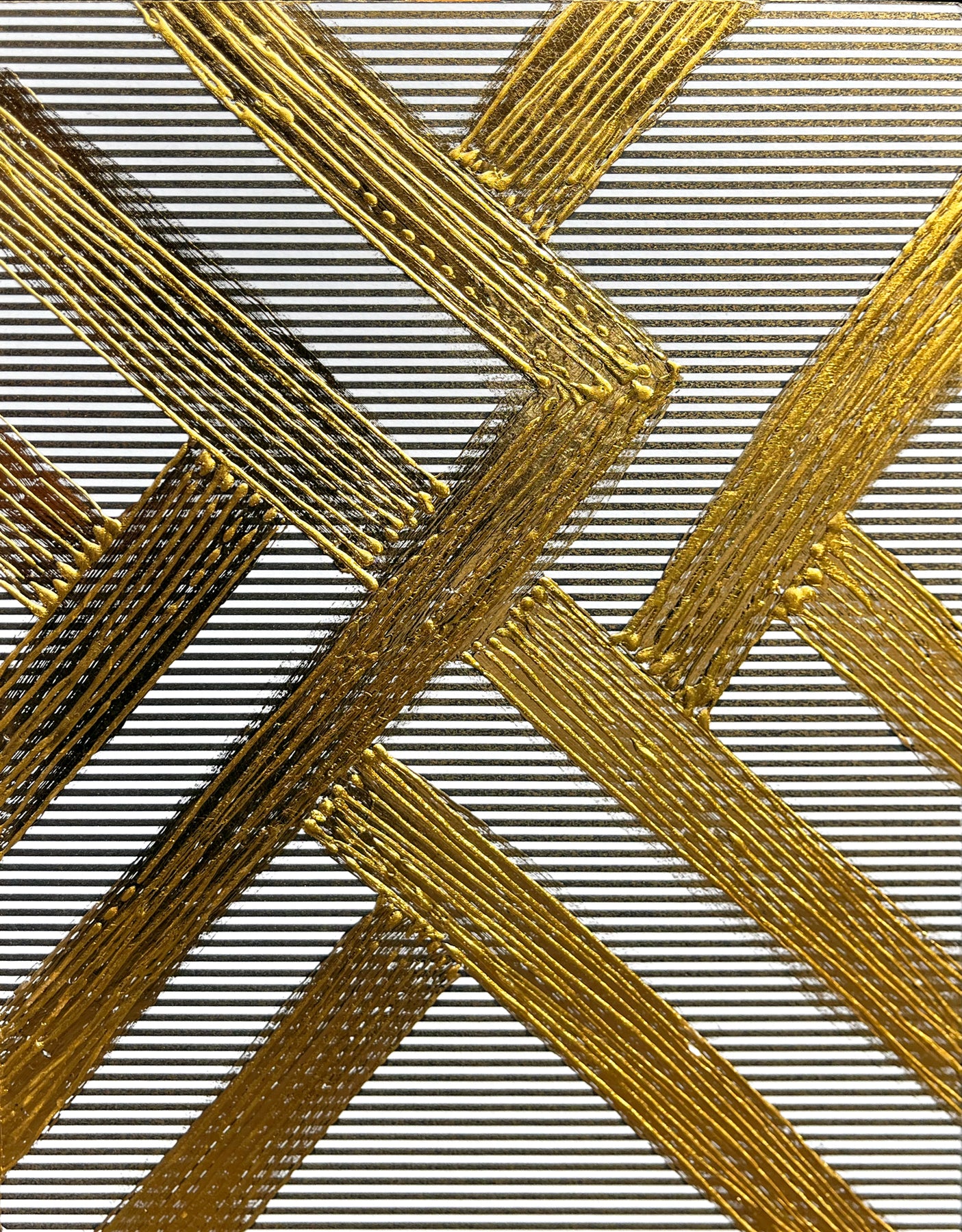 NYC based artist, M. Clark, creates light-reflecting works wherein the artist manipulates heat and pressure to fix metallic foil onto various surfaces -- there is no paint on her artworks, only gold, copper, or silver foil. Clark often uses a palette knife to help texturize her highly reflective, modern and minimalist works of art.