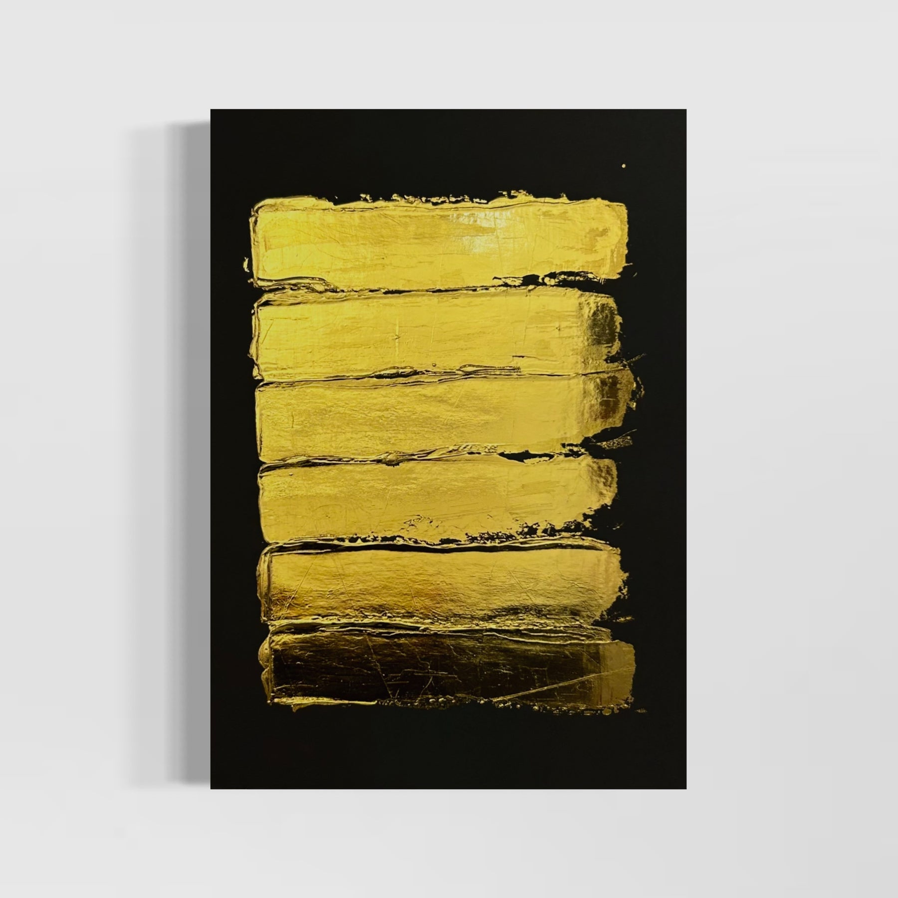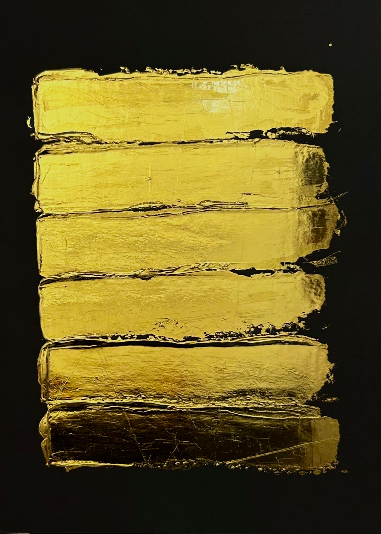 NYC based artist, M. Clark, creates light-reflecting works wherein the artist manipulates heat and pressure to fix metallic foil onto various surfaces -- there is no paint on her artworks, only gold, copper, or silver foil. Clark often uses a palette knife to help texturize her highly reflective, modern and minimalist works of art.