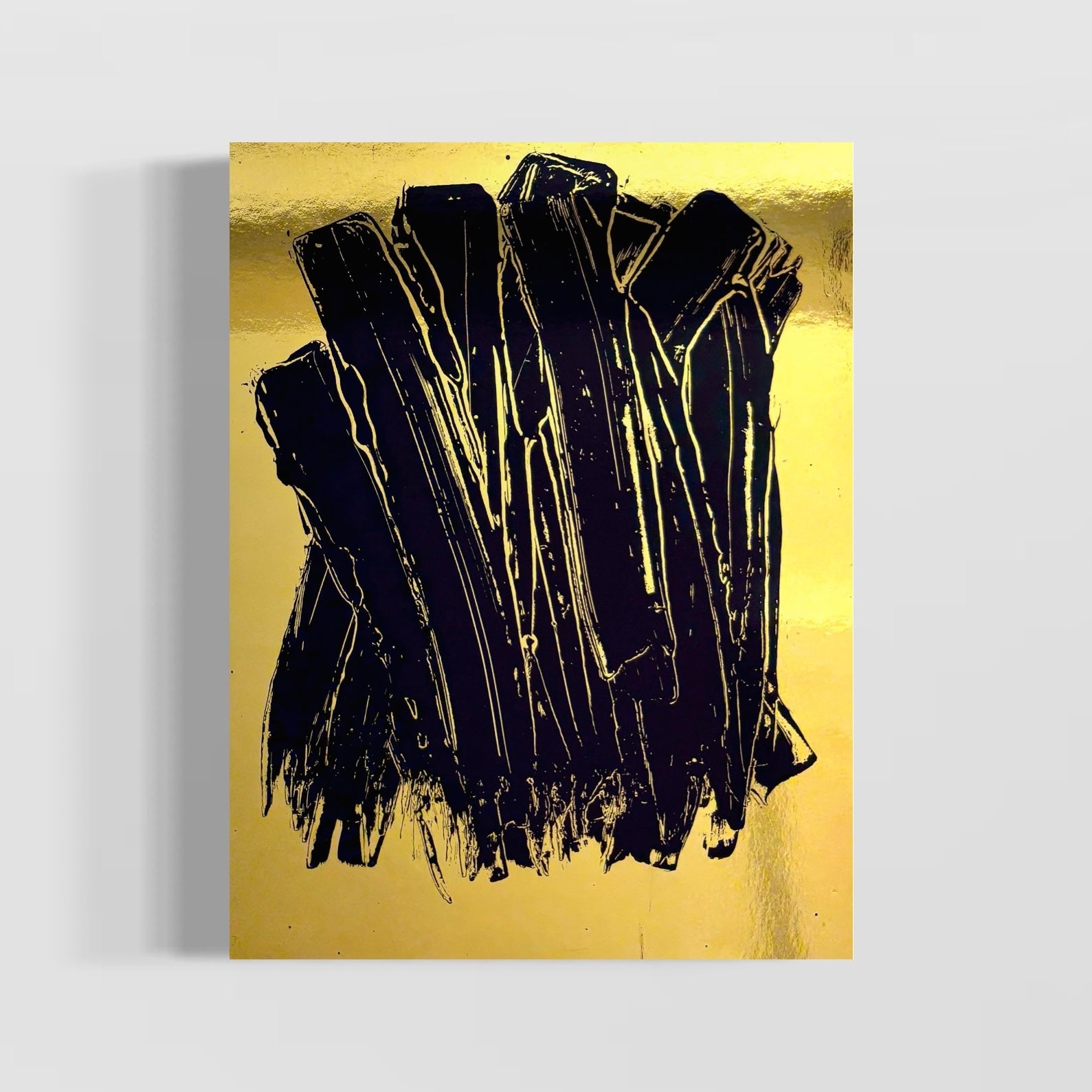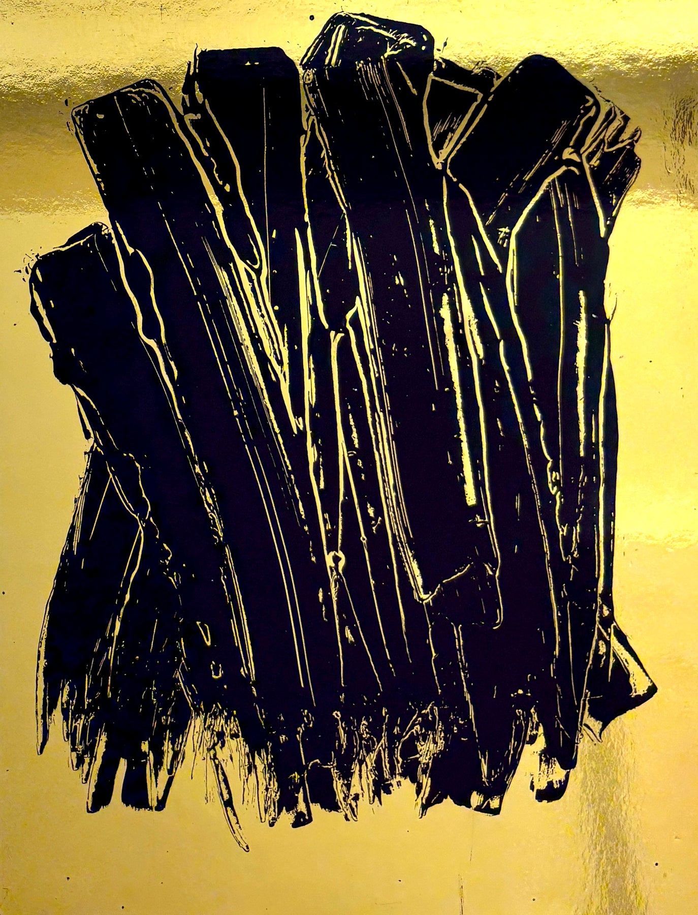 expressionistic long swatches of black paint vertically on shiny reflective smooth gold surface by artist m clark