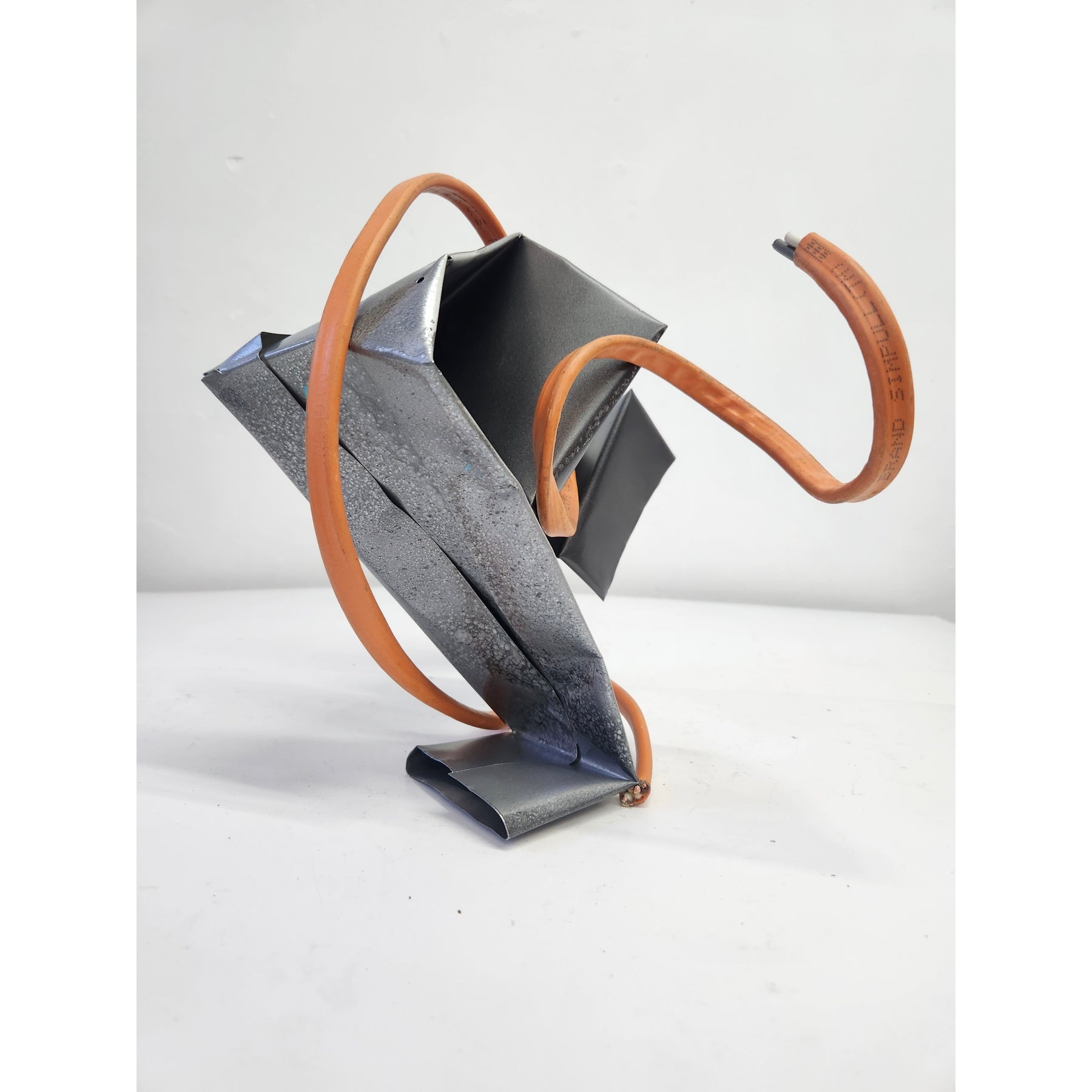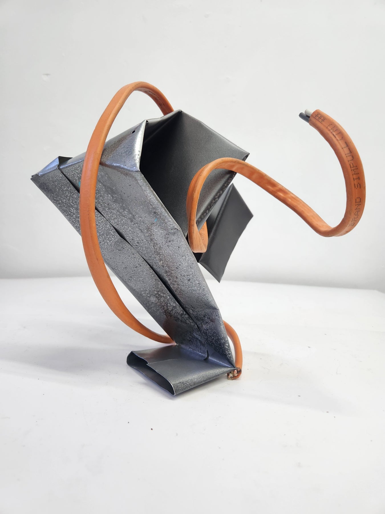 folded abstract piece of metal origami style with wire cable throughout orange and grey