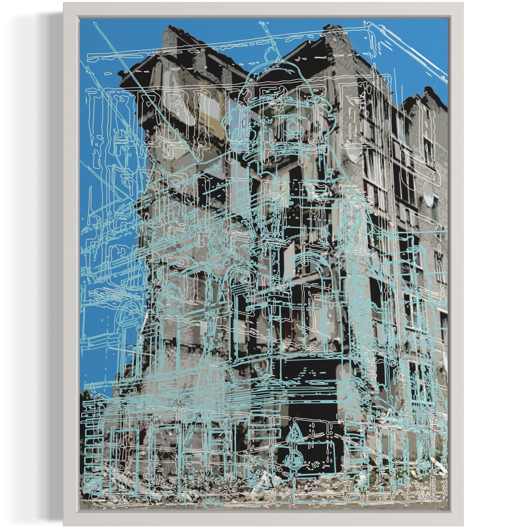 painting of cathedral in grey with blue sky and architectural doodle line drawing in light blue layered on top
