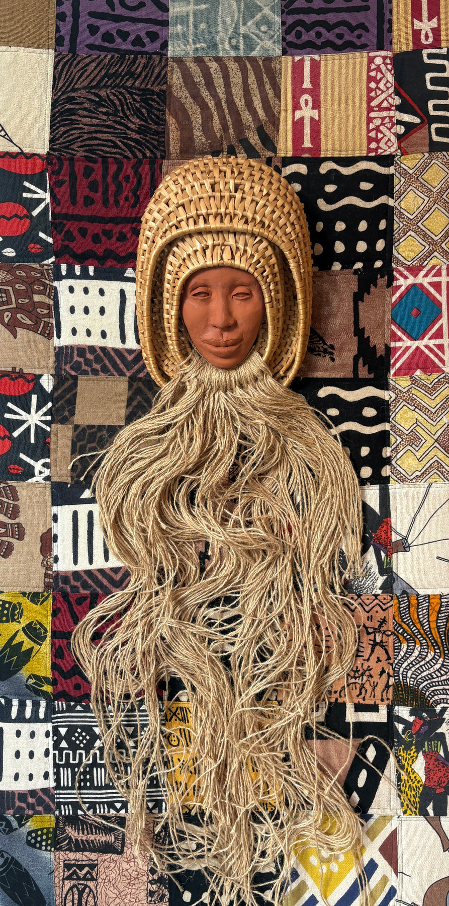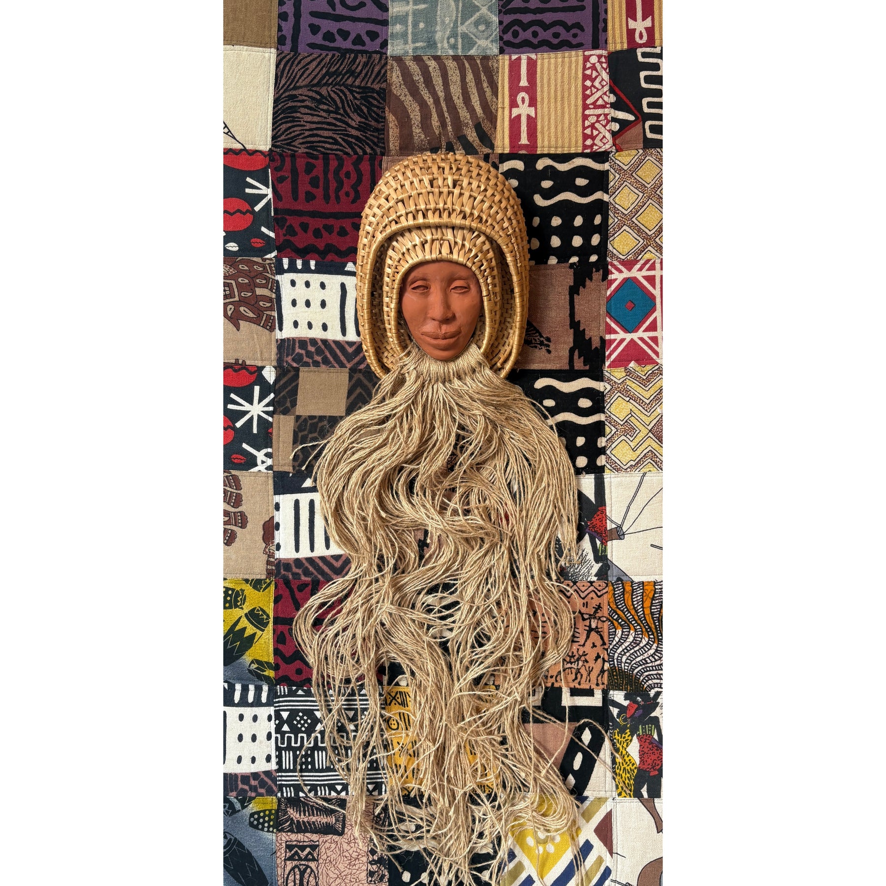 ceramic head portrait in woven basket and yarn coming out, against a background of quilted patterned fabric
