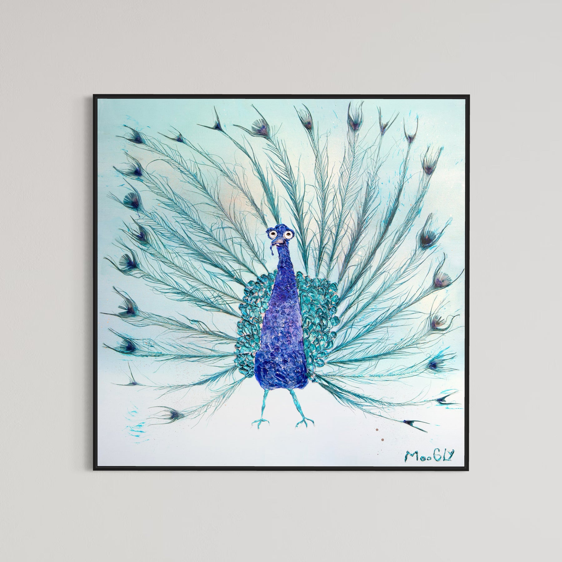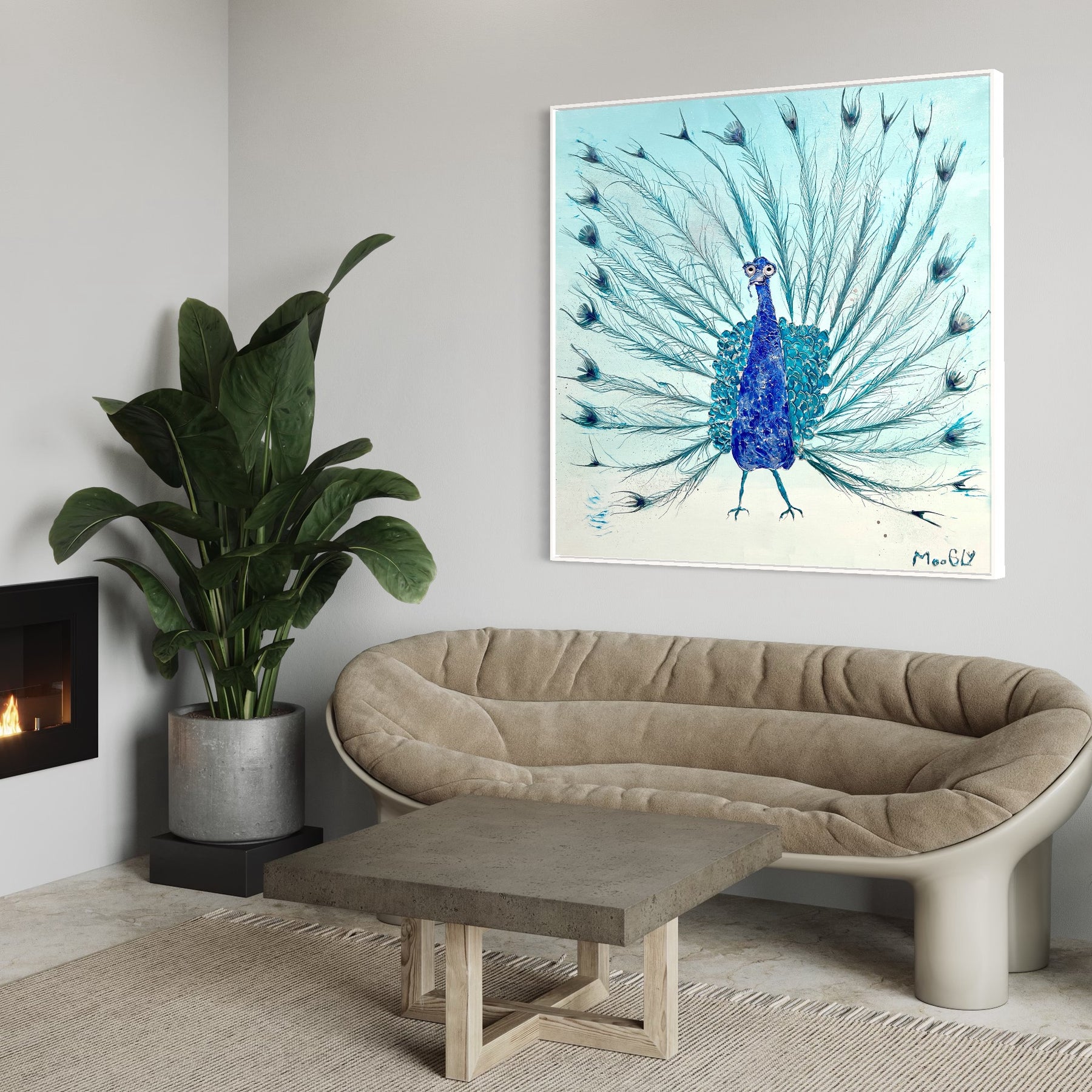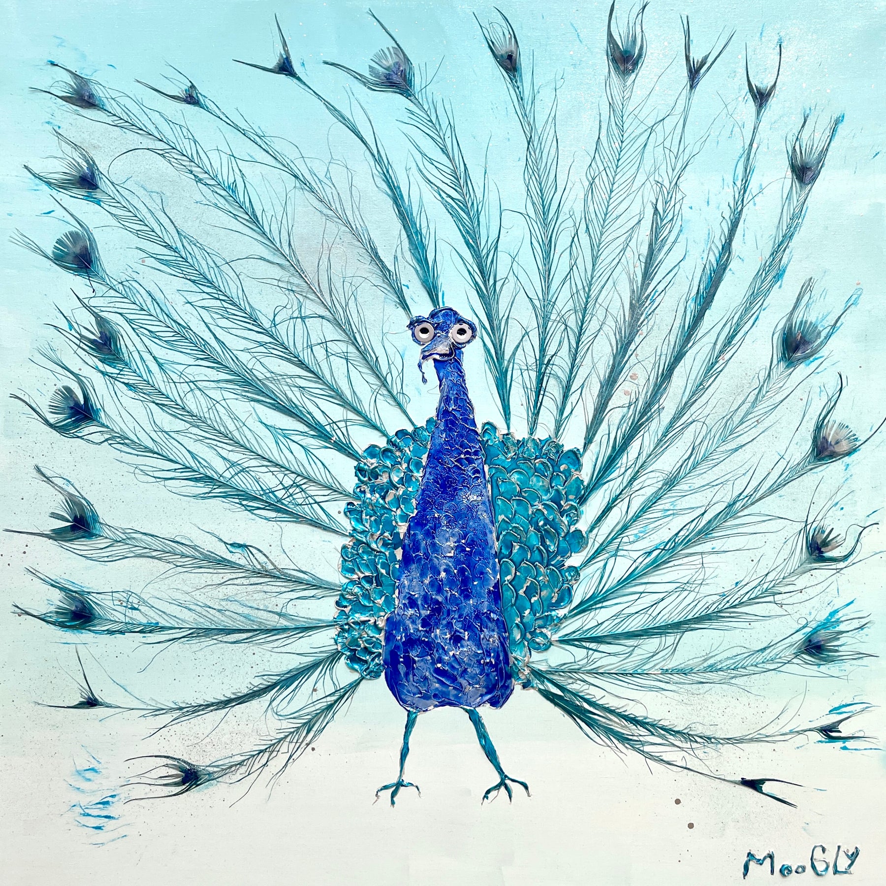 • Acrylic, resin, white peacock feathers, and washers on canvas