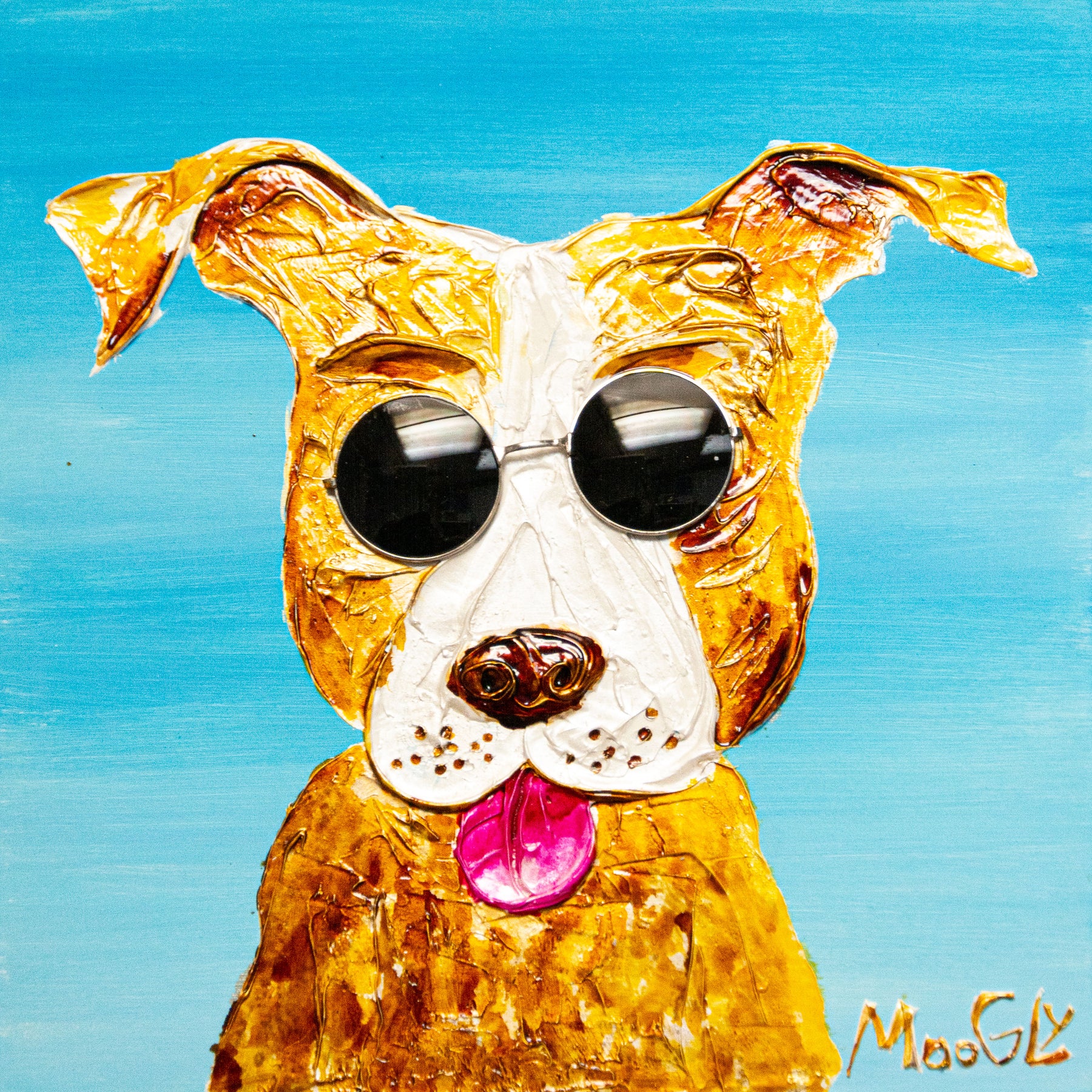 textured dog in resin with sunglasses collage on bright blue background
