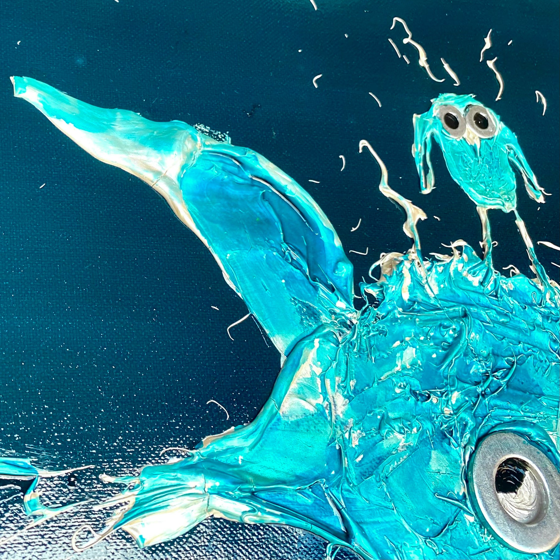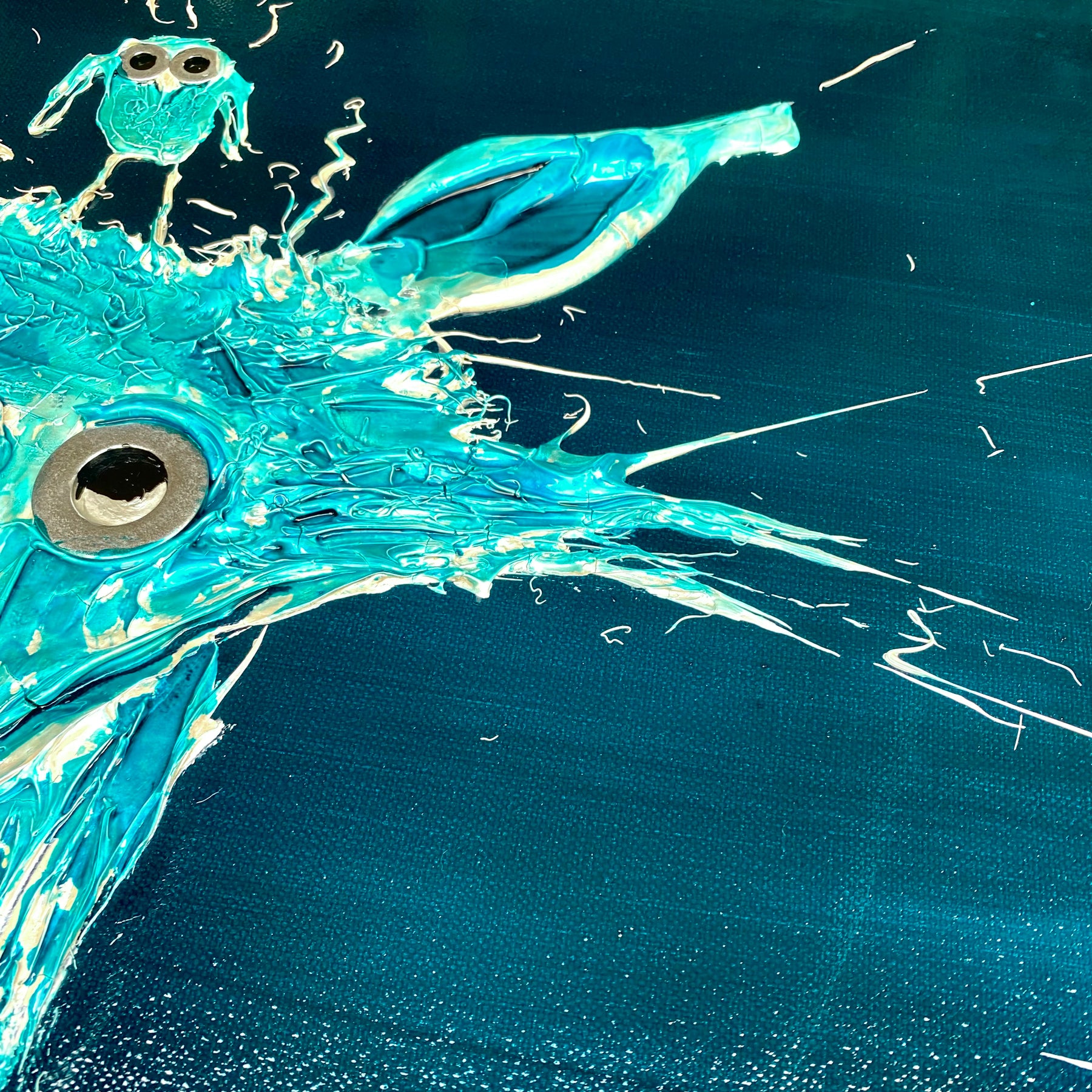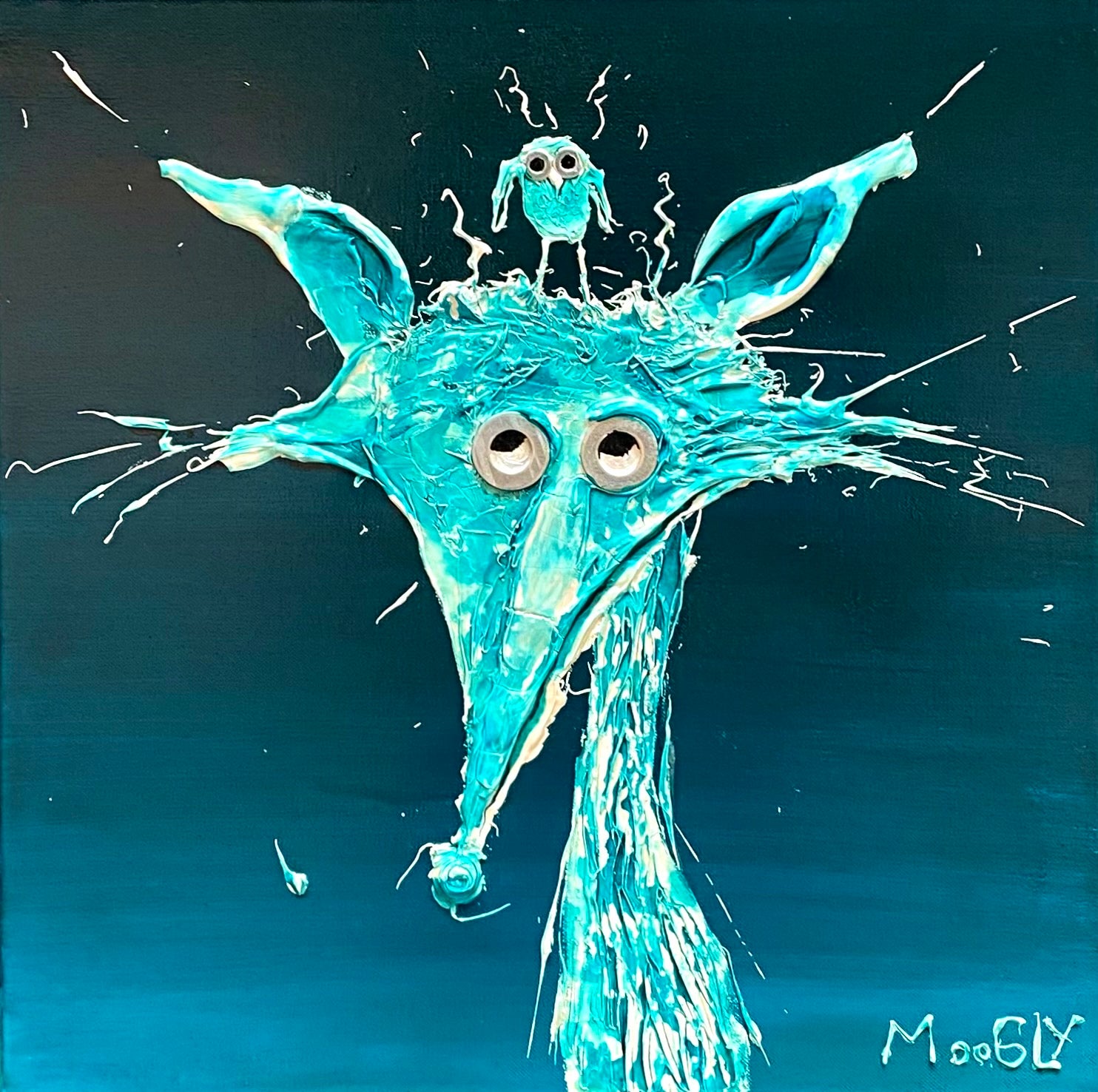 French graphic designer, illustrator, and painter Moogly creates semi-abstract "humanimal" portraits. His textured, splattered animals have oddly complex human expressions from bewilderment to apathy. Using acrylic, lacquer, and resin, he positions the monochromatic characters against a black void, allowing the eyes, marked by two machine washers, to speak. Moogly is deeply ashamed of the environmental harm caused by humans, so he allows animals to reflect this emotional damage back at us.