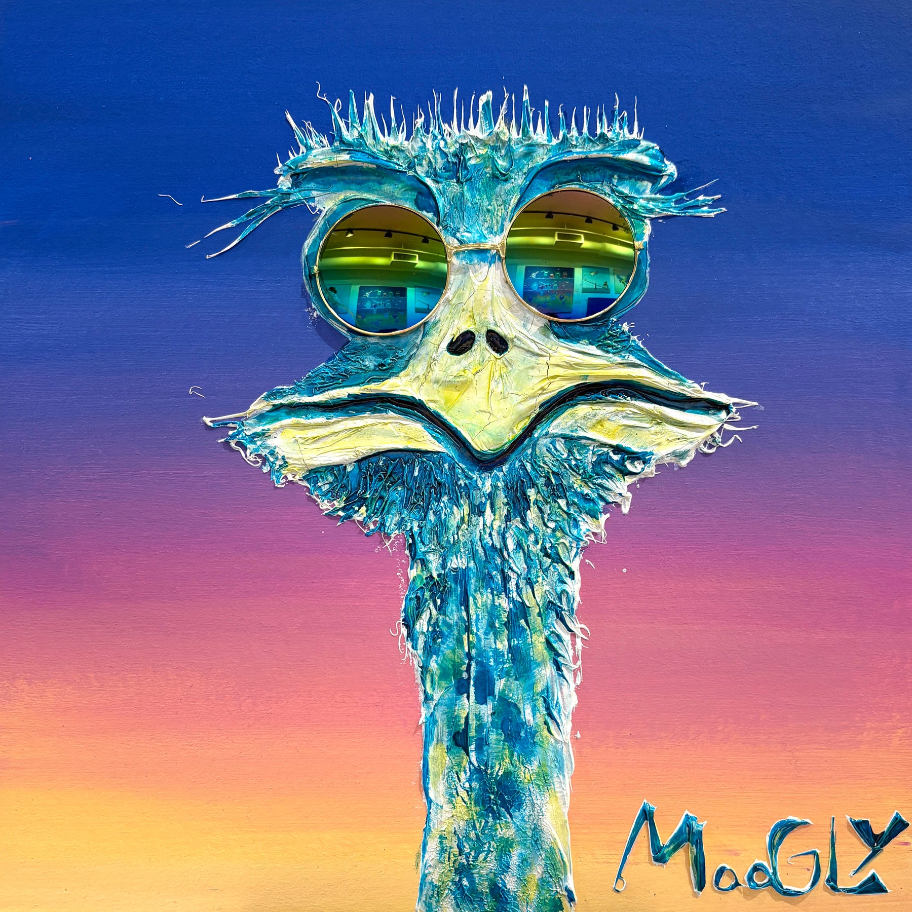 French graphic designer, illustrator, and painter Moogly creates semi-abstract "humanimal" portraits. His textured, splattered animals have oddly complex human expressions from bewilderment to apathy. Using acrylic, lacquer, and resin, he positions the monochromatic characters against a black void, allowing the eyes, marked by two machine washers, to speak. Moogly is deeply ashamed of the environmental harm caused by humans, so he allows animals to reflect this emotional damage back at us.