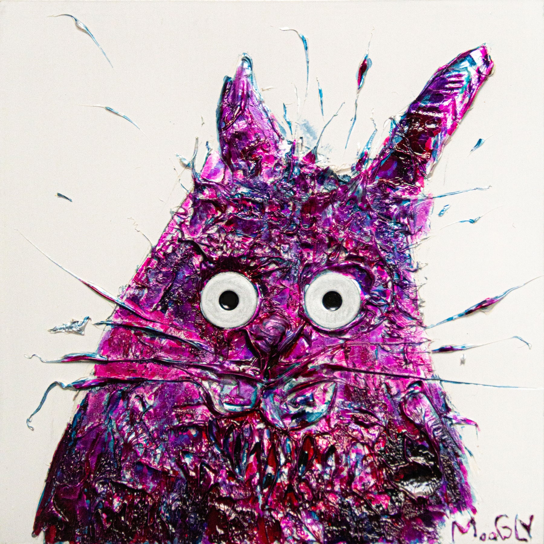 French graphic designer, illustrator, and painter Moogly creates semi-abstract "humanimal" portraits. His textured, splattered animals have oddly complex human expressions from bewilderment to apathy. Using acrylic, lacquer, and resin, he positions the monochromatic characters against a black void, allowing the eyes, marked by two machine washers, to speak. Moogly is deeply ashamed of the environmental harm caused by humans, so he allows animals to reflect this emotional damage back at us.