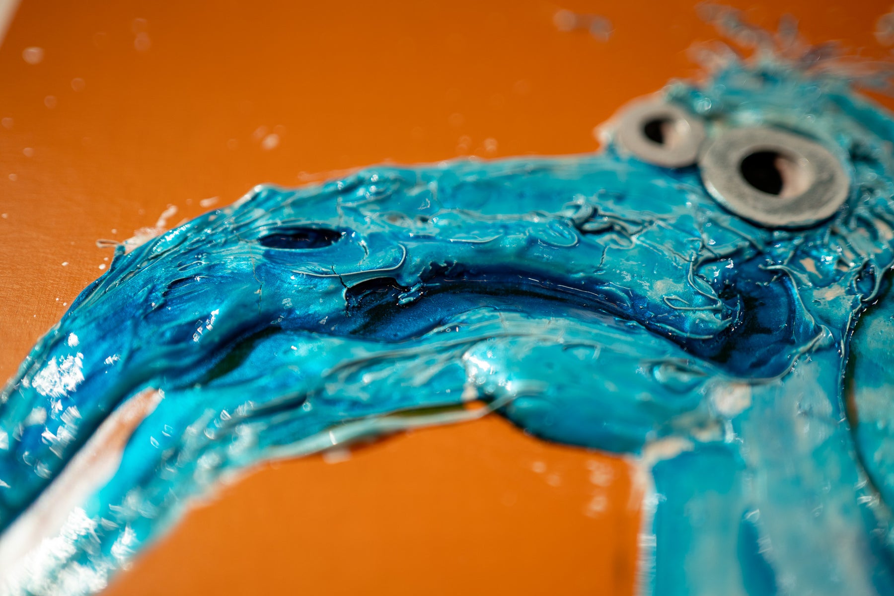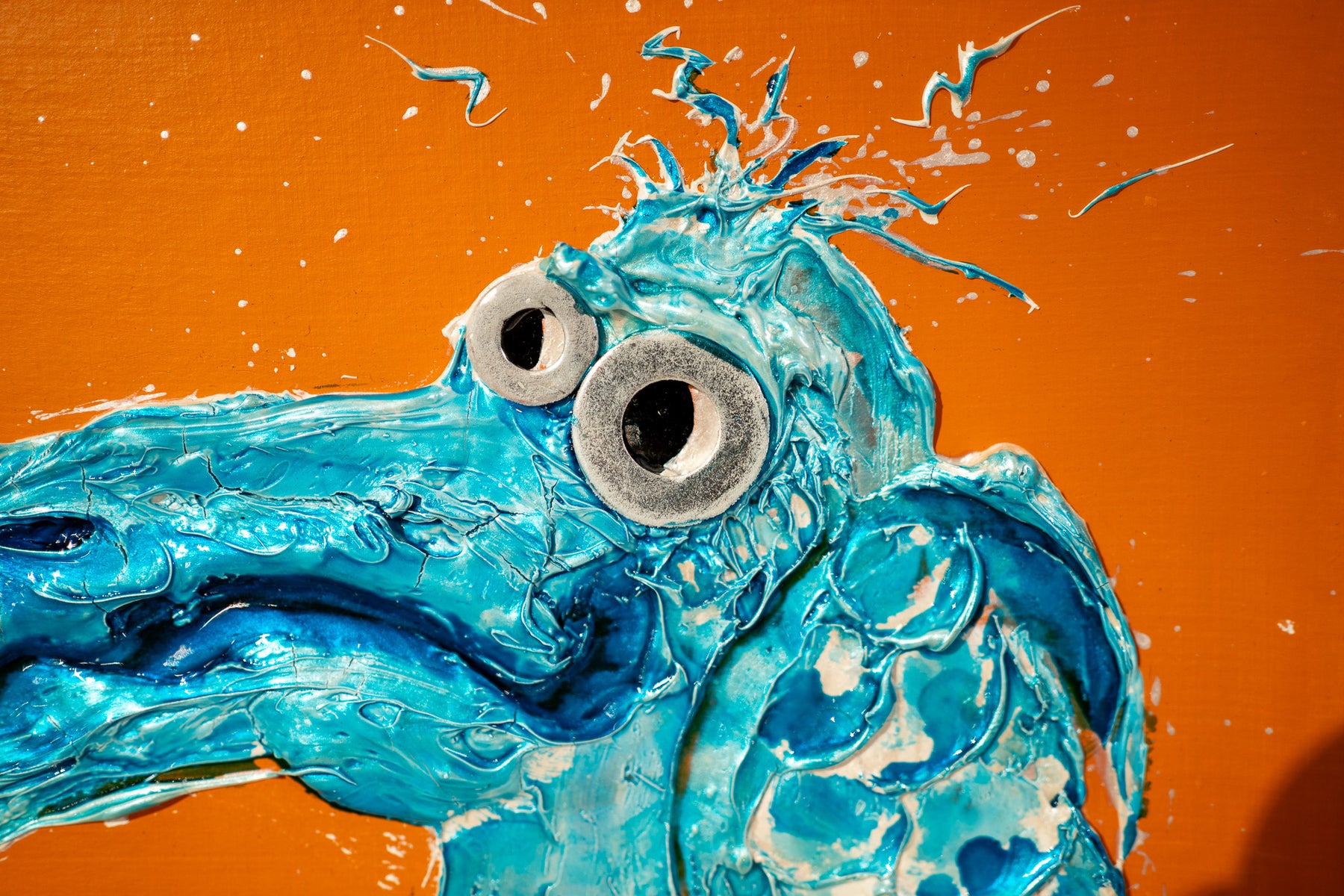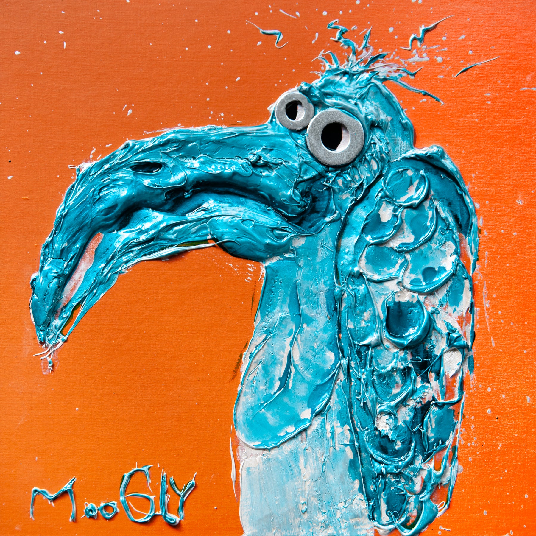French graphic designer, illustrator, and painter Moogly creates semi-abstract "humanimal" portraits. His textured, splattered animals have oddly complex human expressions from bewilderment to apathy. Using acrylic, lacquer, and resin, he positions the monochromatic characters against a black void, allowing the eyes, marked by two machine washers, to speak. Moogly is deeply ashamed of the environmental harm caused by humans, so he allows animals to reflect this emotional damage back at us.