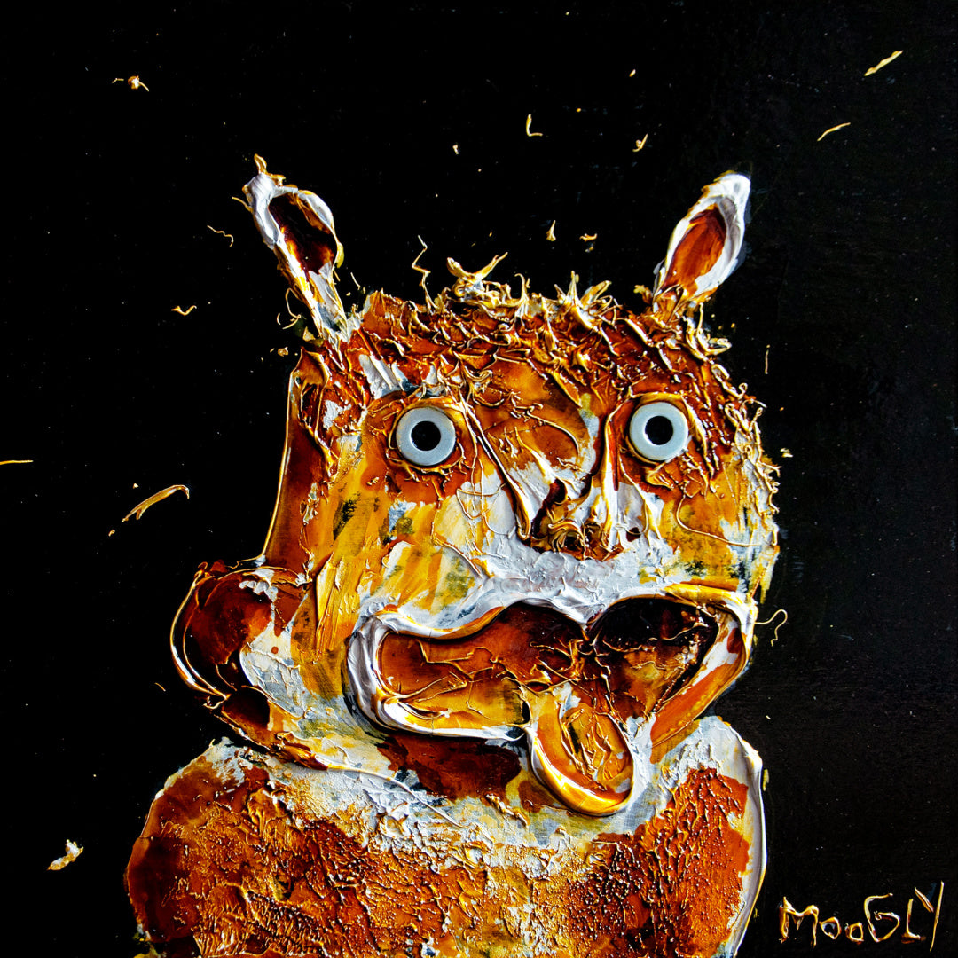 Moogly "Trashed", 14" x 14" black and orange abstract animal painting. Acrylic and collage on board.