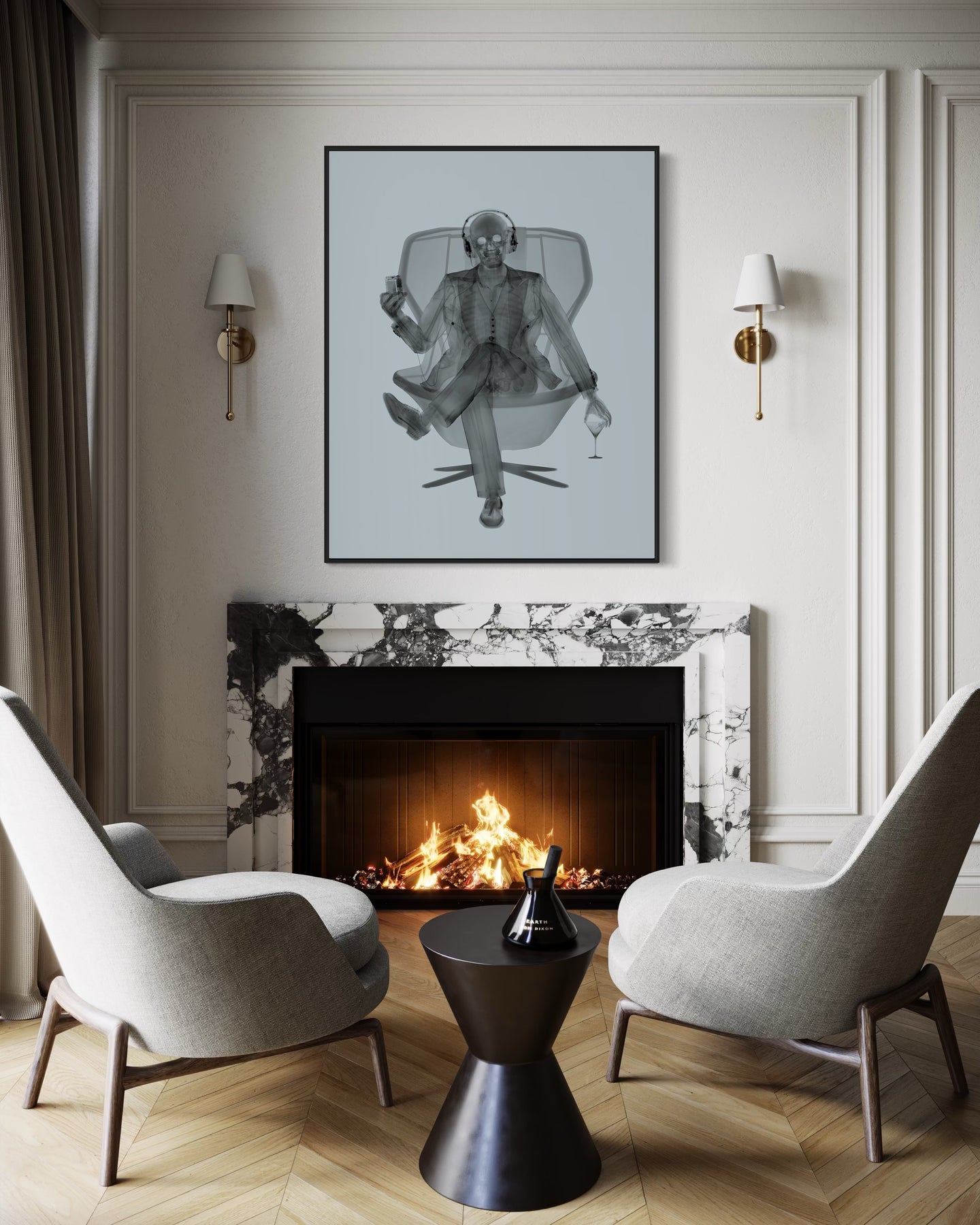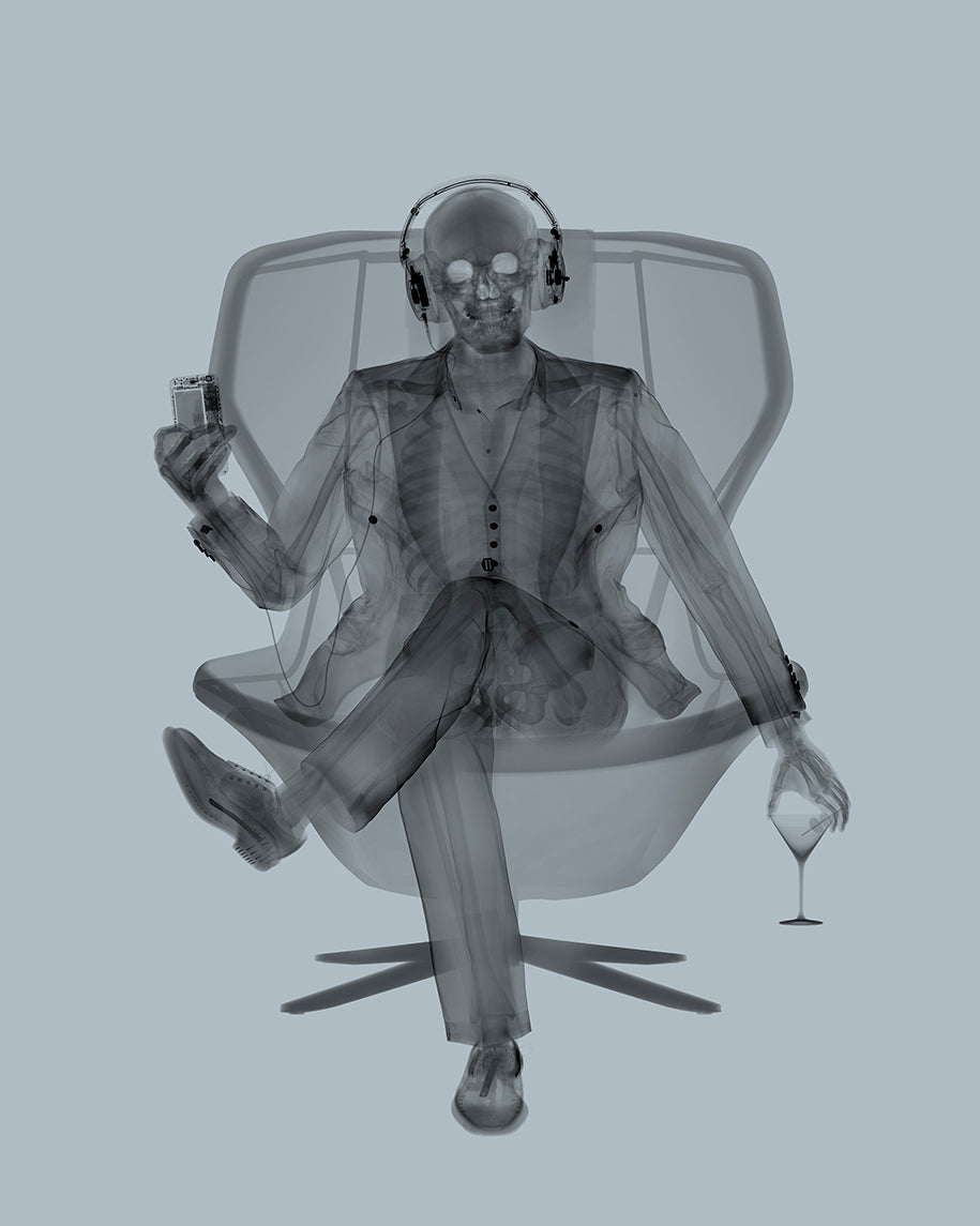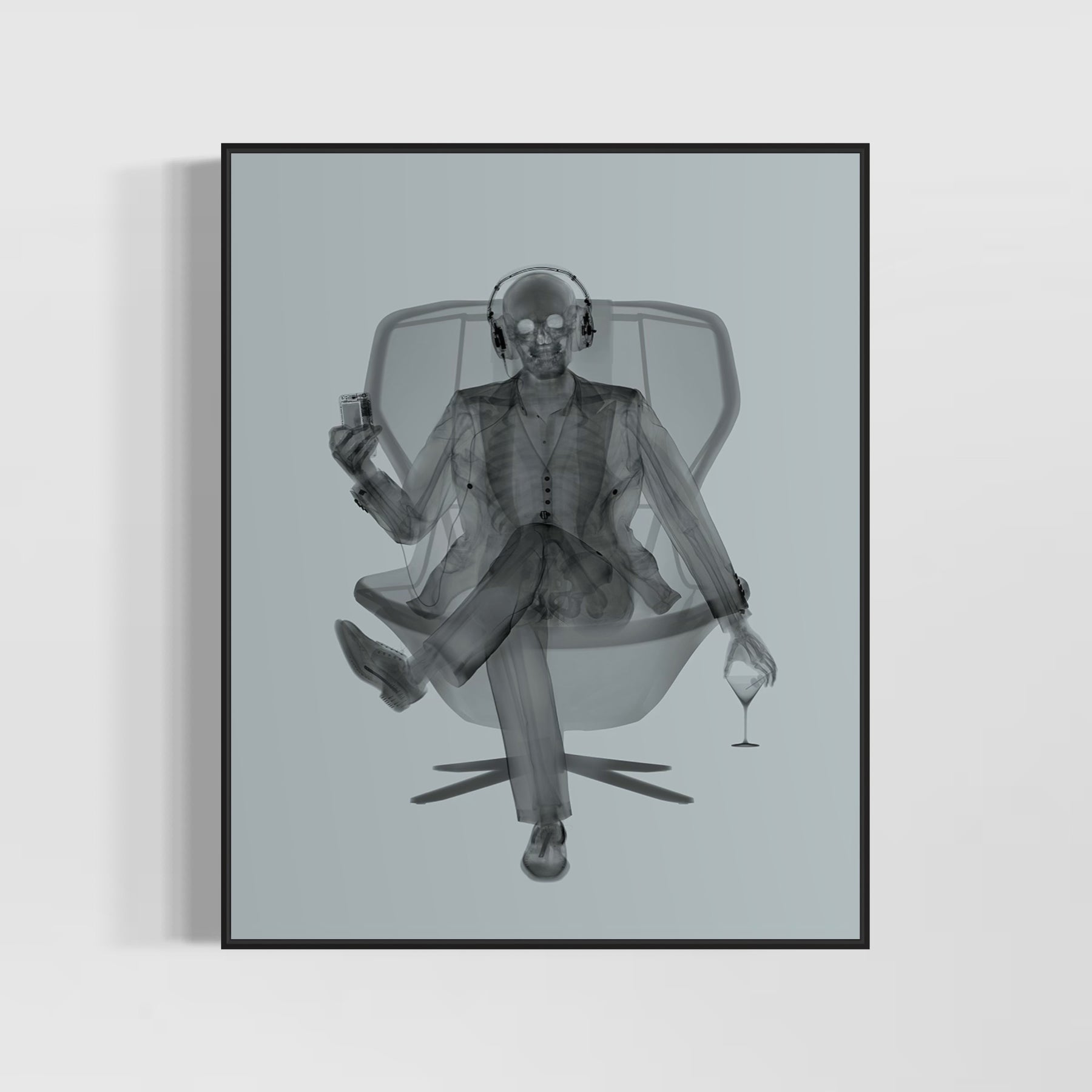 skeleton figure x ray man in suit holding wine and listening to headphone cassette on modern chair in black and grey surrealism pop
