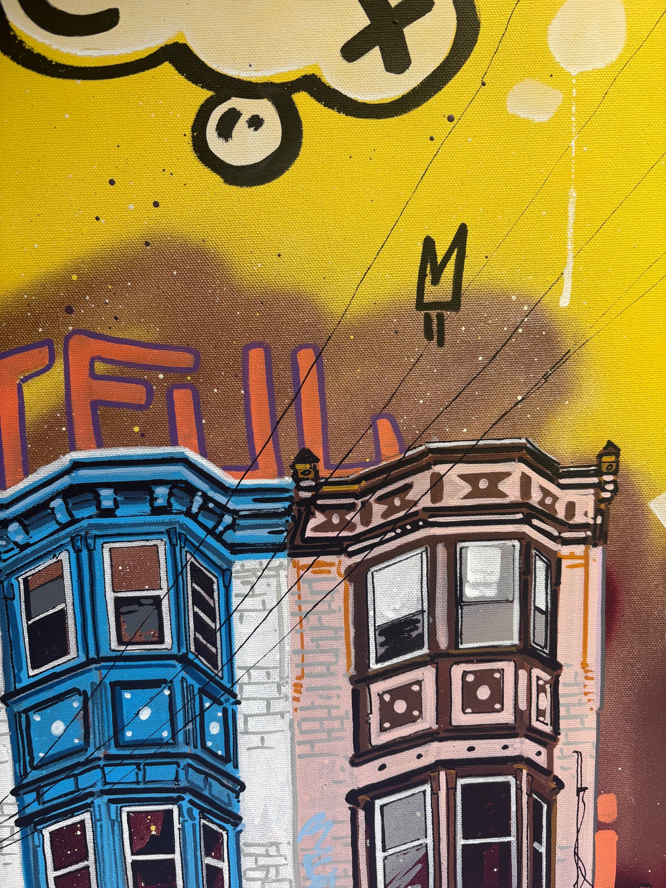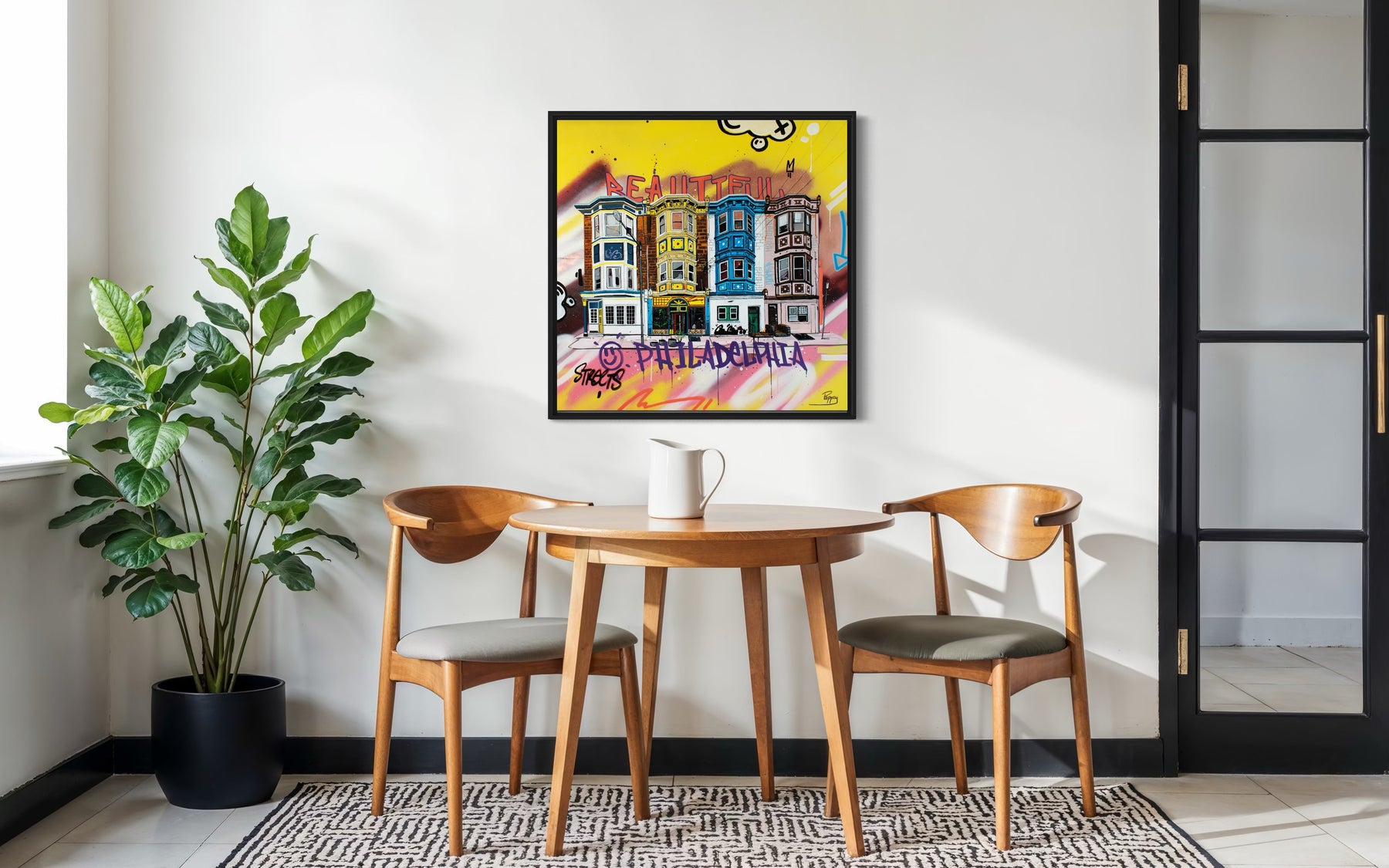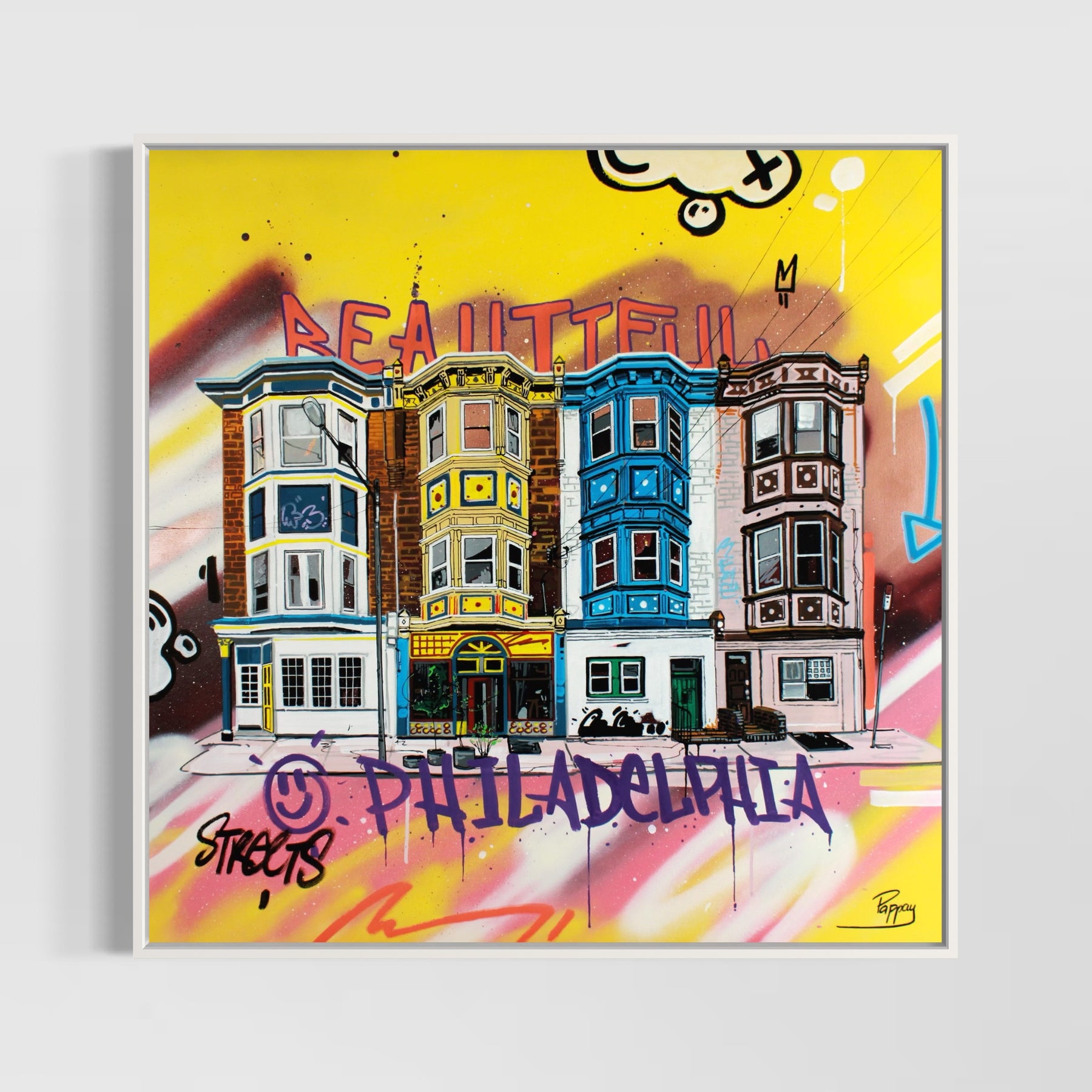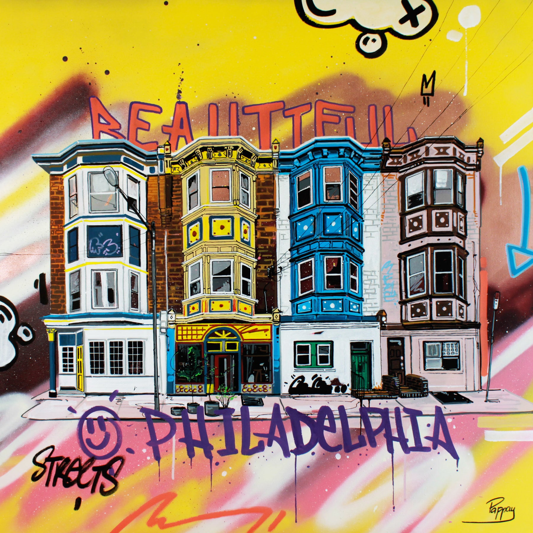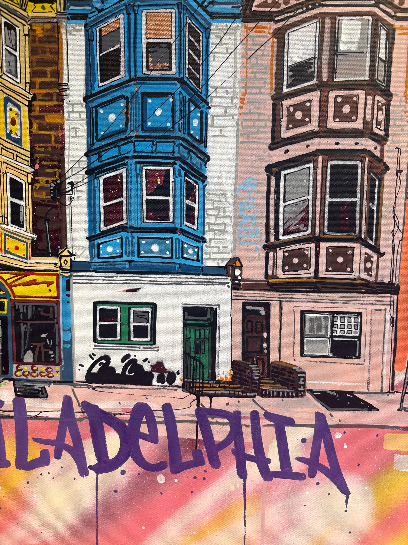 graffiti urban style illustration cartoon building philadelphia cityscape landscape graphic markers and acrylic in bright bold color