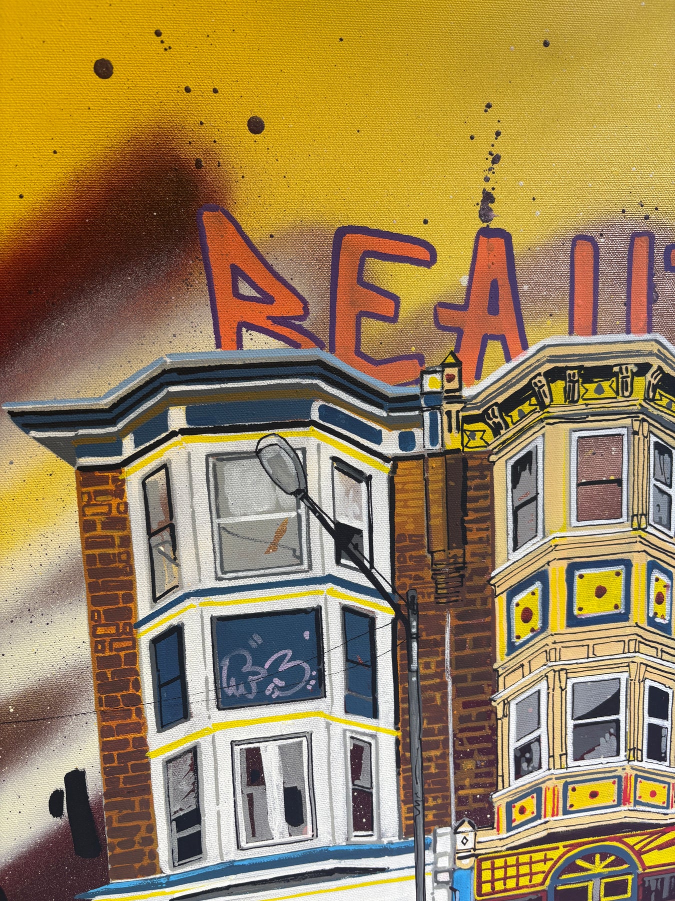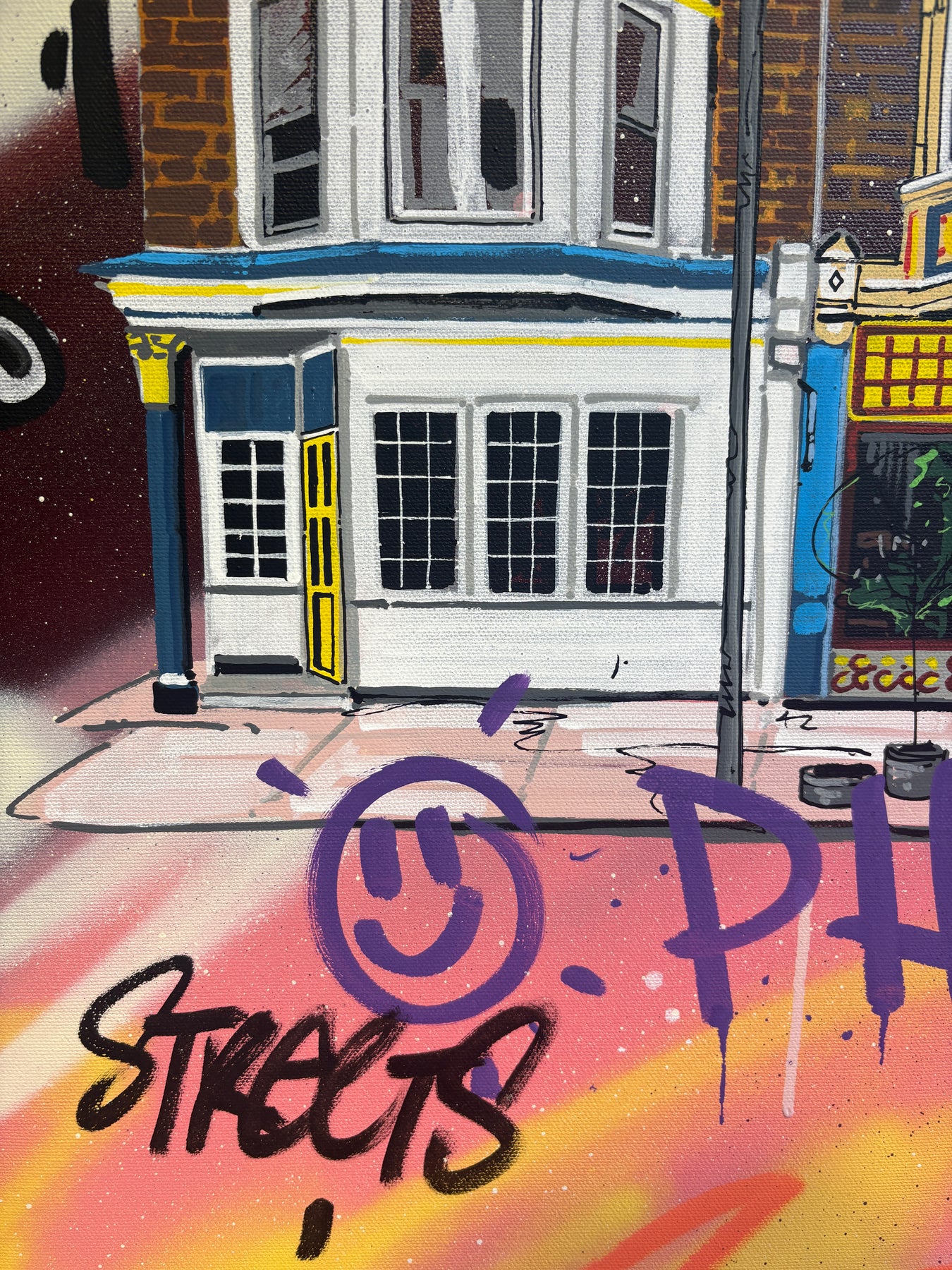 Pappay draws his inspiration from the chaos of cities and their architecture, as well as from graphic design and street art. He has always been fascinated by the relationship between humanity and its environment. The scenes represented in his compositions are devoid of any human presence, where time is suspended, objects and buildings are witnesses of life and history ready to come to life before our eyes. Deeply rooted in urban art, Pappay shines in street art by regularly creating murals.