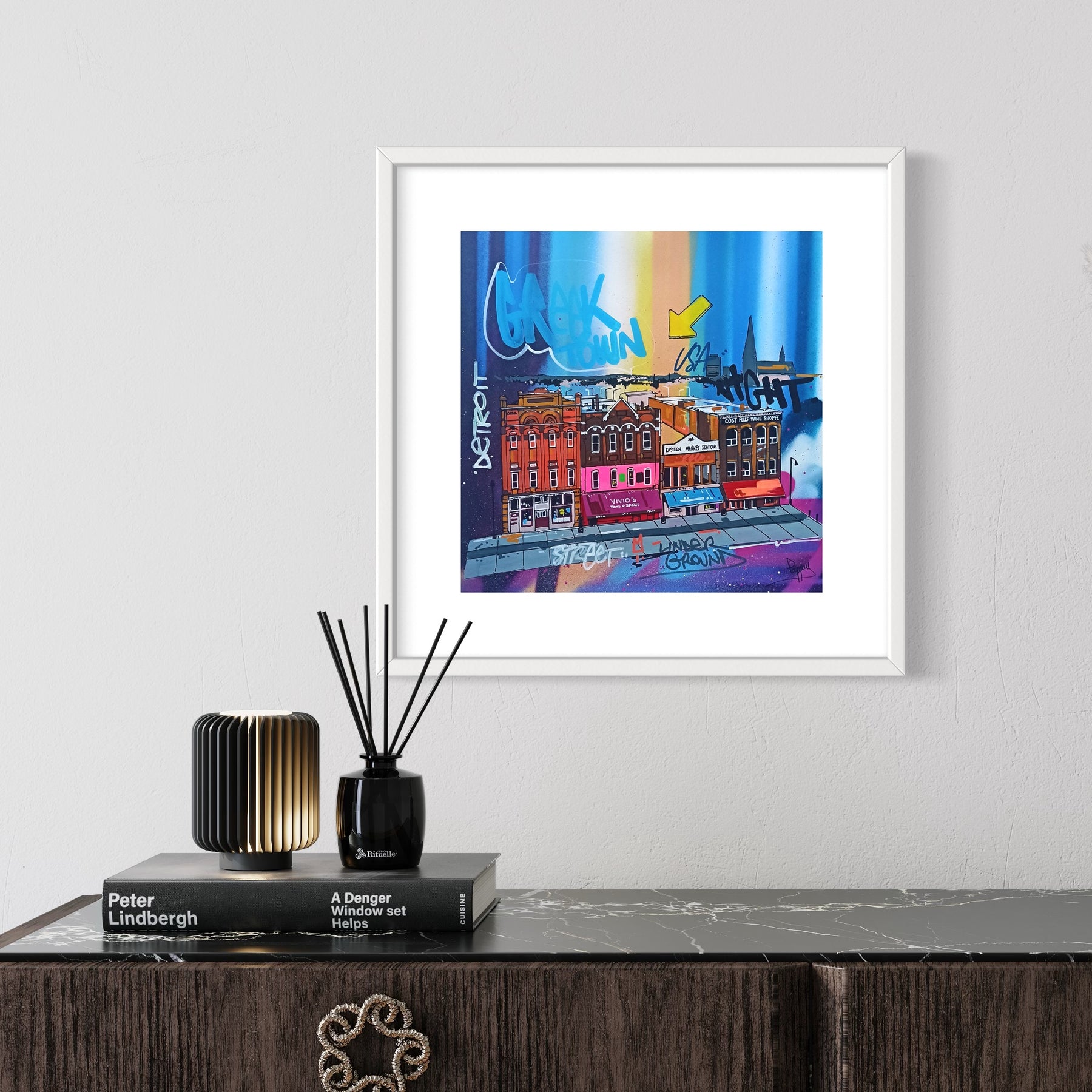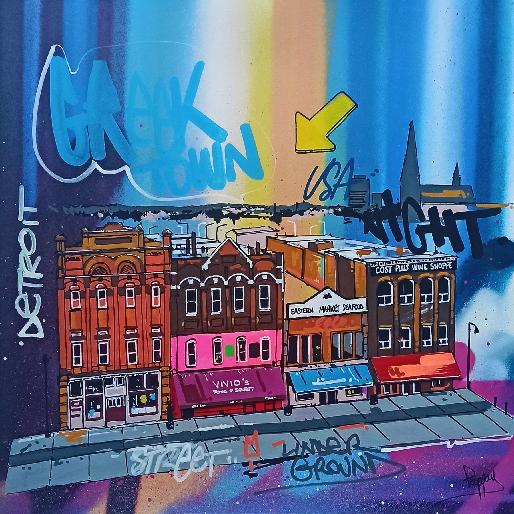 Greektown, detroit, City Scape, Graffiti, Spray Paint, Ombre, Blue