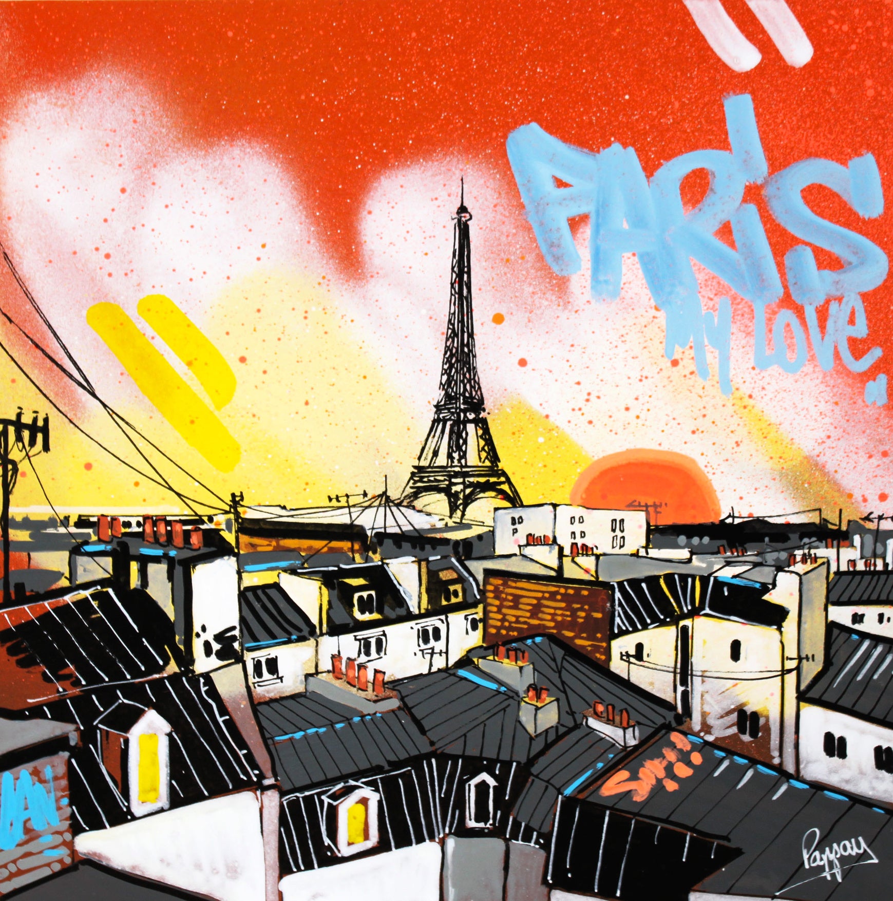 Pappay draws his inspiration from the chaos of cities and their architecture, as well as from graphic design and street art. He has always been fascinated by the relationship between humanity and its environment. The scenes represented in his compositions are devoid of any human presence, where time is suspended, objects and buildings are witnesses of life and history ready to come to life before our eyes. Deeply rooted in urban art, Pappay shines in street art by regularly creating murals.