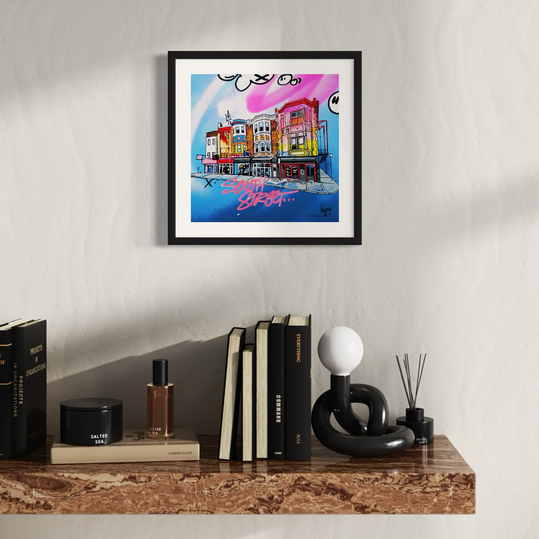 south street philadelphia rainbow colors store front on spray paint background of blue and pink