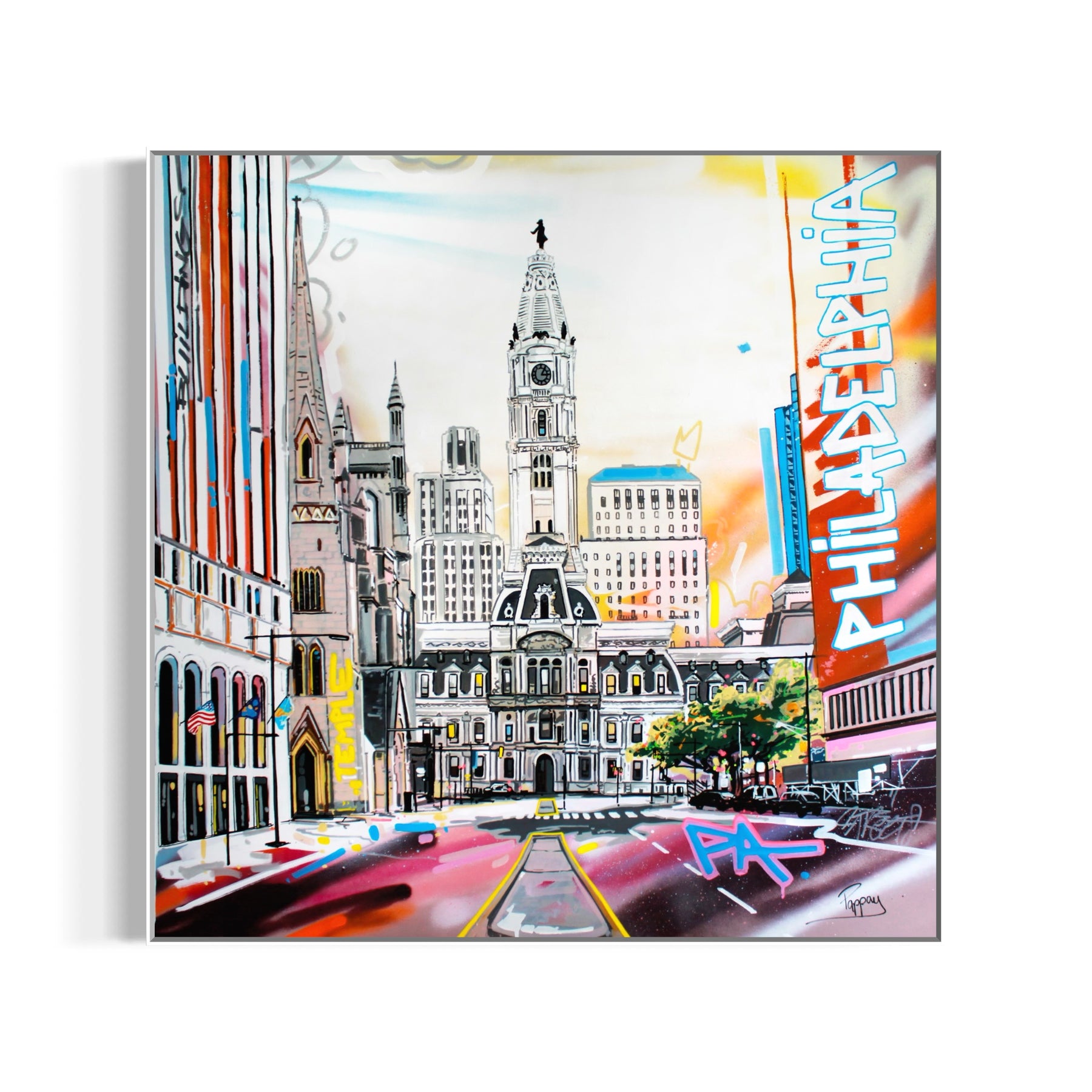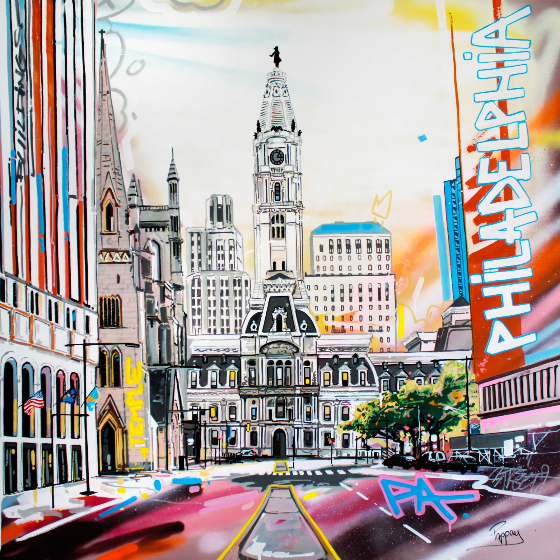 Pappay draws his inspiration from the chaos of cities and their architecture, as well as from graphic design and street art. He has always been fascinated by the relationship between humanity and its environment. The scenes represented in his compositions are devoid of any human presence, where time is suspended, objects and buildings are witnesses of life and history ready to come to life before our eyes. Deeply rooted in urban art, Pappay shines in street art by regularly creating murals.
