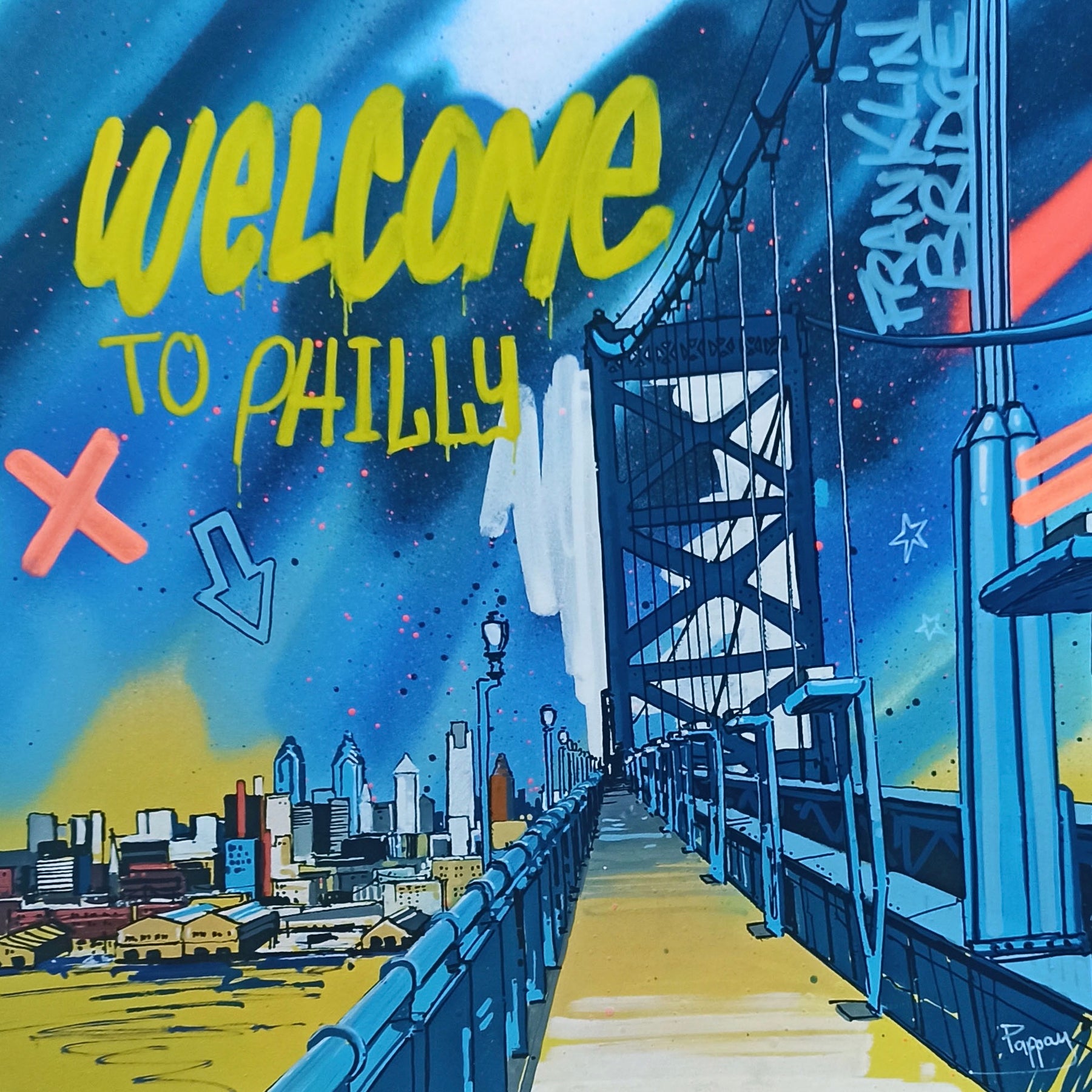 Philadelphia, Philly, Ben Franklin Bridge, Blue, Yellow, Graffiti, Urban