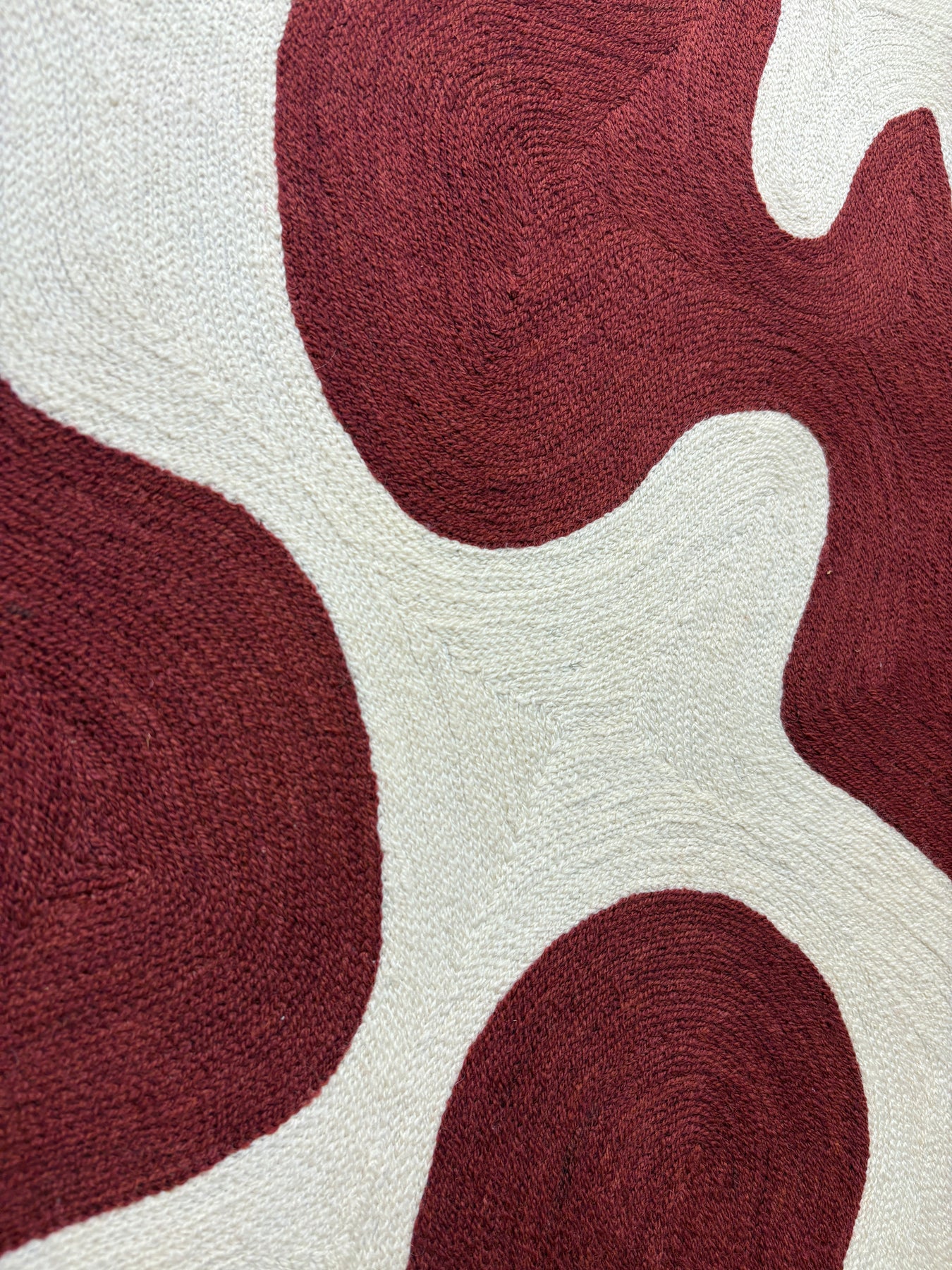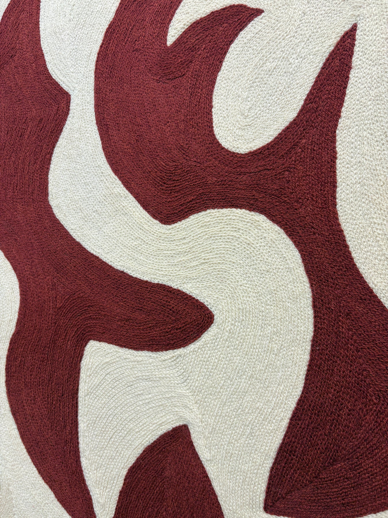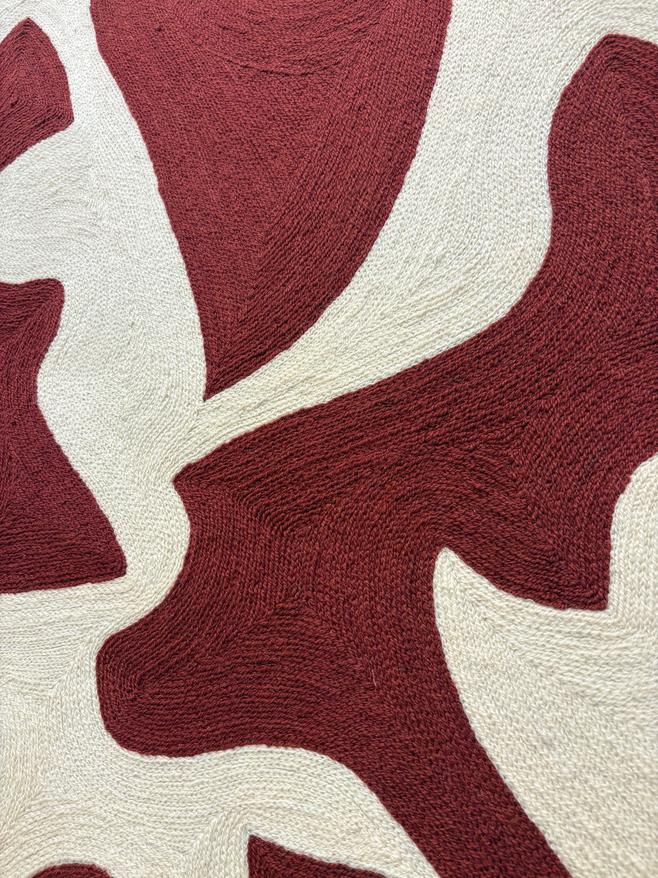 abstract shapes in rust orange red color on cream white background embroidery textile chain stitched design negative space shapes and patterns