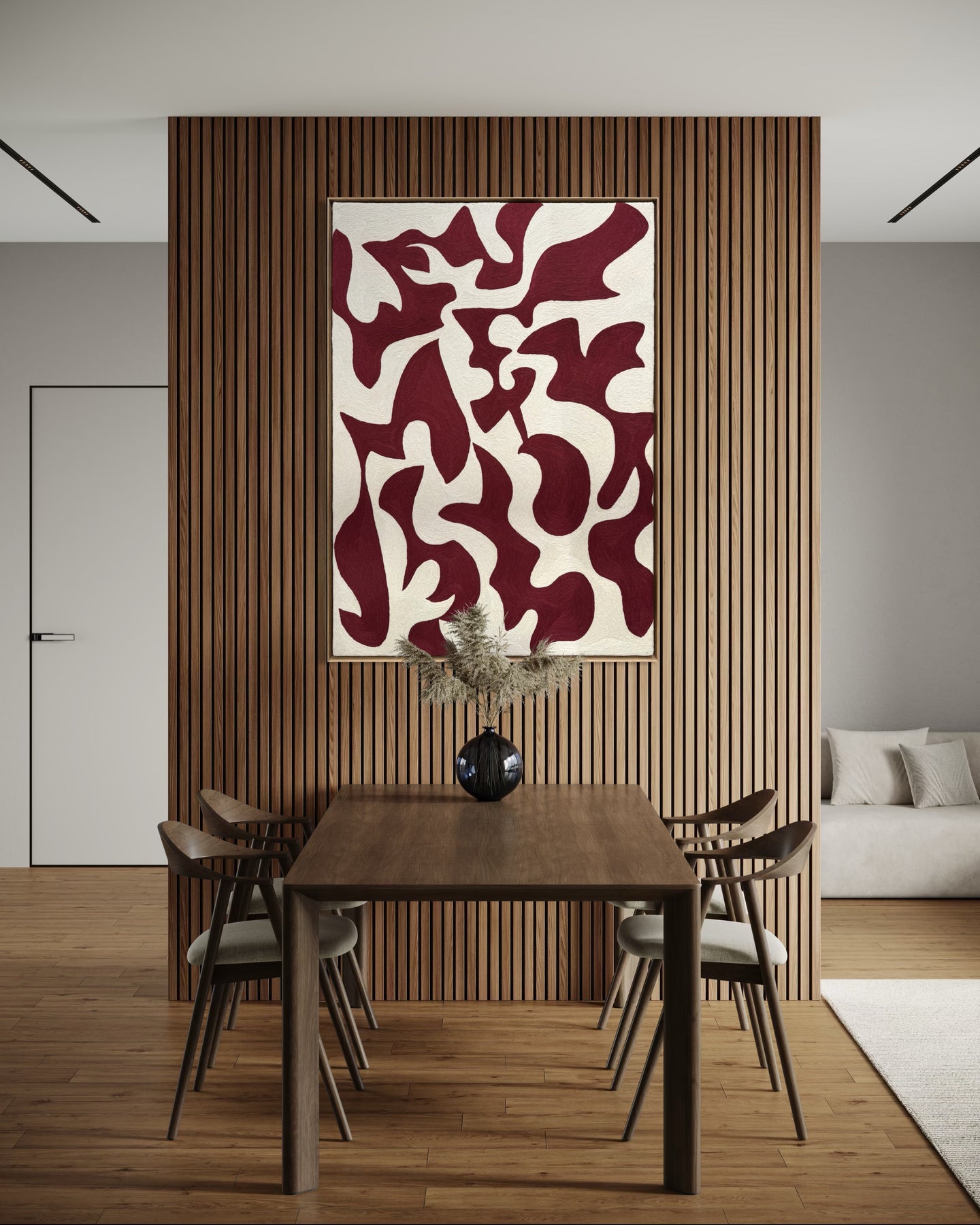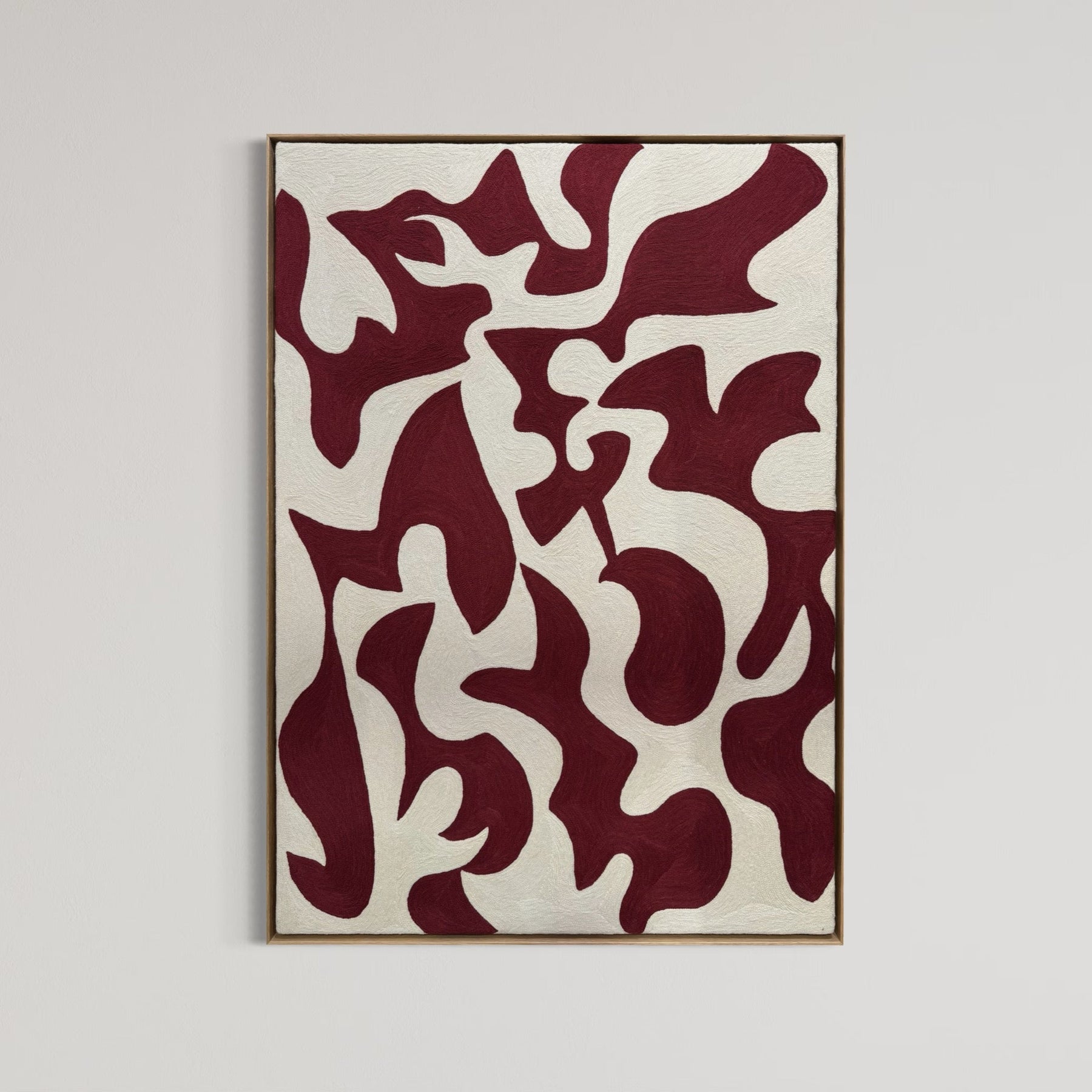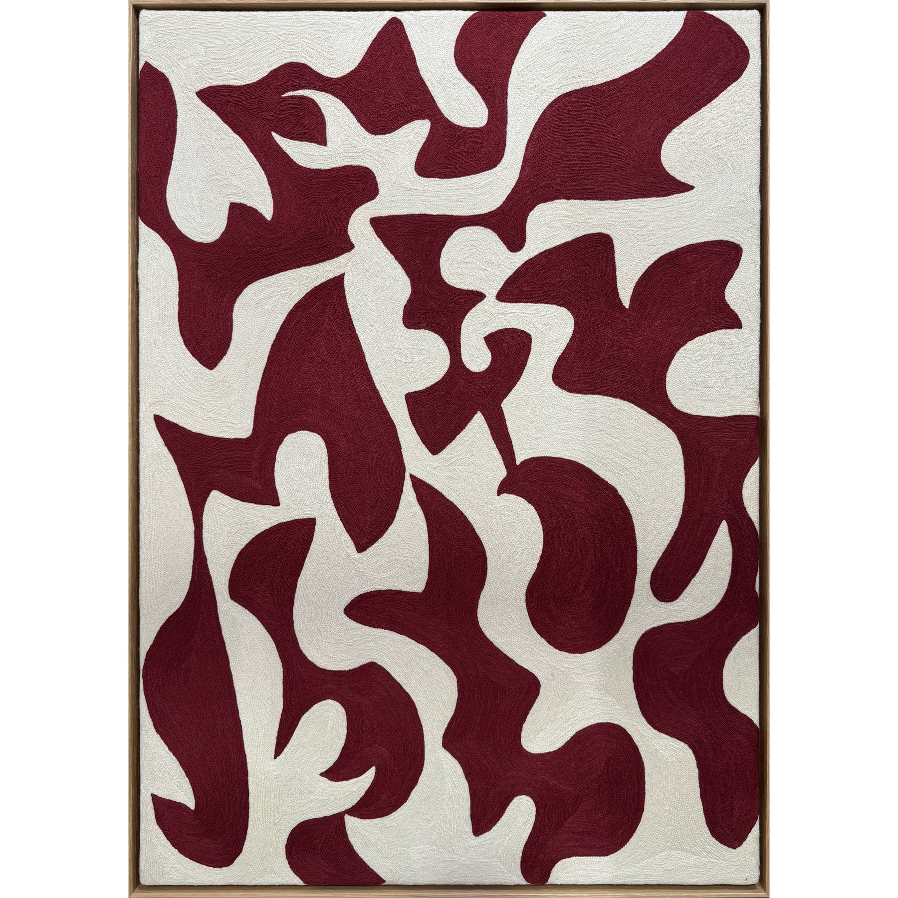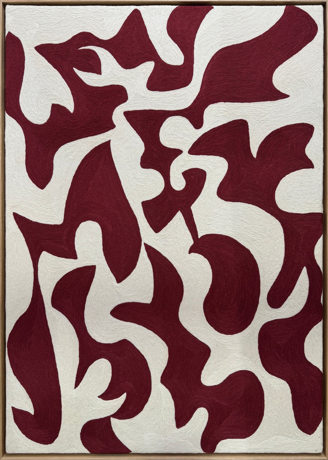 abstract shapes in rust orange red color on cream white background embroidery textile chain stitched design negative space shapes and patterns