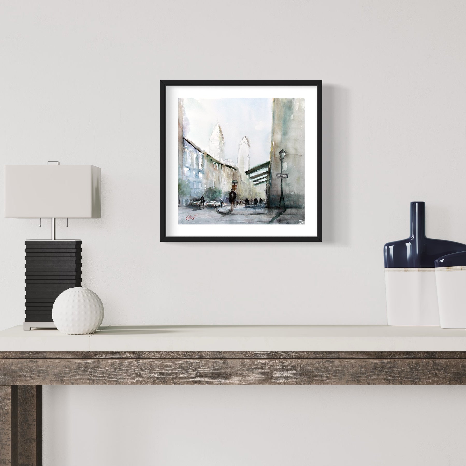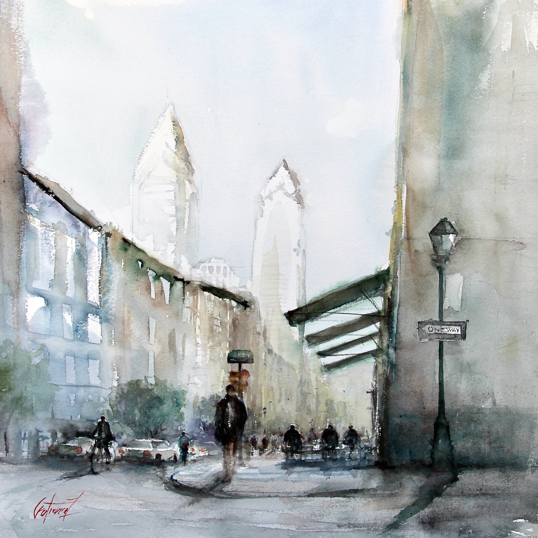 sidewalk scene in washy watercolors of grey and blue, street lamp and skyscrapers in background