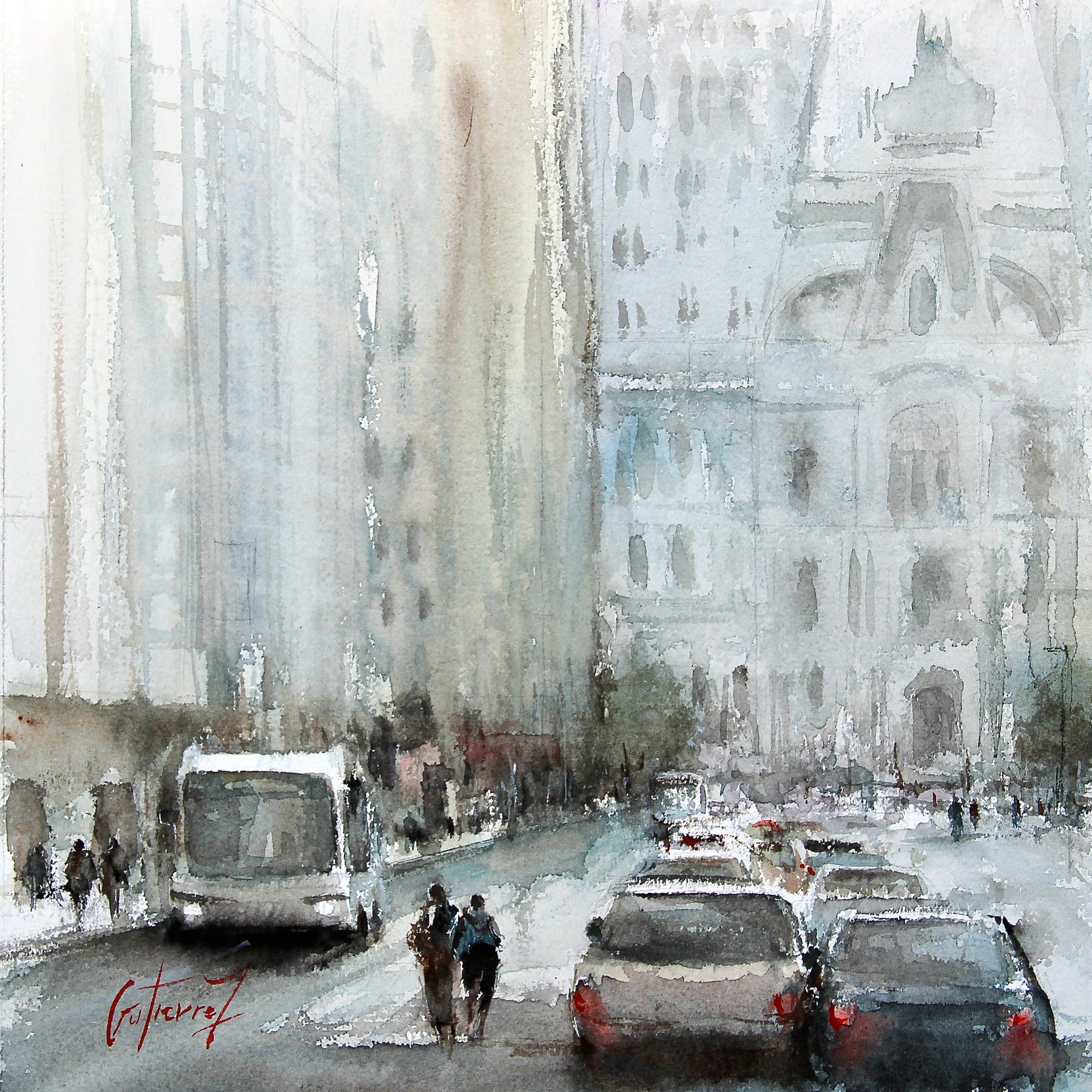 watercolor of people and cars going down broad street philadelphia with city hall building in background and skyscrapers septa bus in light washy blues