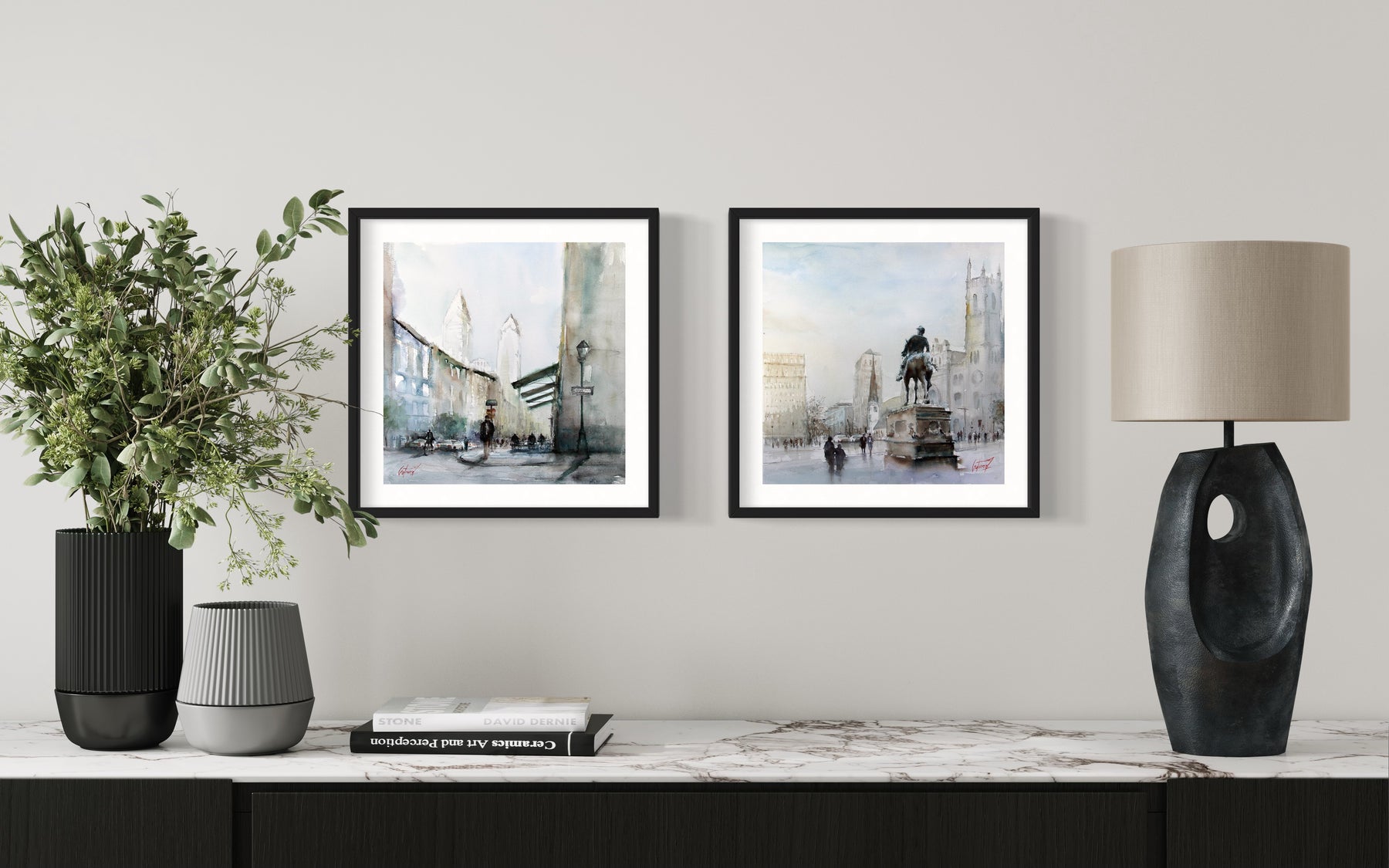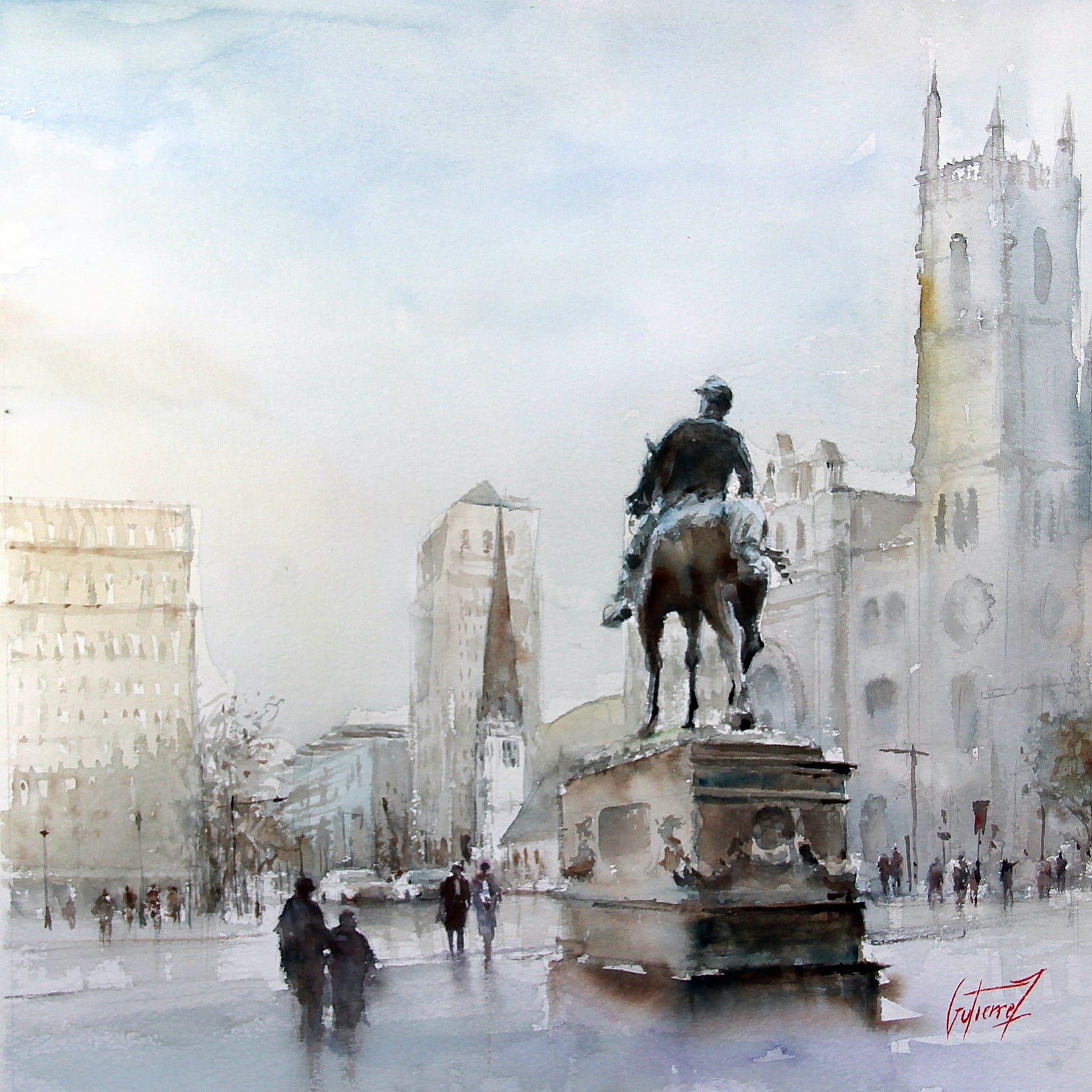 Pierre Gutierrez works in watercolor, creating soft and dreamy landscapes and cityscapes with movement and color. His style is unique, born of graphic design and colorful impressionism. Subtle characters move through his paintings in a fluid dance, inviting the viewer into the artist’s misty realm. Born in Algeria, now living in France, Gutierrez draws inspiration from master impressionists Claude Monet and William Turner.