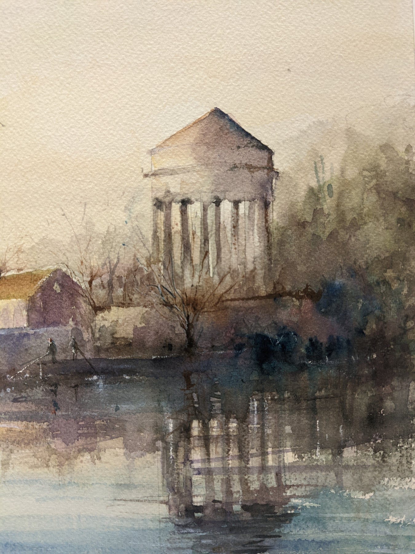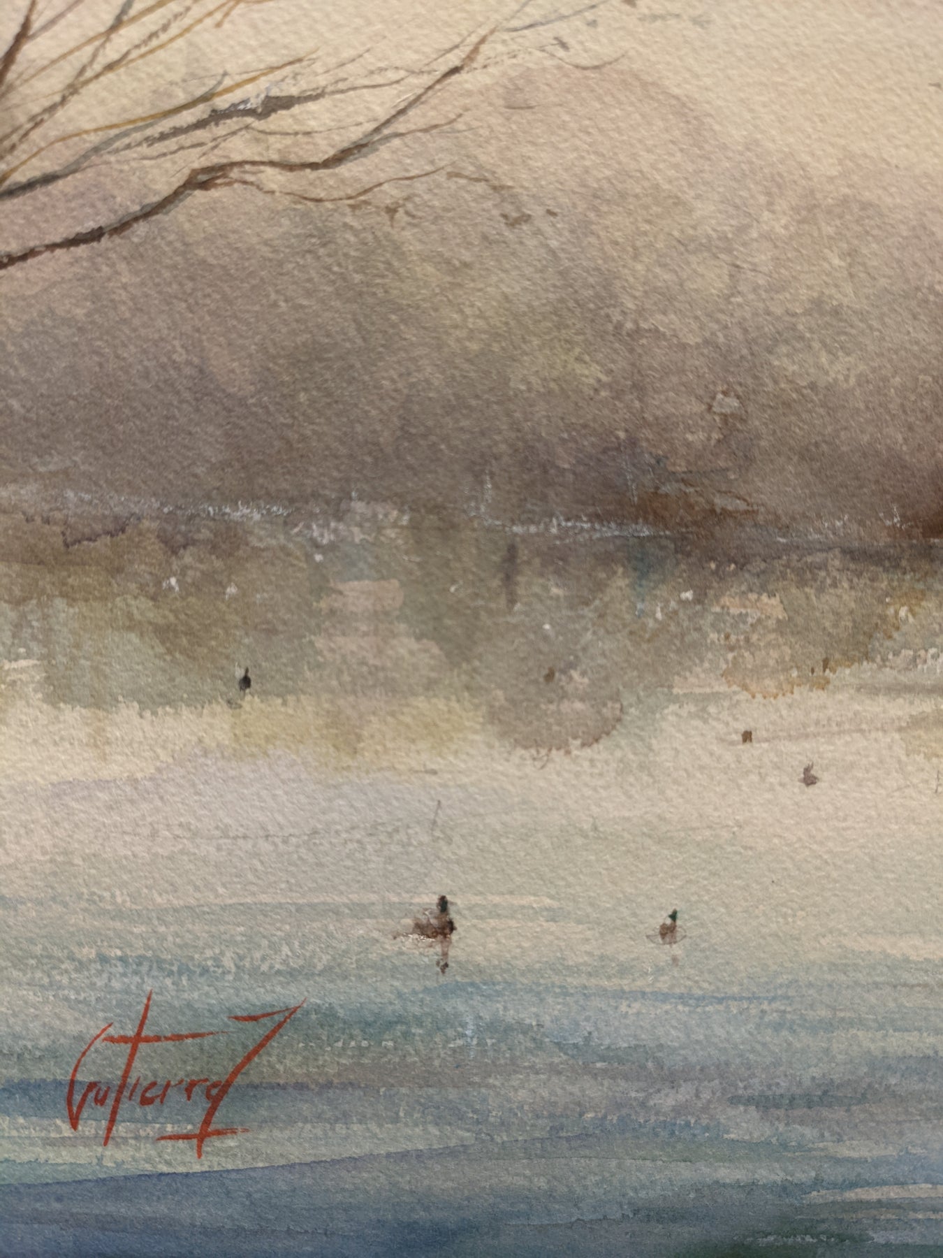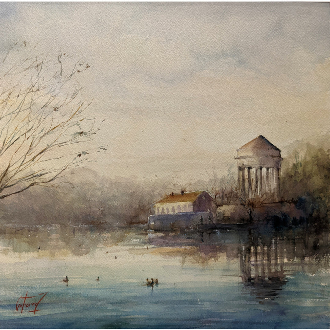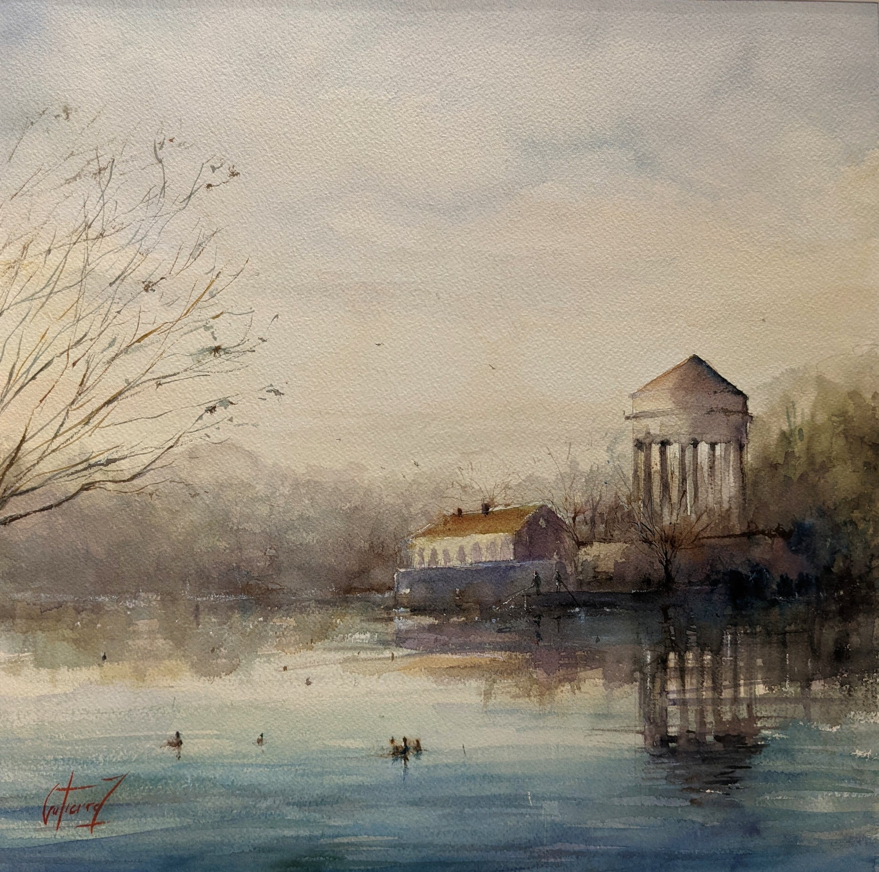 Pierre Gutierrez works in watercolor, creating soft and dreamy landscapes and cityscapes with movement and color. His style is unique, born of graphic design and colorful impressionism. Subtle characters move through his paintings in a fluid dance, inviting the viewer into the artist’s misty realm. Born in Algeria, now living in France, Gutierrez draws inspiration from master impressionists Claude Monet and William Turner.