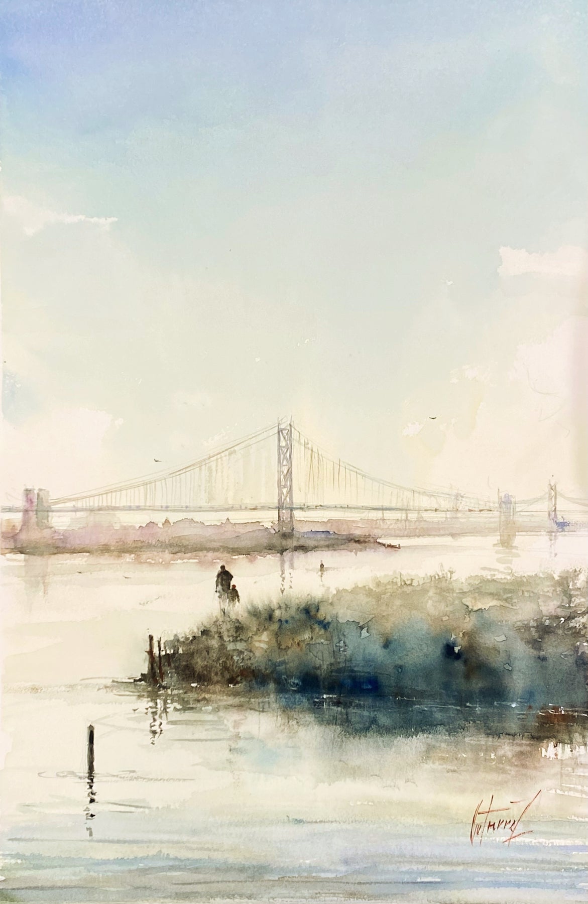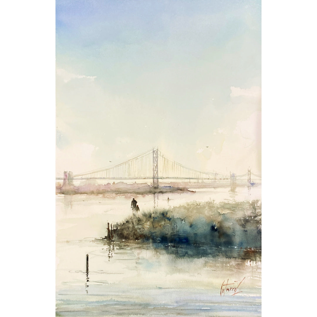 Pierre Gutierrez works in watercolor, creating soft and dreamy landscapes and cityscapes with movement and color. His style is unique, born of graphic design and colorful impressionism. Subtle characters move through his paintings in a fluid dance, inviting the viewer into the artist’s misty realm. Born in Algeria, now living in France, Gutierrez draws inspiration from master impressionists Claude Monet and William Turner.