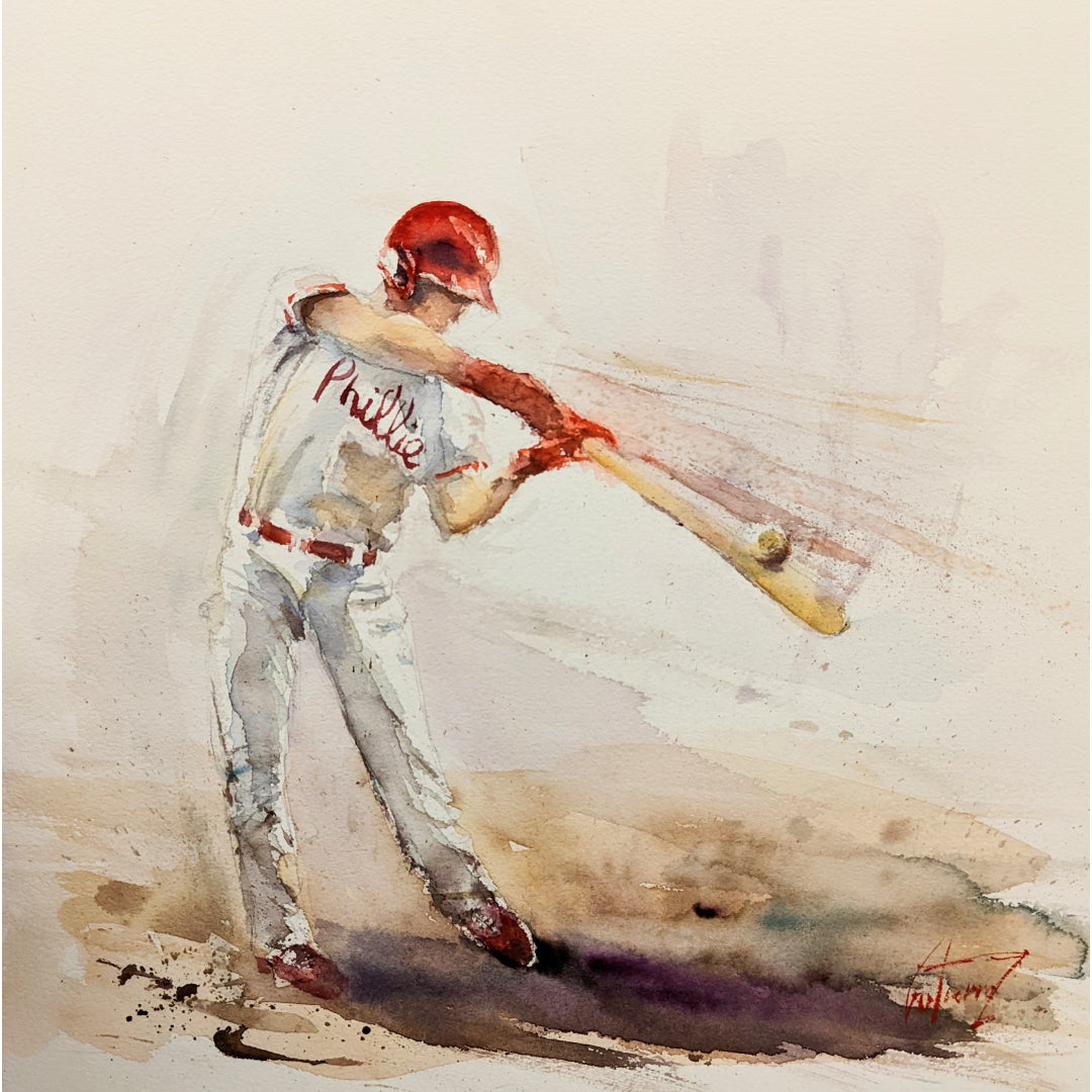 The Hitter, artwork by Pierre Gutierrez. Watercolor on paper. 14 by 14 inches.