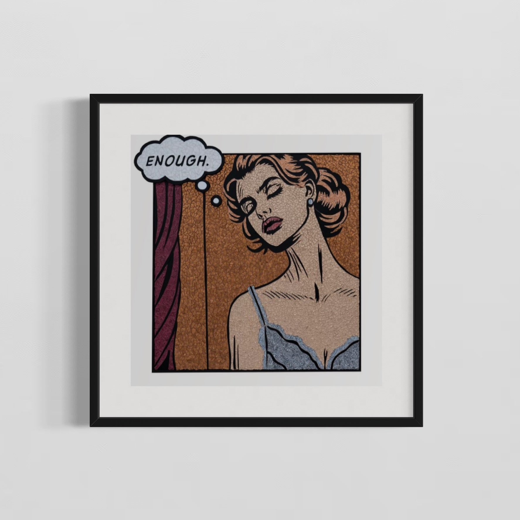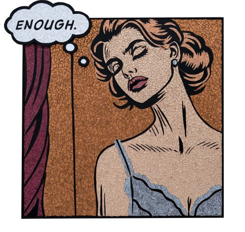 woman standing longing and tired, wearing blue grey top against orange background with red curtain and text bubble with enough in comic style glass mosaic print