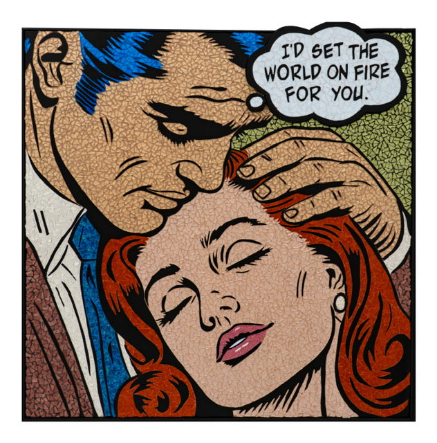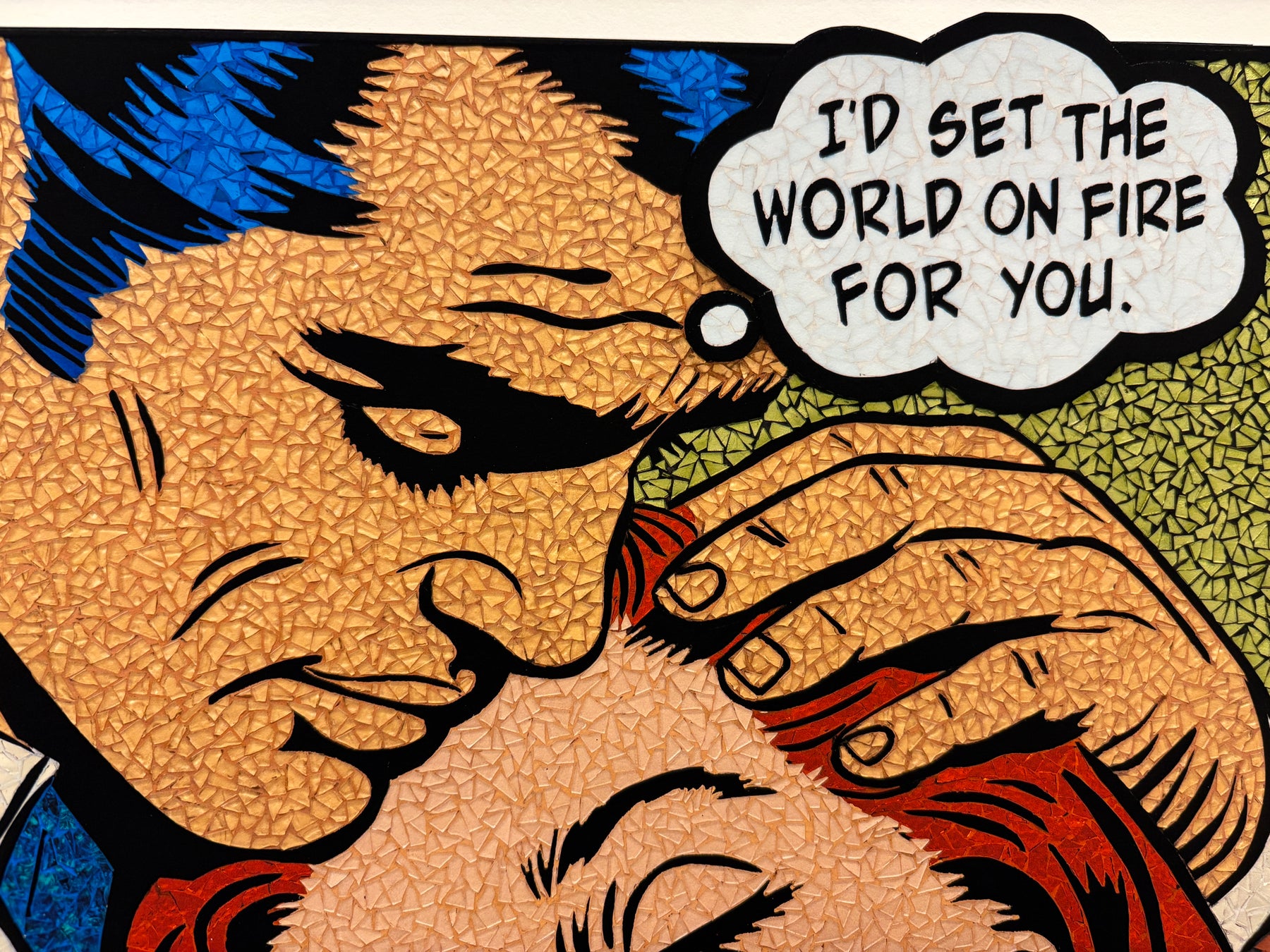 limited edition stain glass mosaic giclee print hand embellished with glitter  text bubble comic style retro vintage woman with red hair sad leaning into male figure with blue hair caress on green background