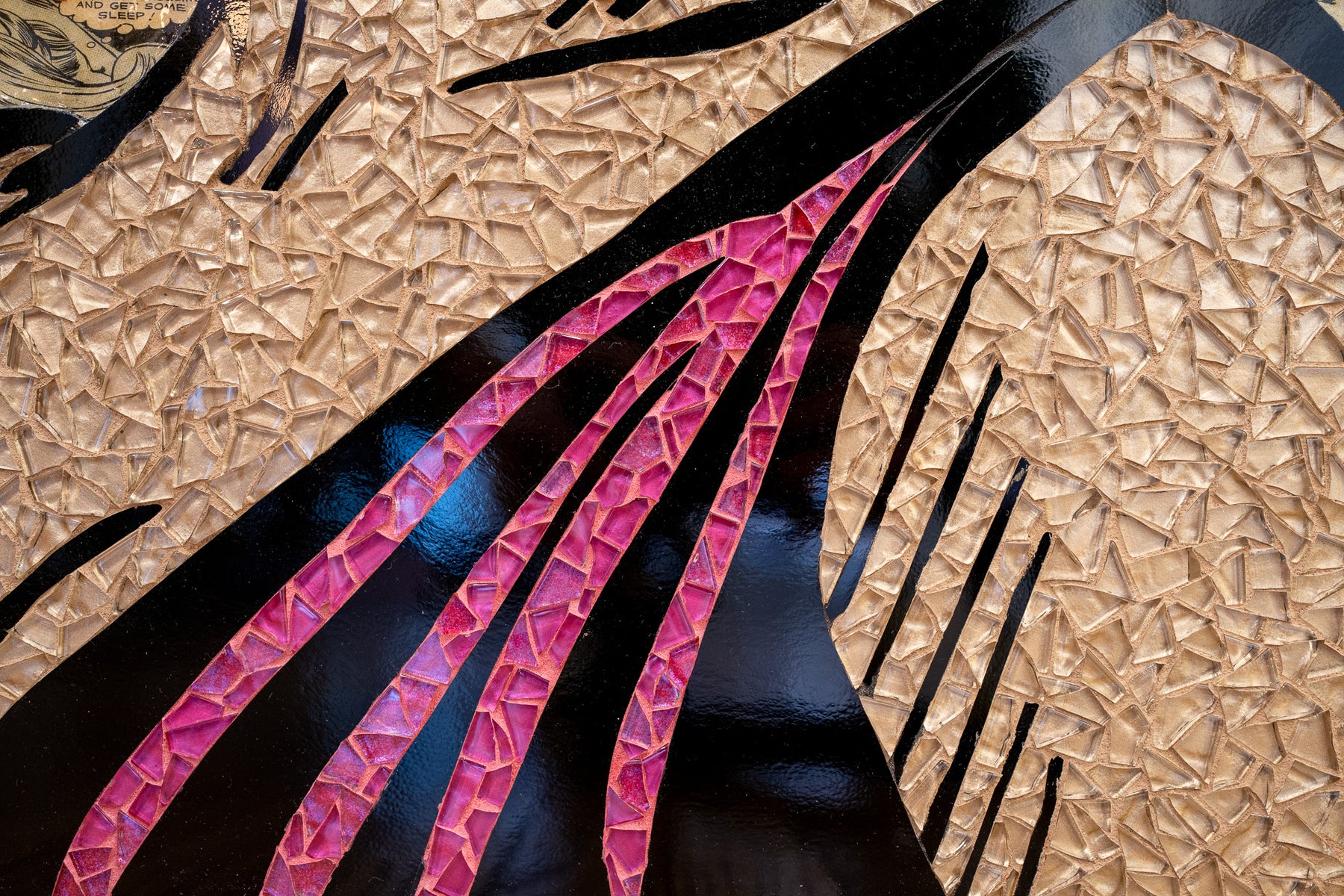 • Mosaic made with hand cut stained glass, glitter glass, metallic glass, foil glass and mirrored glass, weldbond glue, and hand-dyed grout on Wedi Board.