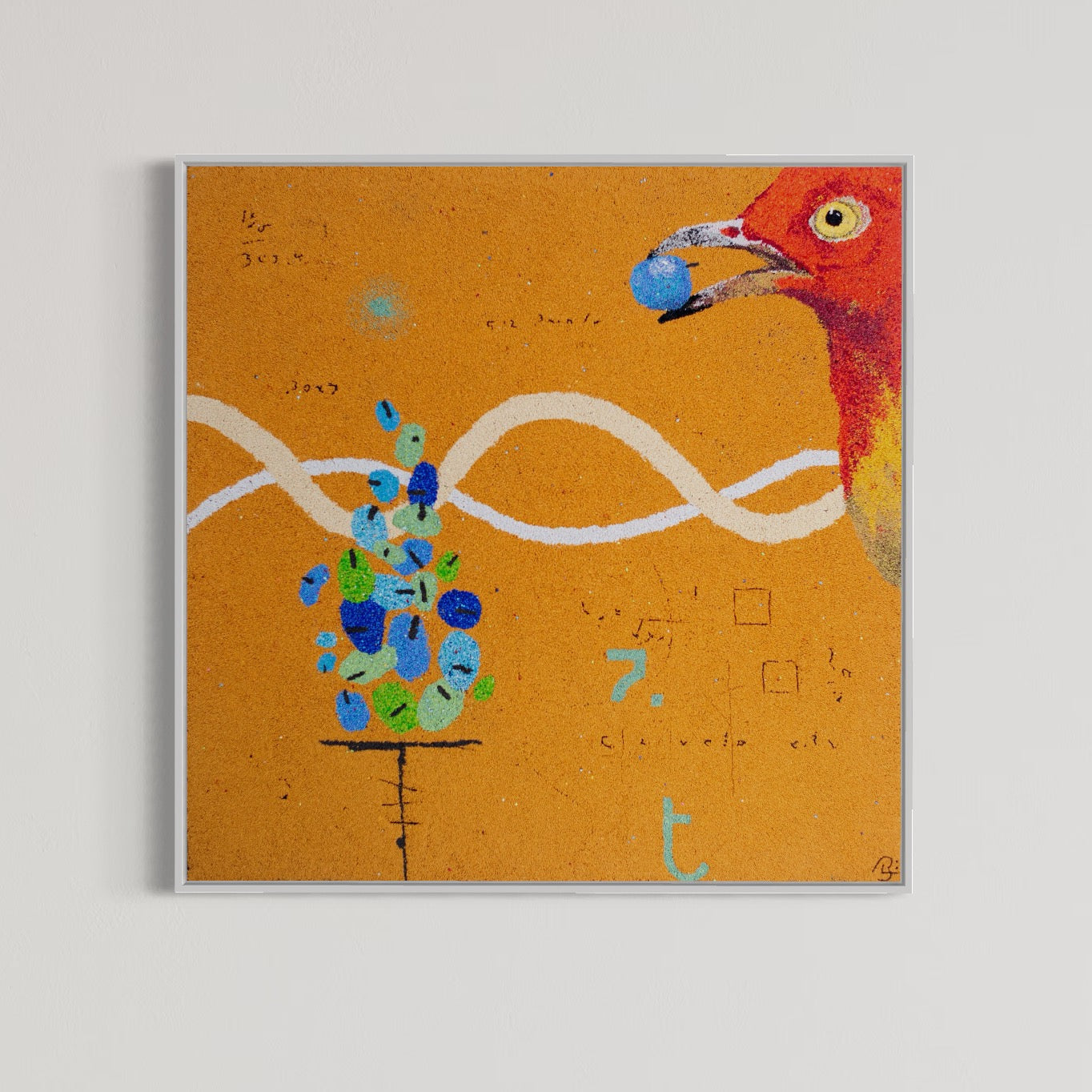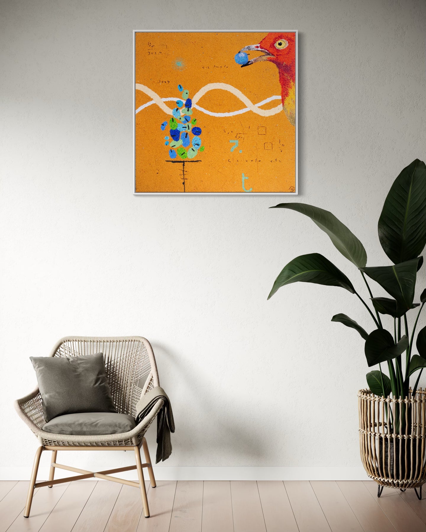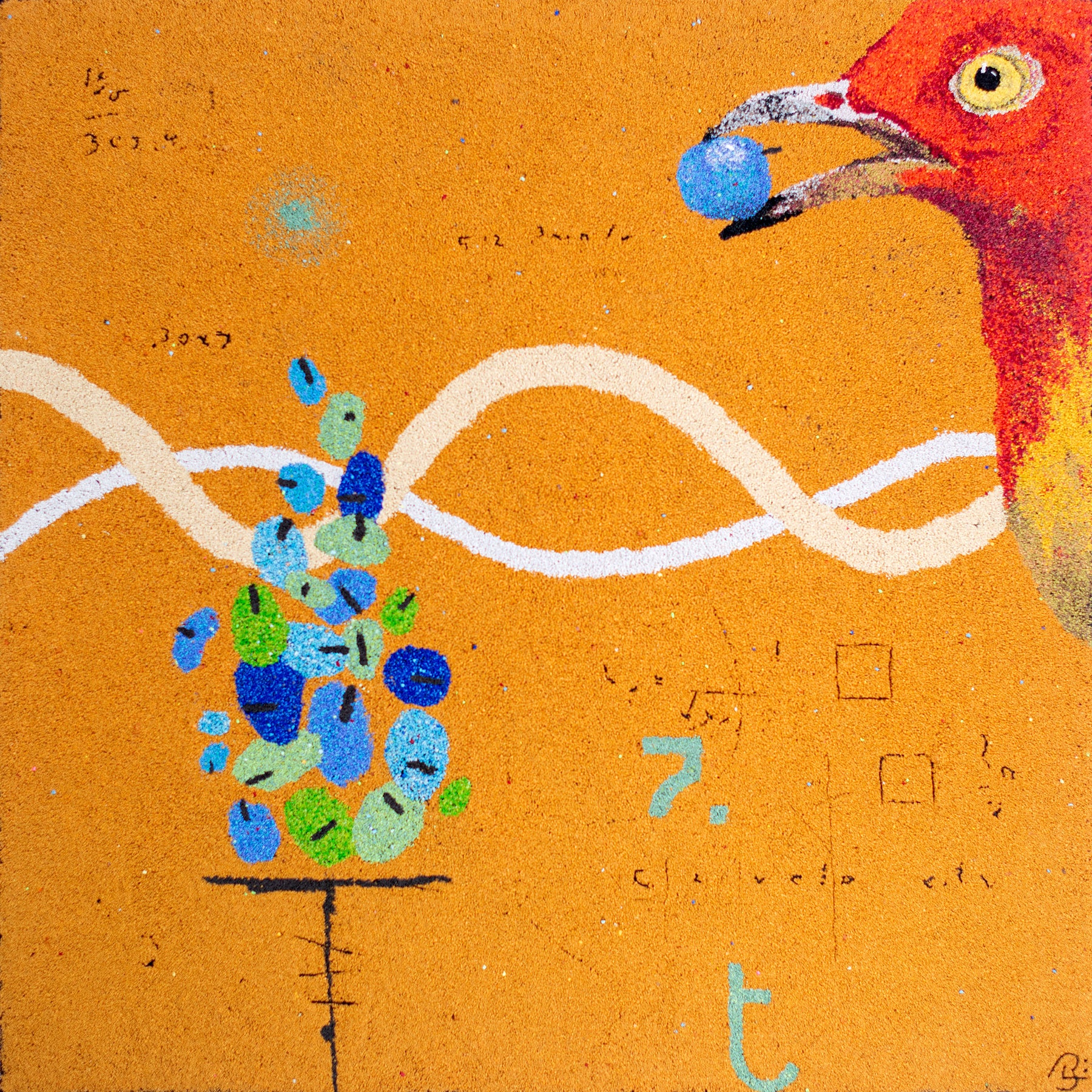 36"x36" abstract piece using crushed volcanic rock and acrylic paint with a bird and abstract forms over a yellow background.