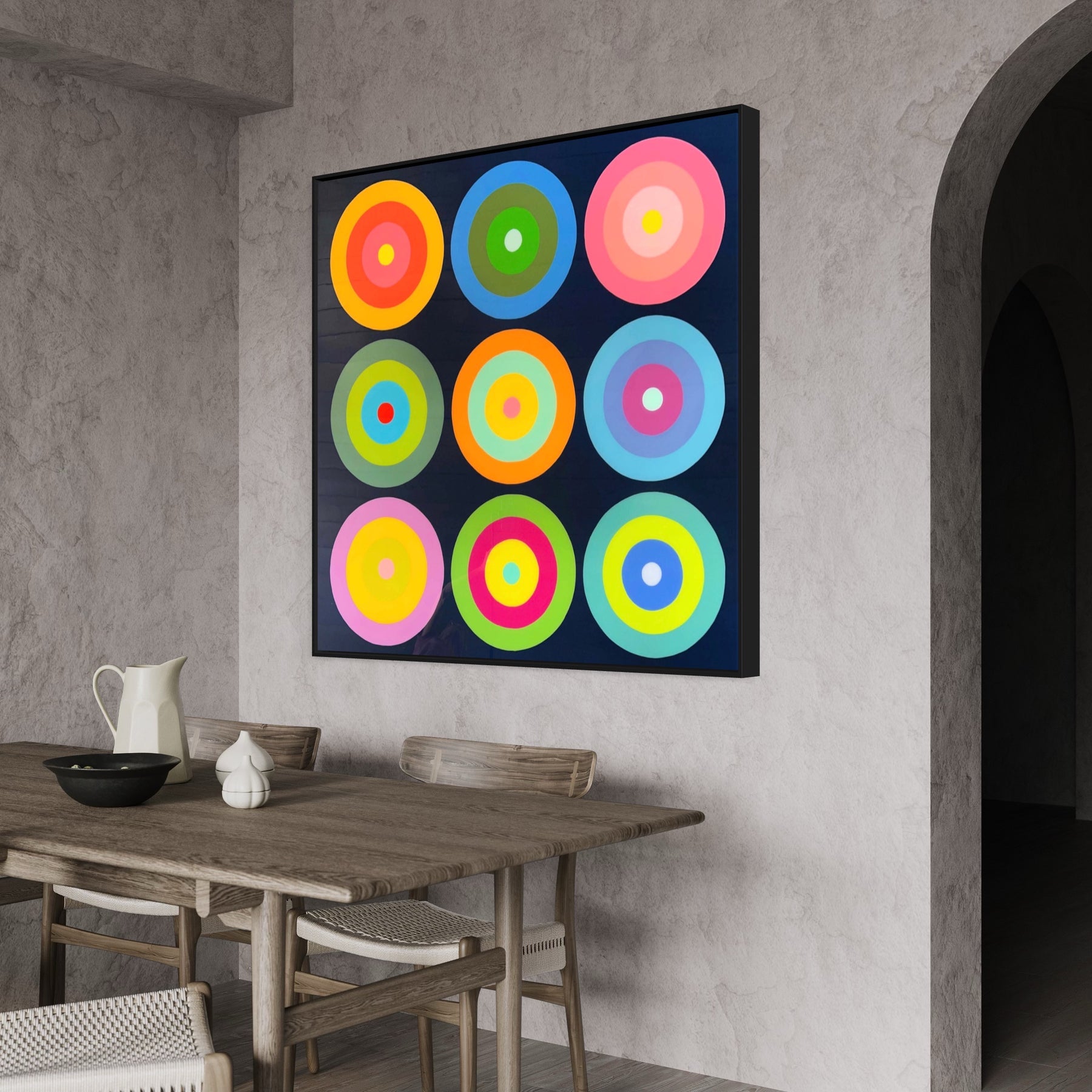 Obsessive Tendencies on Blue, artwork by Stephanie Henderson, displayed in a home. Acrylic and resin on wood panel. 48 by 48 inches.