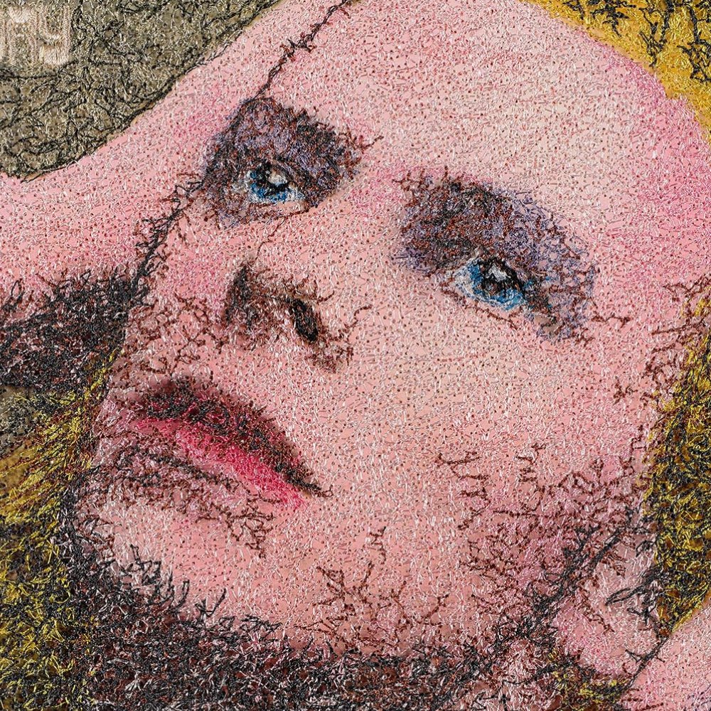 "I picked Hunky Dory as my third David Bowie album simply because I love the cover. It was Bowie's fourth album, the one that came out right before the Ziggy Stardust Album, and contains quite a few of his big hits like Changes and Life on Mars. The artwork is created in an ethereal pointillist style with a wash of pastel and earth tone colors. I embroidered this in a similar style to Bob Dylans Blood on the Tracks. over 100,000 tiny stitches of rayon thread stitched directly through the album cover." – Stephen Wilson