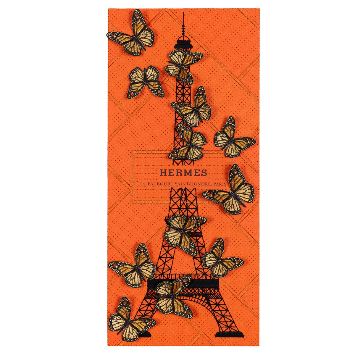 Unleash your inner luxury and sophistication with the Luxury Eiffel Tower. Each piece is crafted with intricate embroidery, using tonal thread to create a stunning background. The iconic Eiffel Tower is then delicately embroidered on top, adding an extra layer of elegance. And to complete the masterpiece, embroidered butterflies are added in relief to the tower, available in natural or tonal colors. Elevate your style with this exquisite piece.
