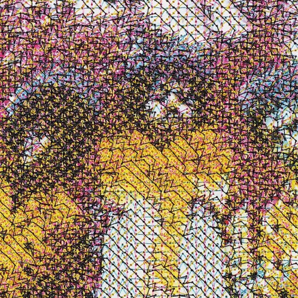 "Are You Experienced was Jimi Hendrix’s debut album that was released in 1967. The album was an instant commercial and critical success and over the years has sold over 5,000,000 copies. As a guitar player growing up, Jimi Hendrix was a huge inspiration and I probably wore out multiple copies of this album trying to learn every song. Since the album cover was created in a psychedelic style with fish eye lens photography and bubble letters I decided to do something psychedelic. I created the album art using four color process threads. Essentially the entire album was stitched in cyan, magenta, yellow and black with the lettering created separately, hand trimmed and mounted later. The different thread colors mold and intertwine together to create a psychedelic overlay." – Stephen Wilson