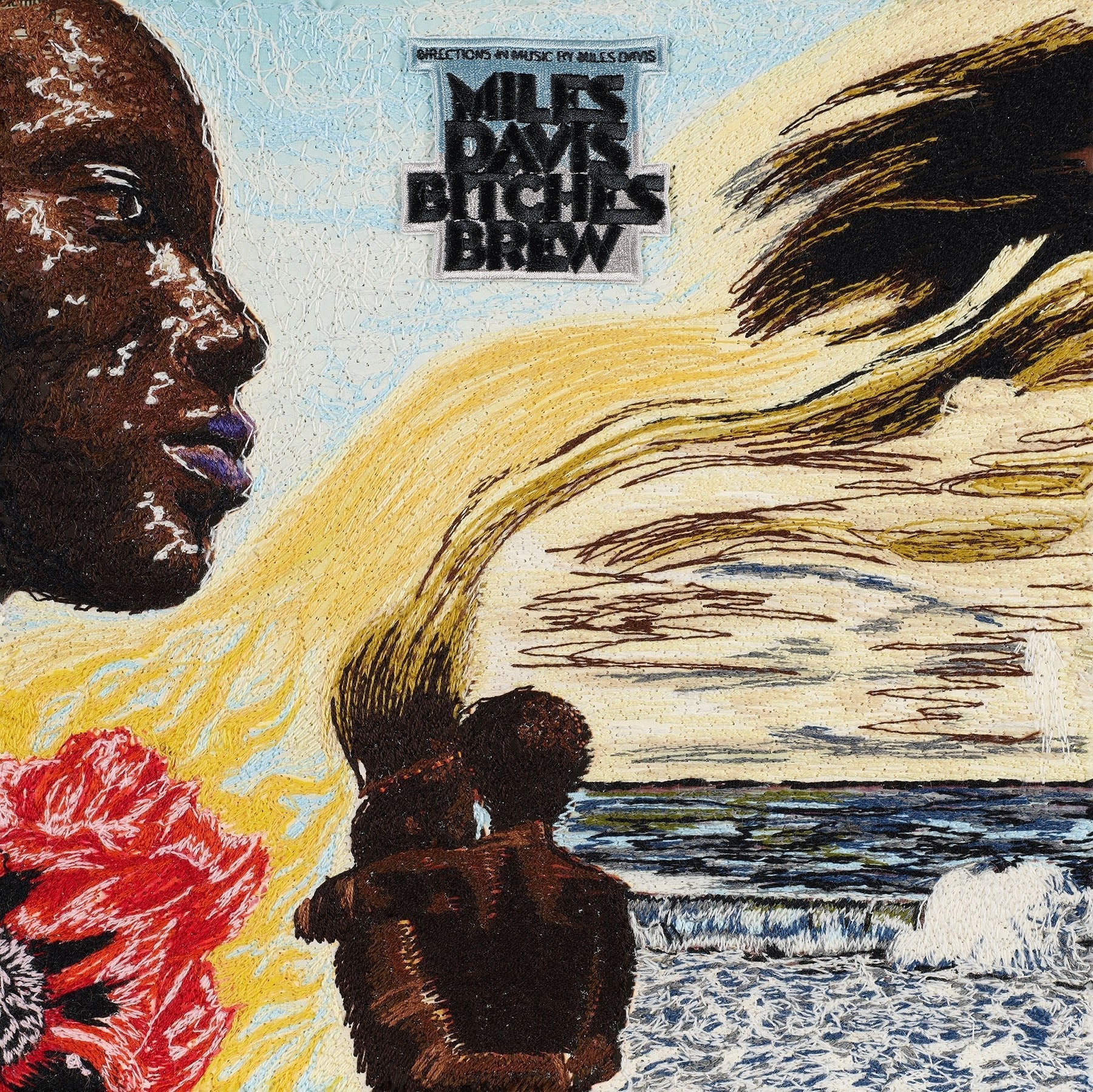 "Miles Davis is a jazz icon that went through a lot of different musical phases during his storied career. From traditional jazz to explosive jazz fusion. For my first Miles Davis album I chose Bitches Brew, his 1970 release. The album cover is a painting with multiple focal points. There is a couple on the beach, swirling clouds, a giant flower and a face in profile. I embroidered the whole cover using wool thread in varying stitch lengths and densities. The album title was created as a gradient patch and mounted onto the album." - Stephen Wilson