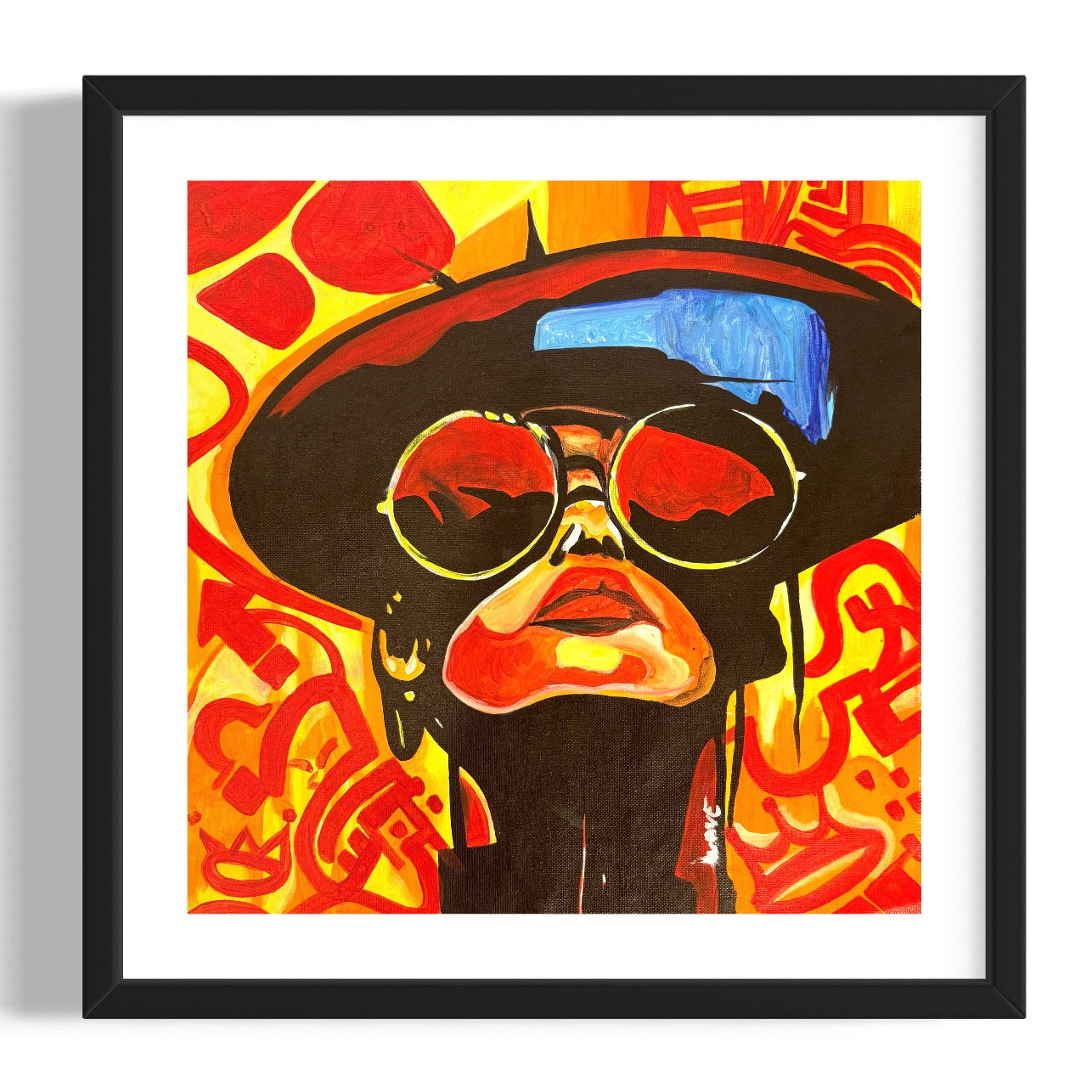 bright pop art portrait glasses hat color block style face looking upwards with bright patterns in red orange yellow